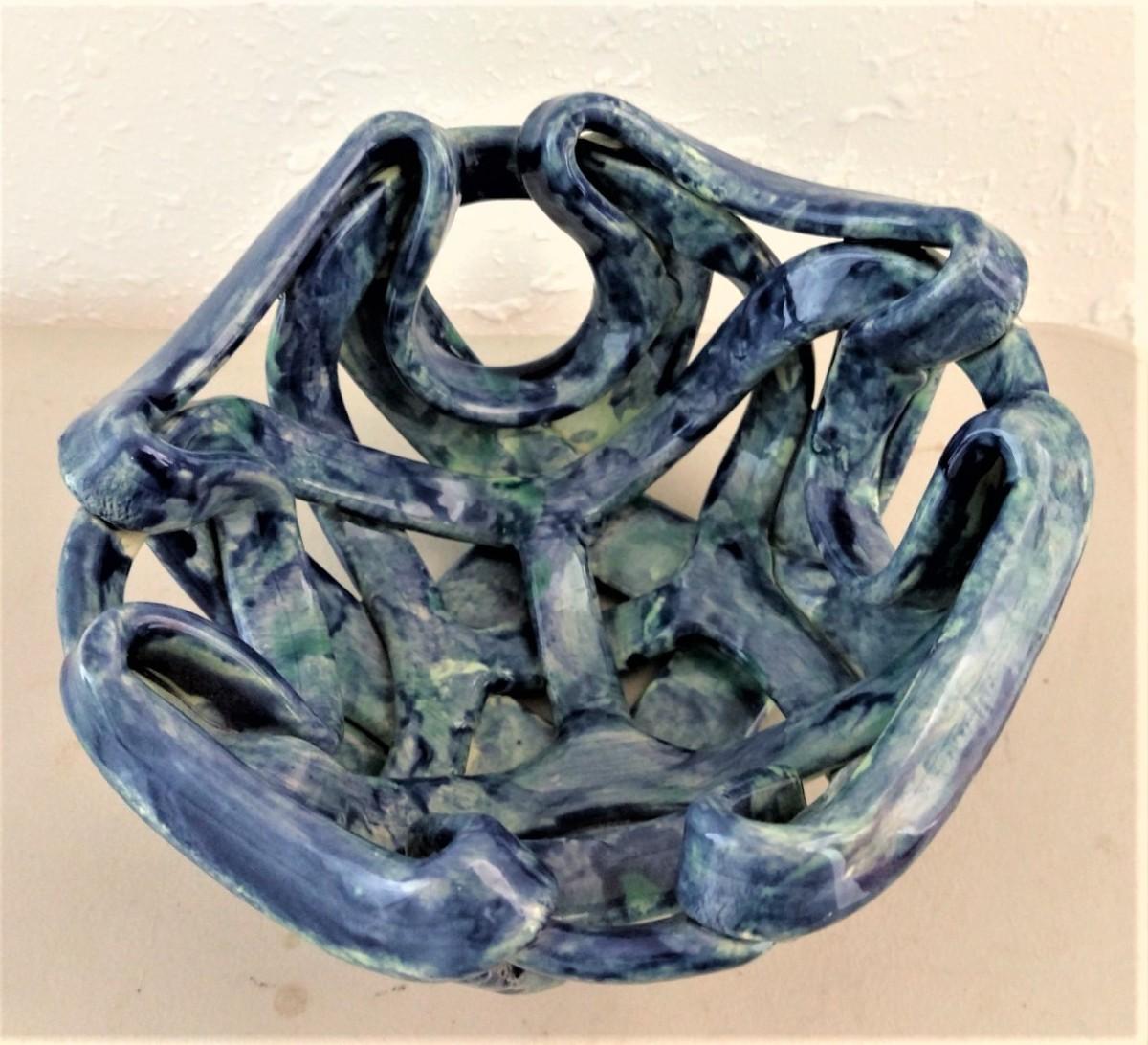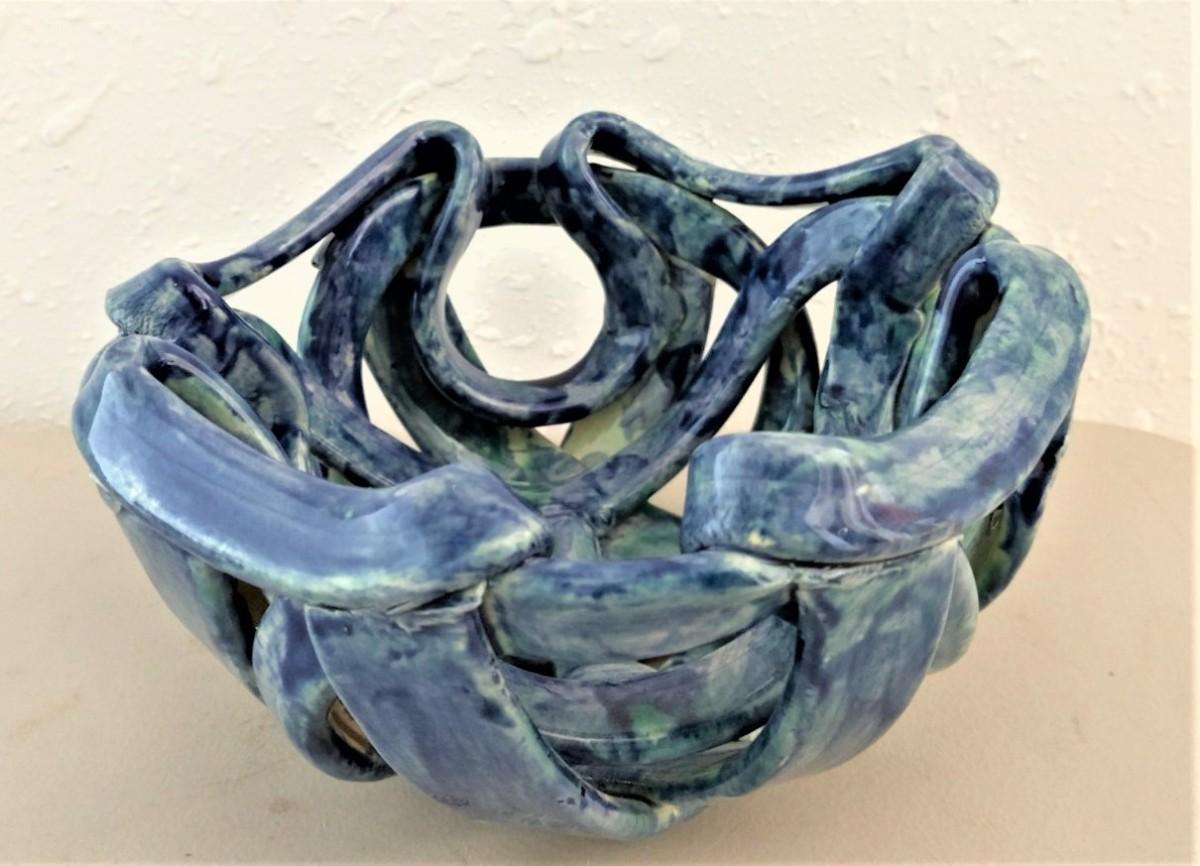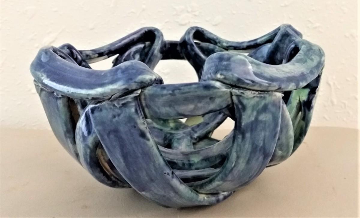 Hand Made Pottery Flower Basket Ribbon Weave 8"x5"
