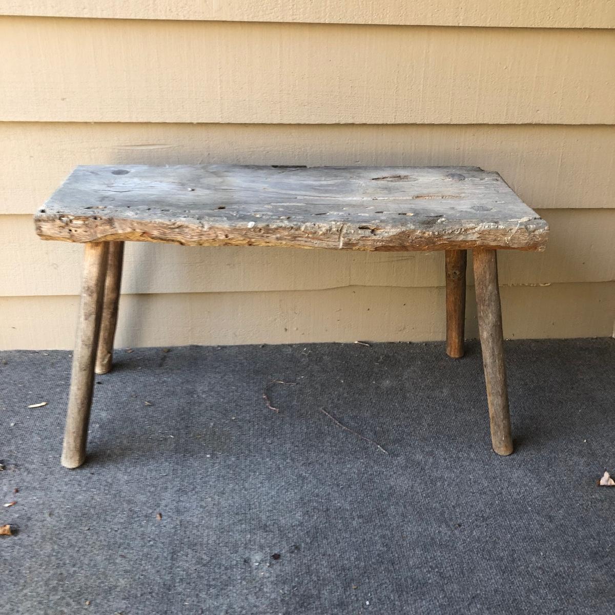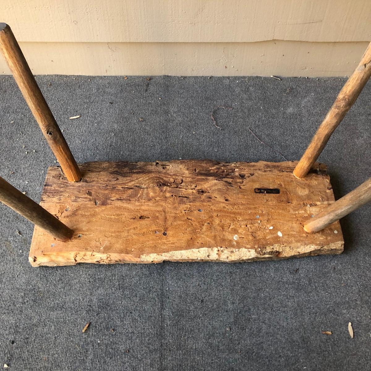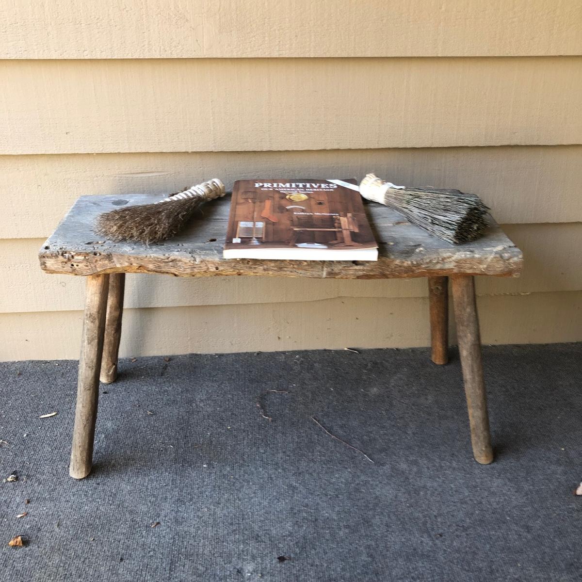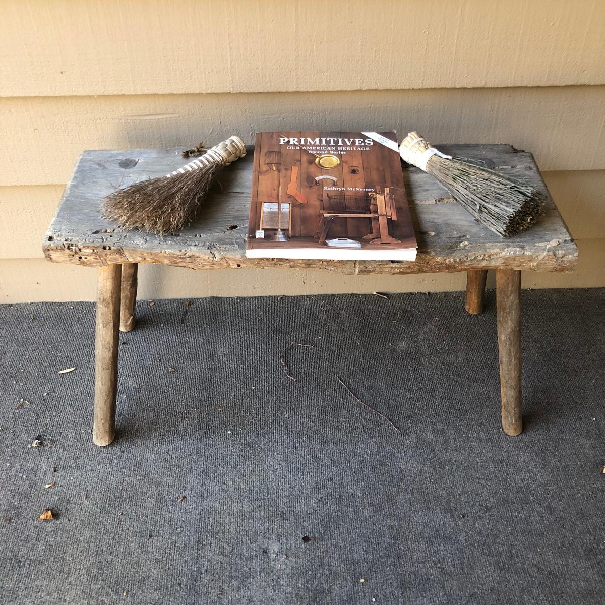 Lot includes a Tom Tucker hand made primitive bench, two whisk brooms and a book on primitive furniture. Bench measures 10.5” x 27” x 16”.