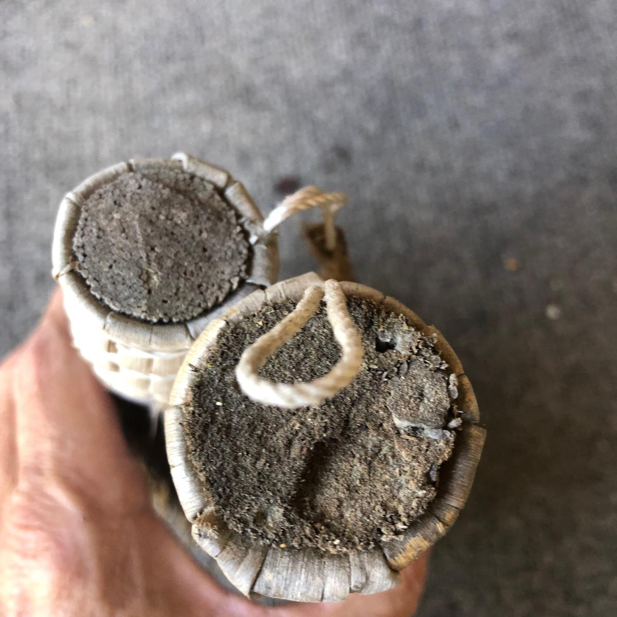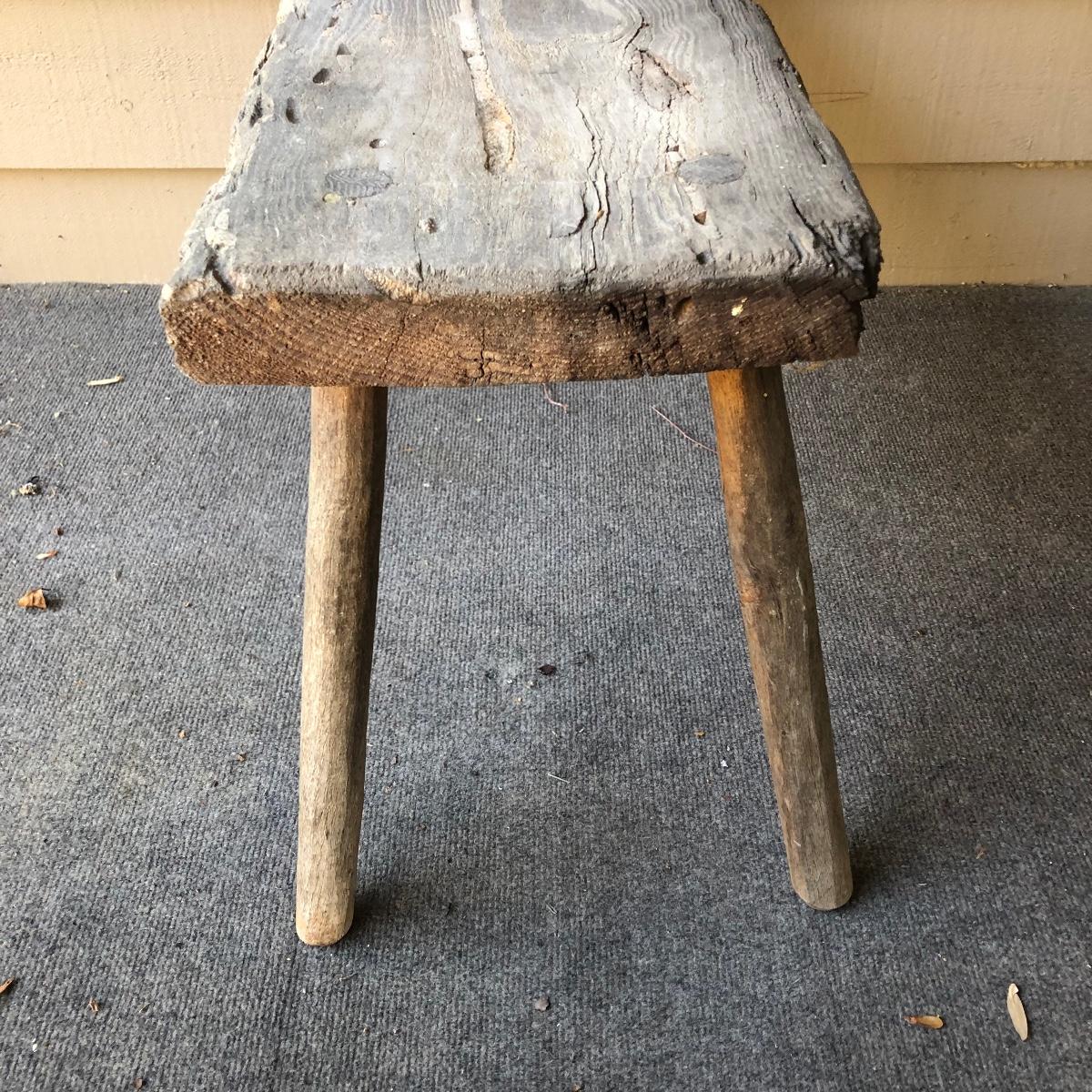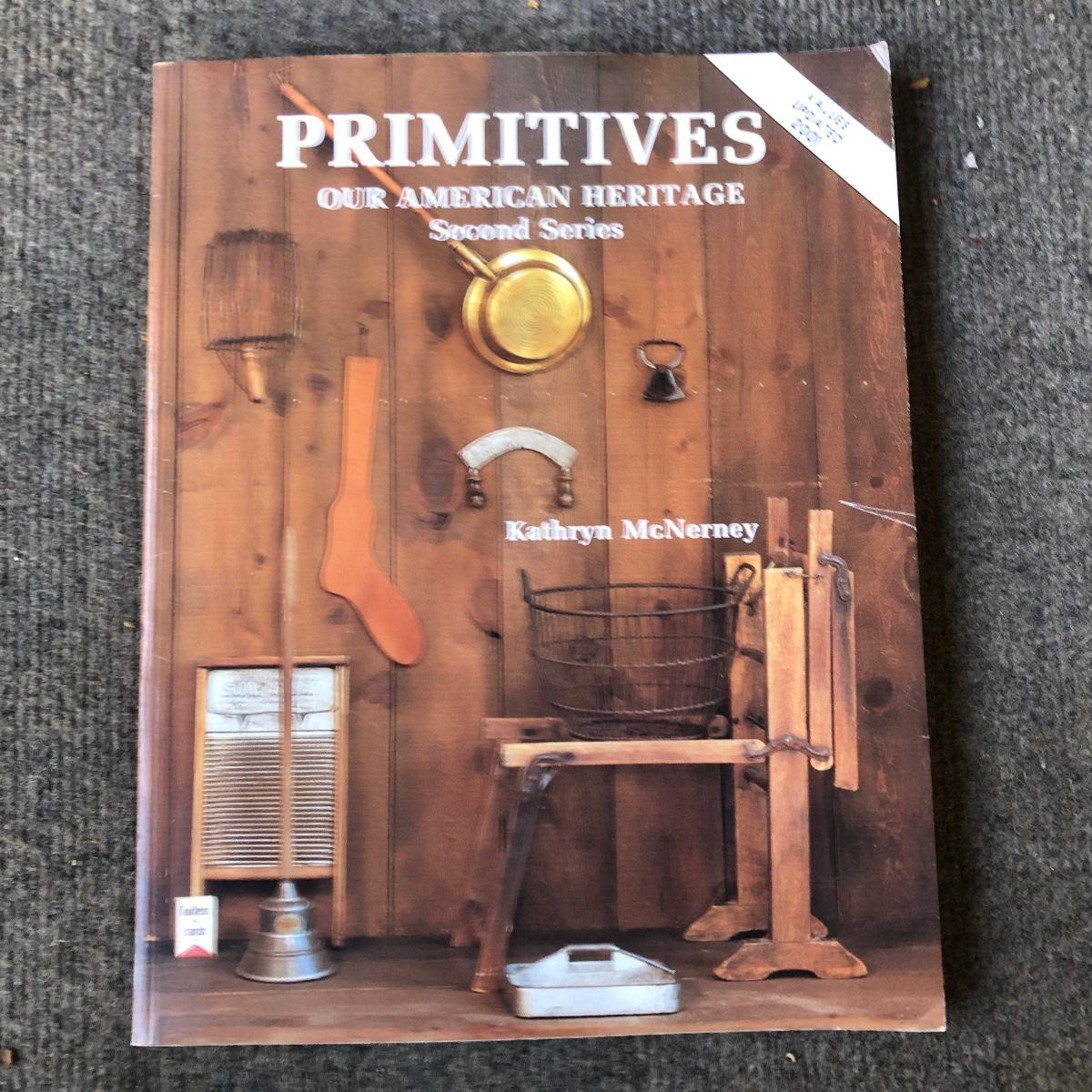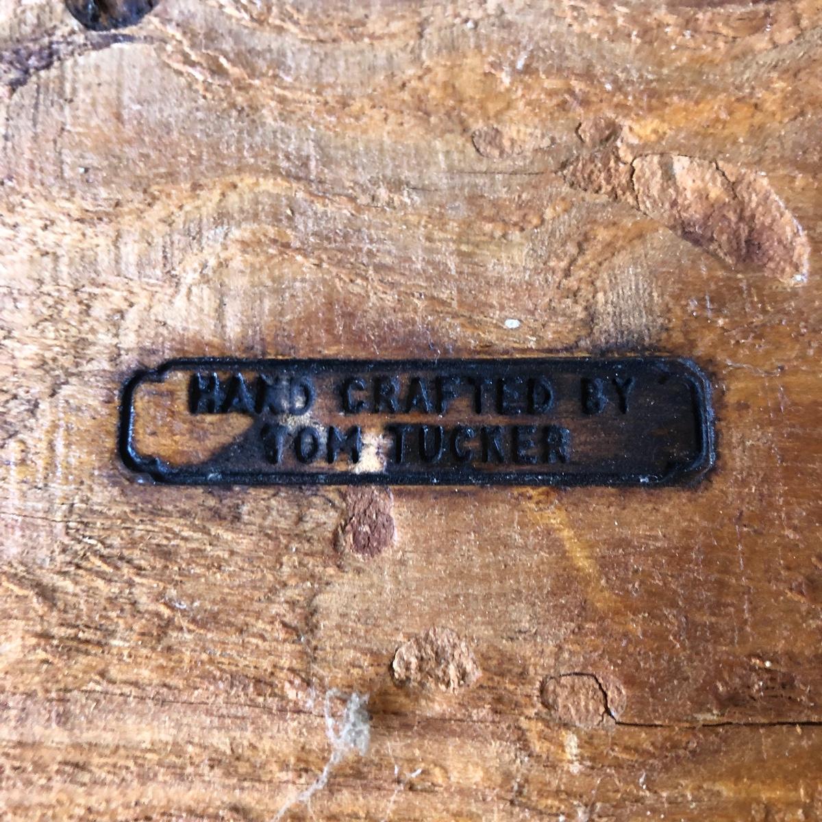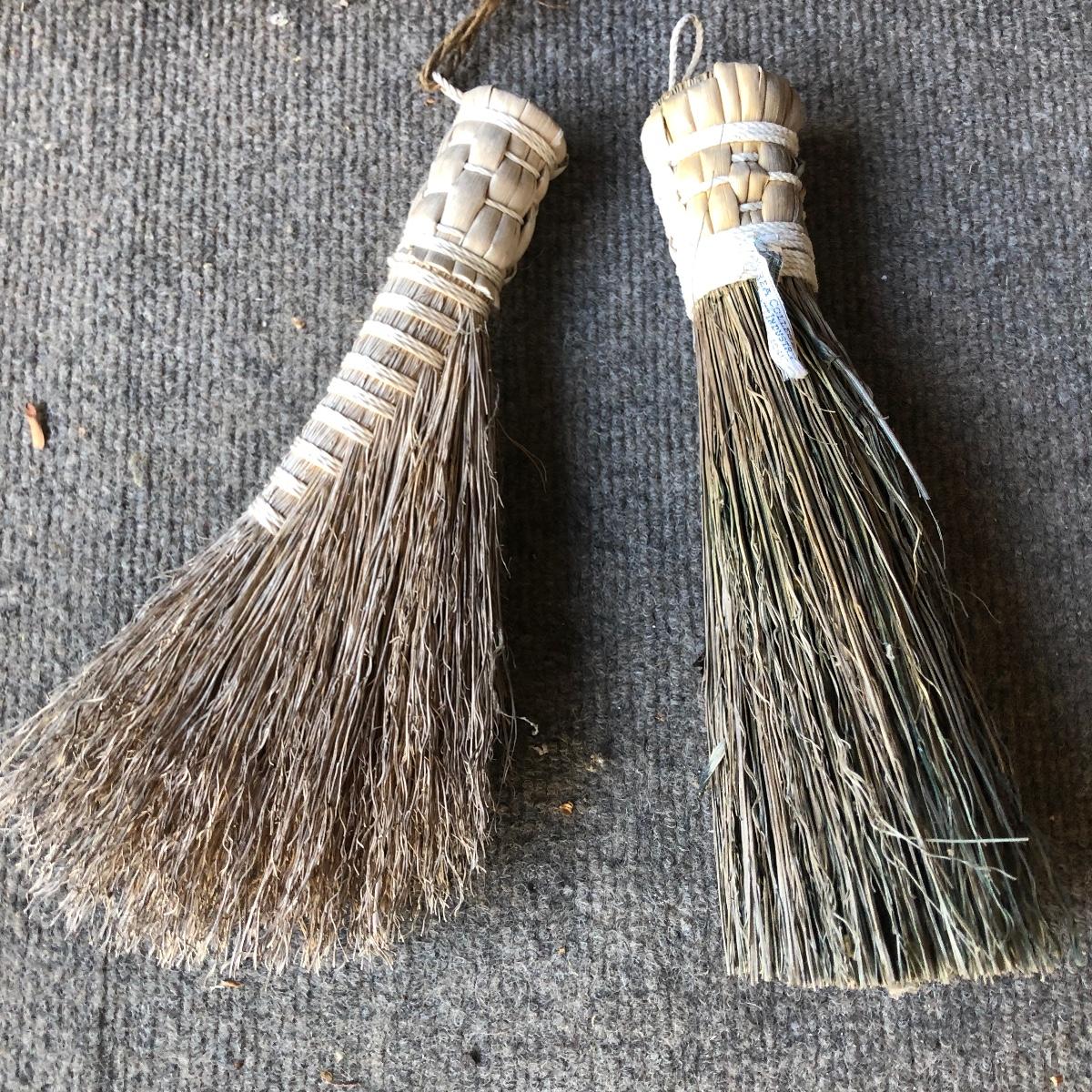 Lot includes a Tom Tucker hand made primitive bench, two whisk brooms and a book on primitive furniture. Bench measures 10.5” x 27” x 16”.