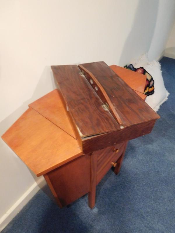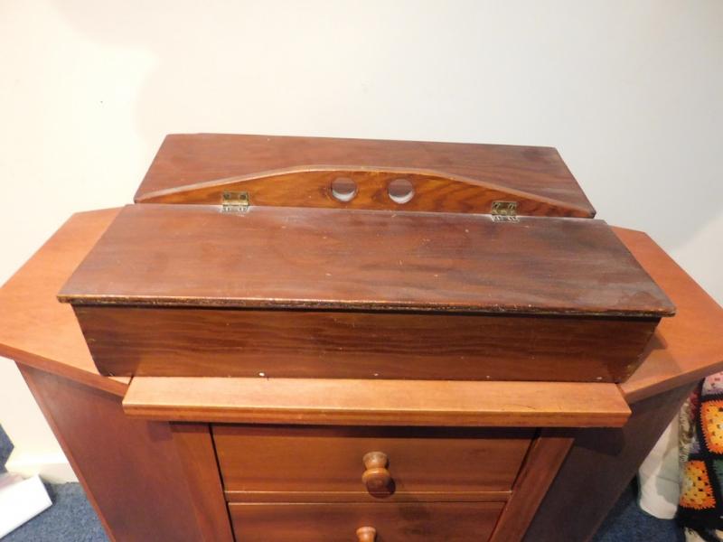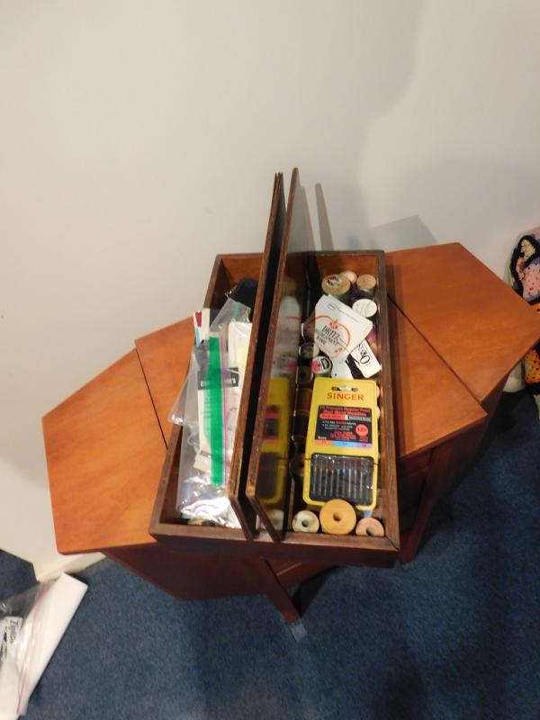 Hand Made Sewing Box with Double Lids and Contents (Washington Sewing Cabinet not included). One hinge has come loose.
