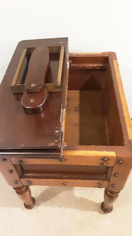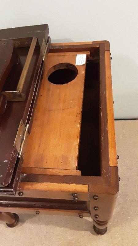 Really unique piece, Hand made by Ernest Bus Irving 1930's shoe shine box with brass fire pull under the foot rest. slide lid, comes with shoe shine contents