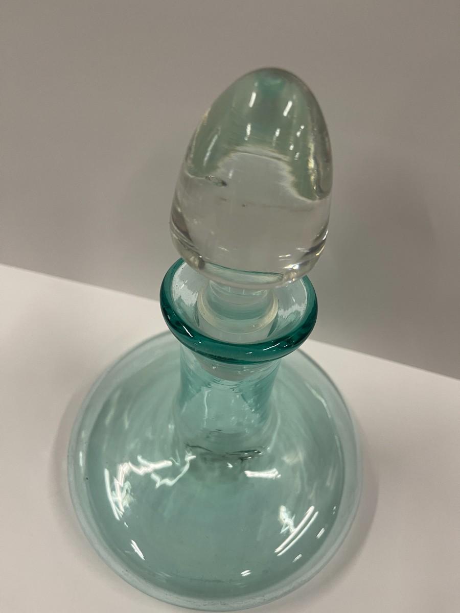Hand made turquoise glass decanter. Doesn't have the original stopper. 6" to top of decanter without stopper