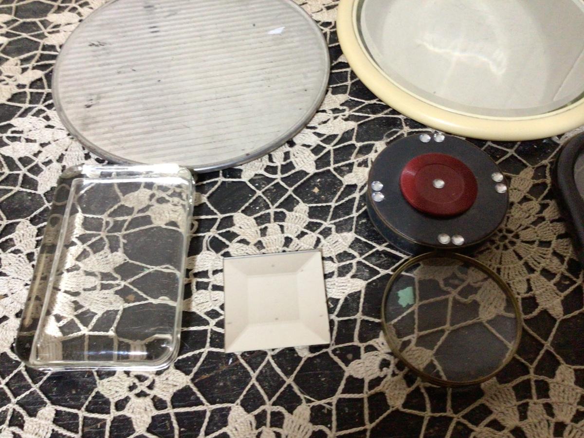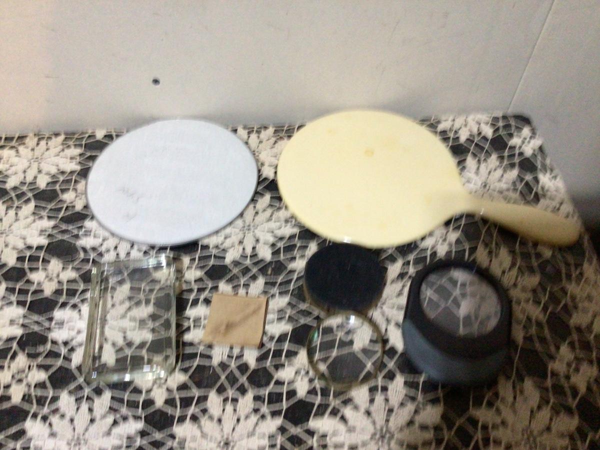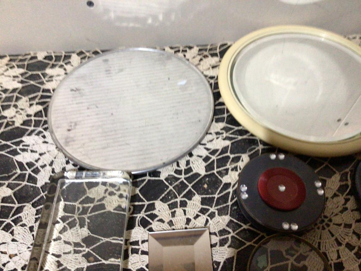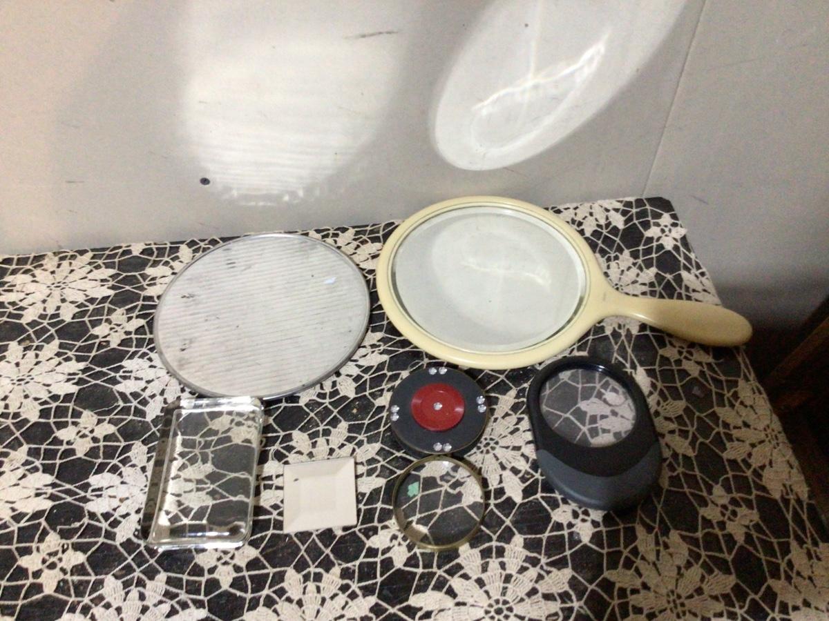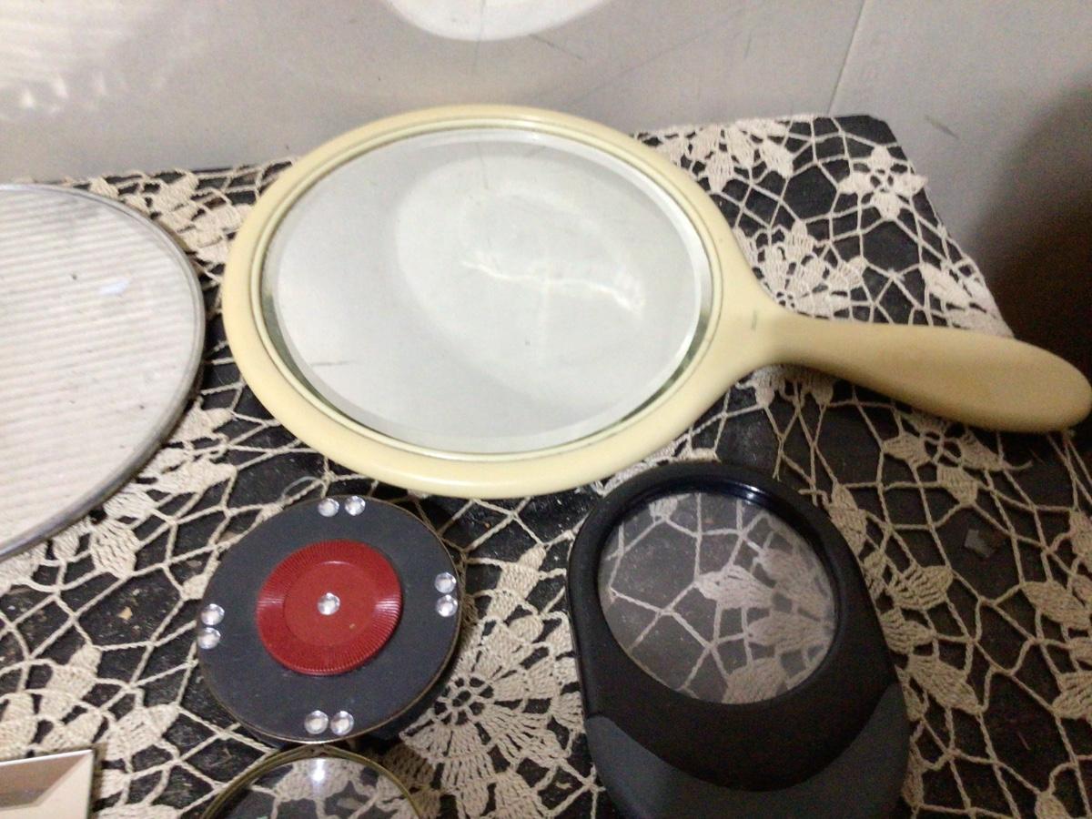 You get a nice hand held mirror. And small square mirror plate. You also get three magnifying glasses. One is all glass, one is modern with plastic handle, and one is vintage folds into round case that when folded open the case is the handle.