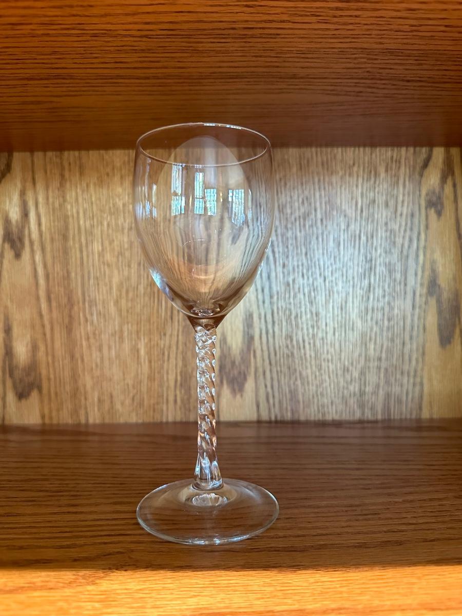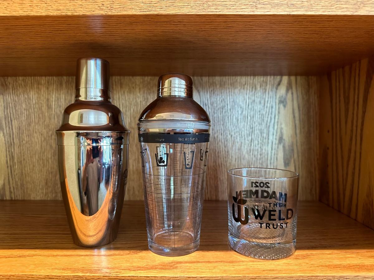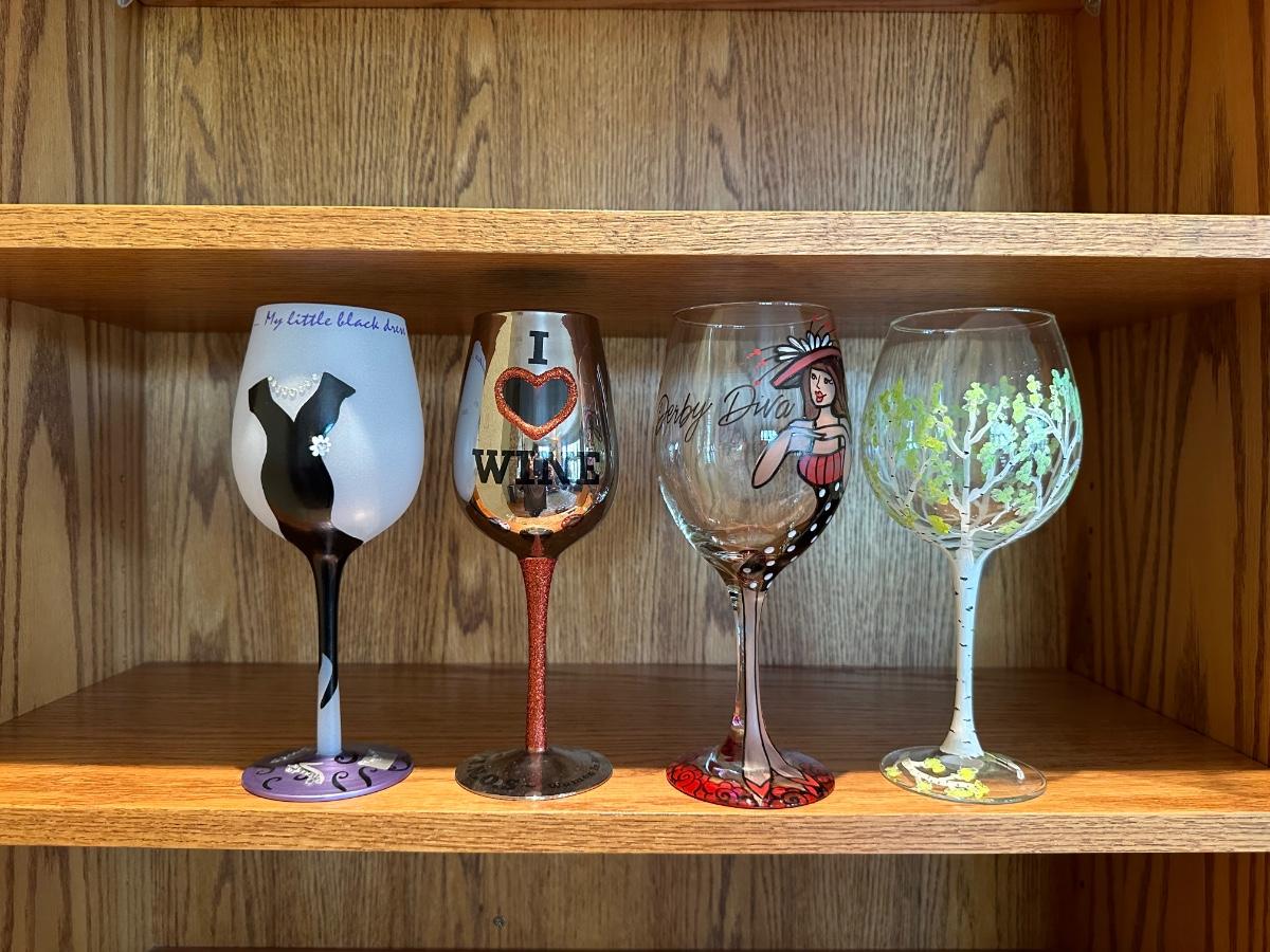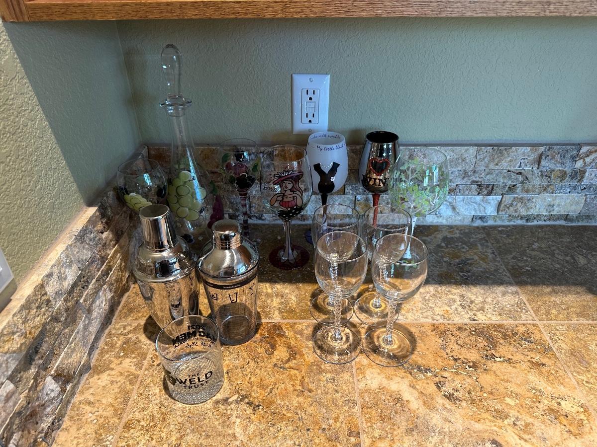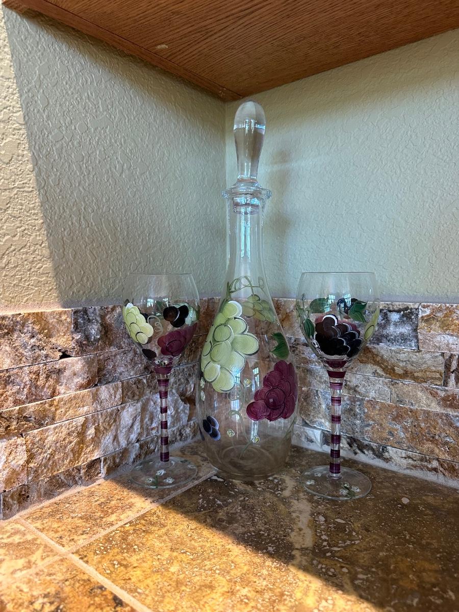 HAND PAINTED DECANTER, MARTINI SHAKERS AND STEMMED GLASSES