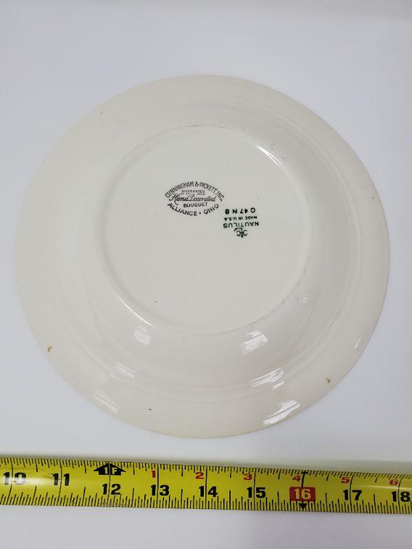 Makers mark stamped on back, has been used and shows signs of such, no cracks, chips or breaks. Approximately 8.5in in diameter.