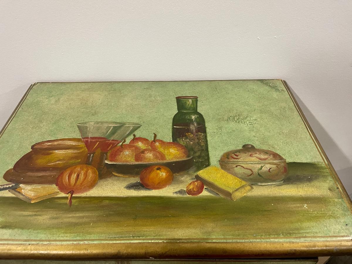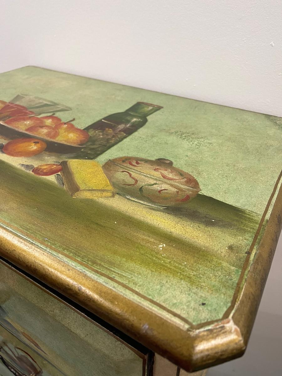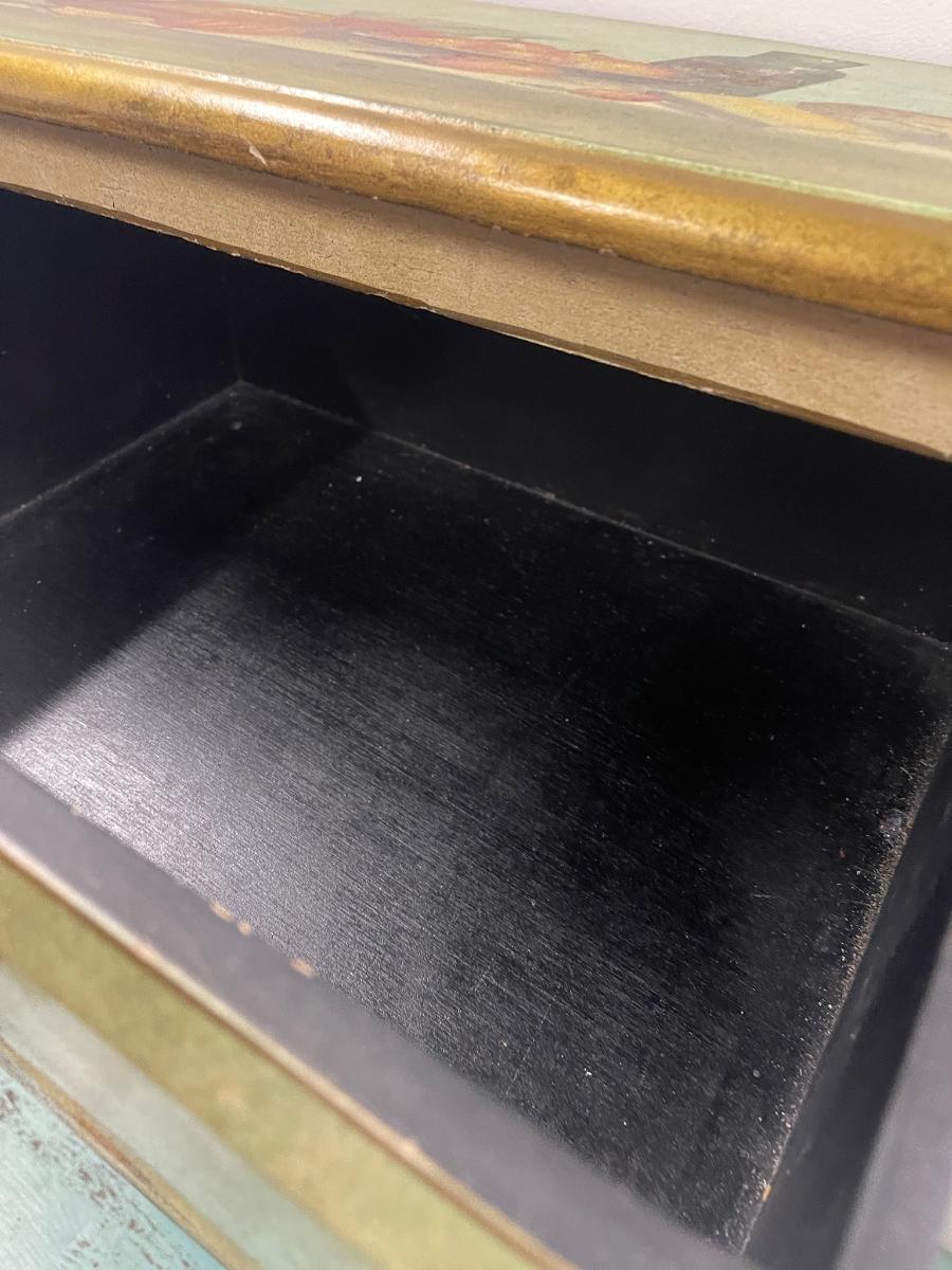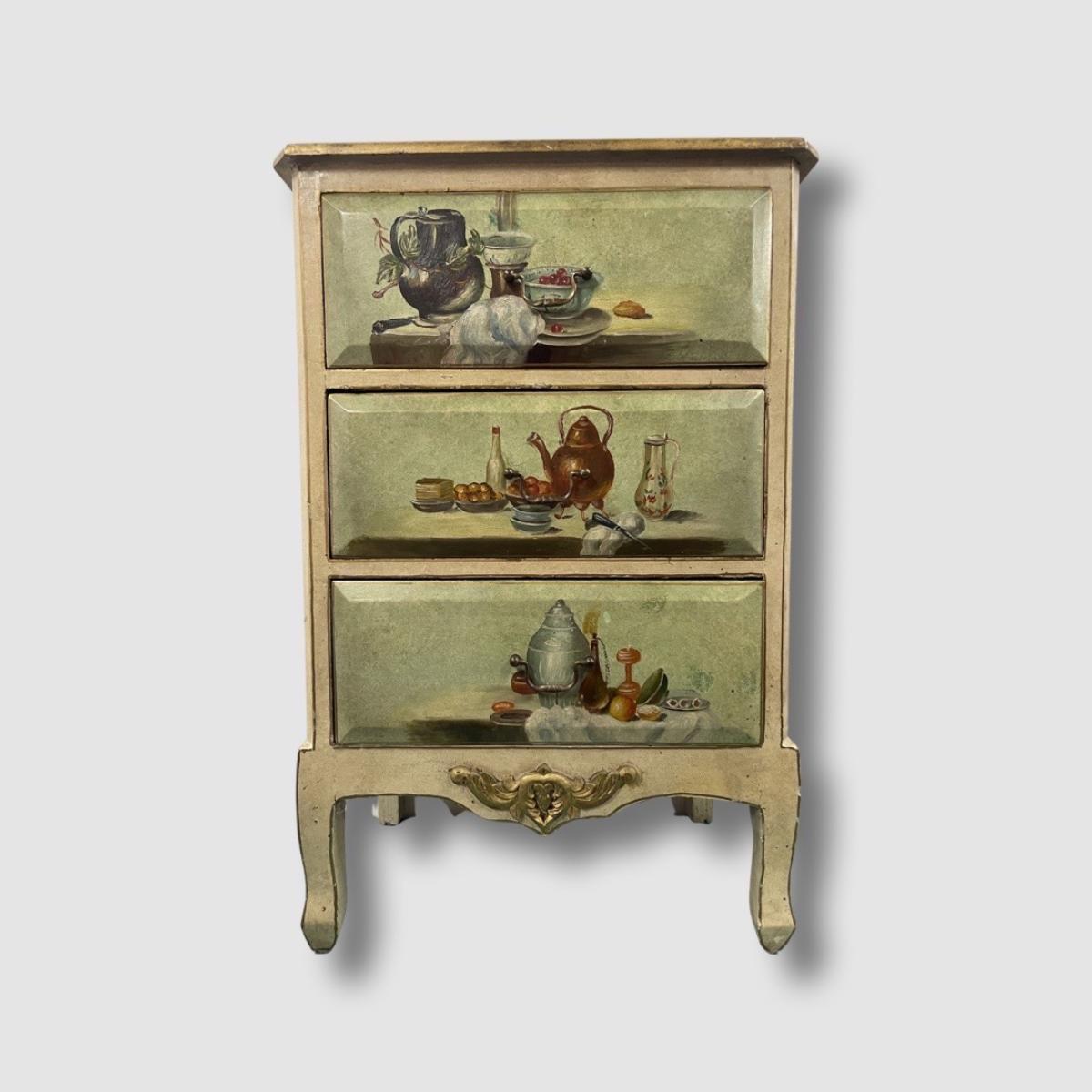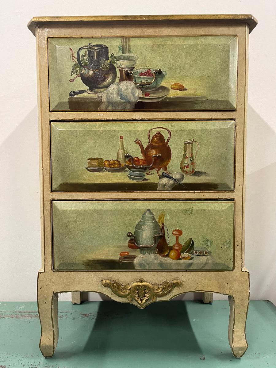 Hand painted 3 drawer chest. Good condition with some obvious dings and dents as shown. 14 1/2" deep x 33 1/4" high x 20 1/4" wide. # 1005