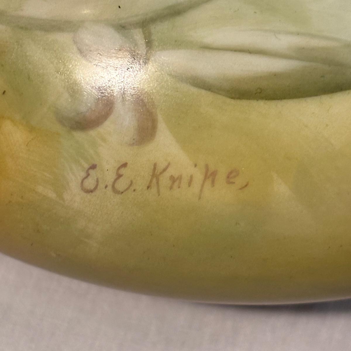 This American Belleek Porcelain flat vase was hand painted by E.E. Knife. The approximate measurements are 7"D x 5"H. Blemishes on paint on the rim of the vase. See pictures for reference.