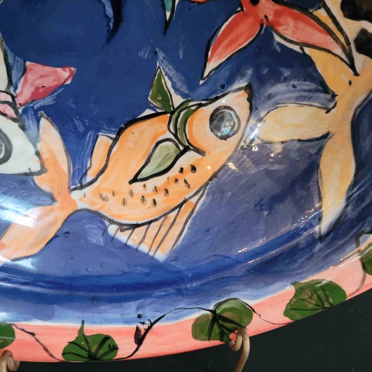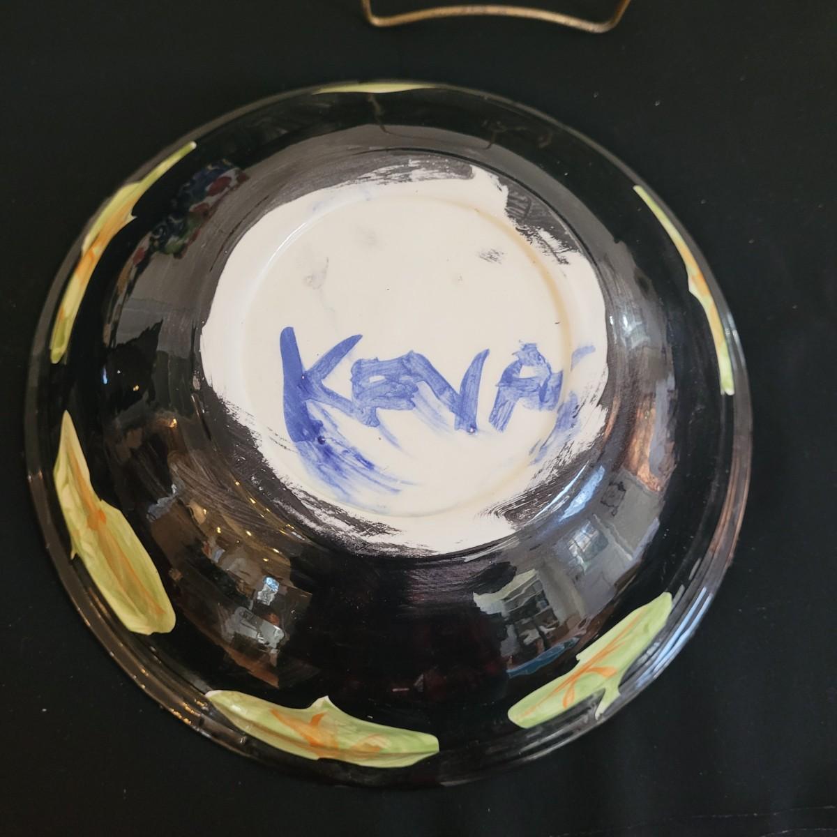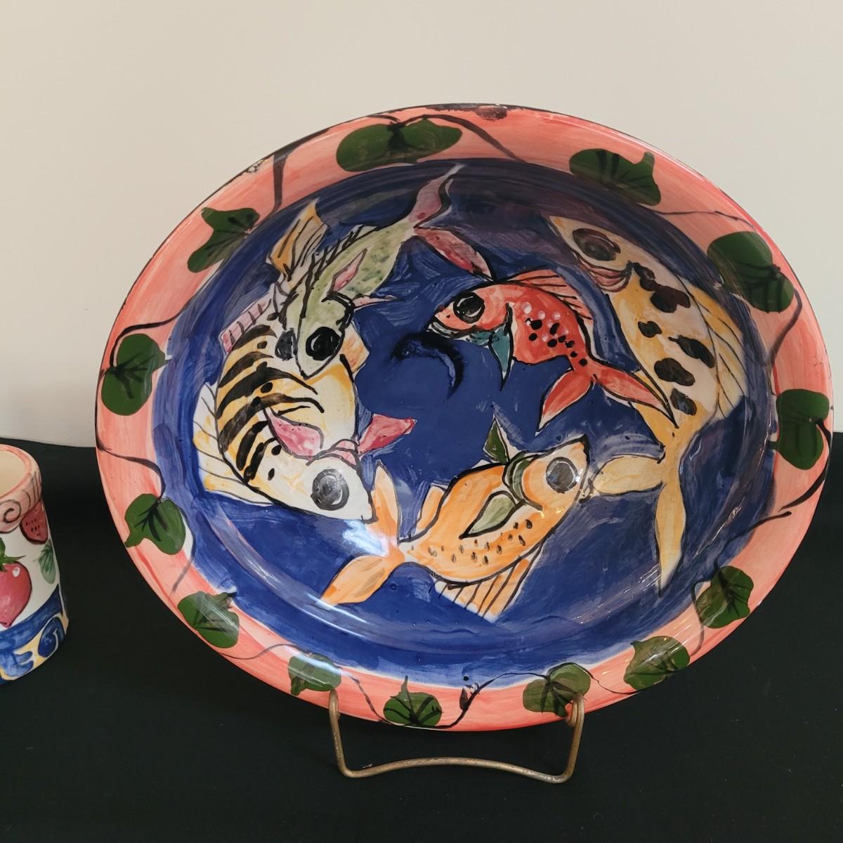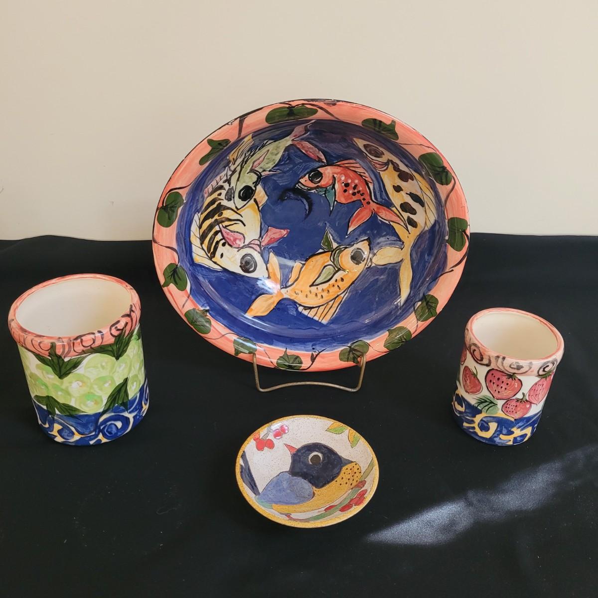 This lot includes a large platter, serving bowl and two jars all signed by the same artist, as well as a signed small bowl. Large bowl measures approximately 14”D, the platter is approximately 18.5” x 15”. The gold-colored metal stand is included in the lot. Shipping available.