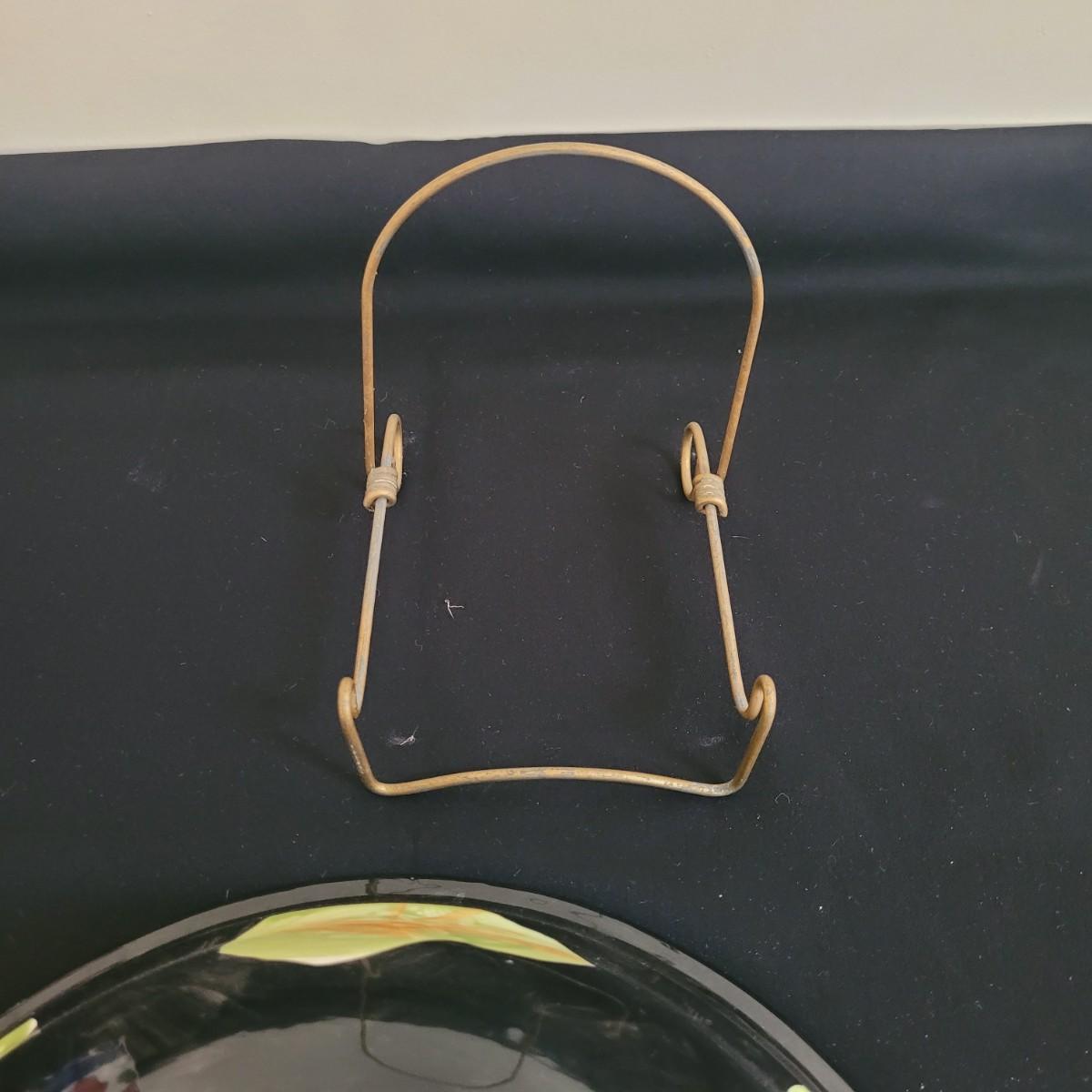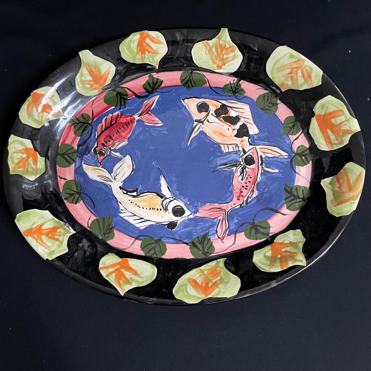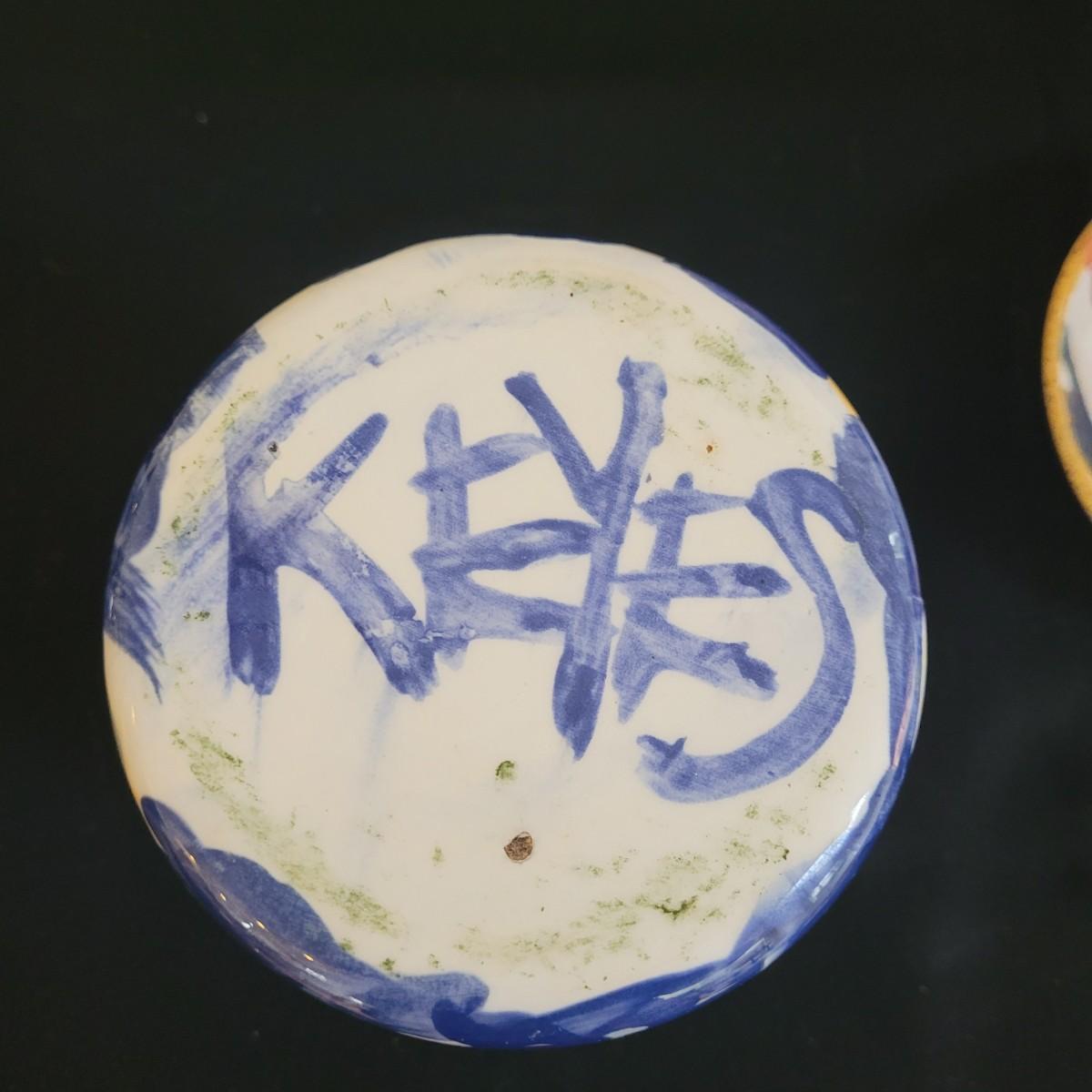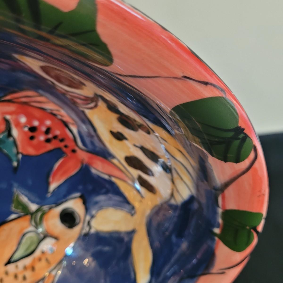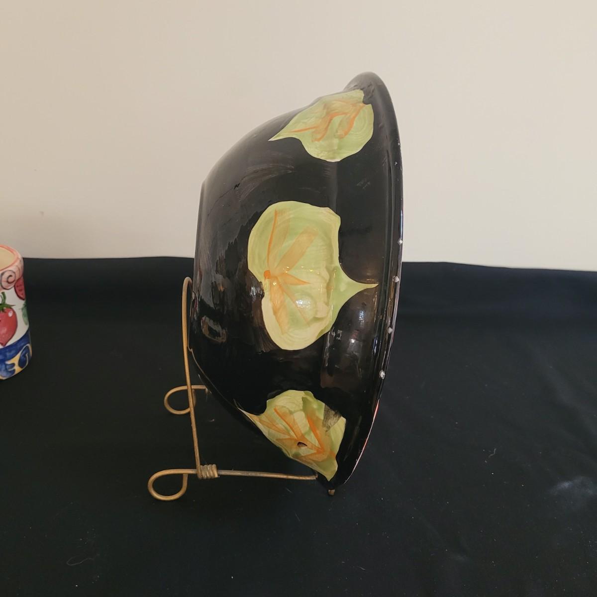 This lot includes a large platter, serving bowl and two jars all signed by the same artist, as well as a signed small bowl. Large bowl measures approximately 14”D, the platter is approximately 18.5” x 15”. The gold-colored metal stand is included in the lot. Shipping available.
