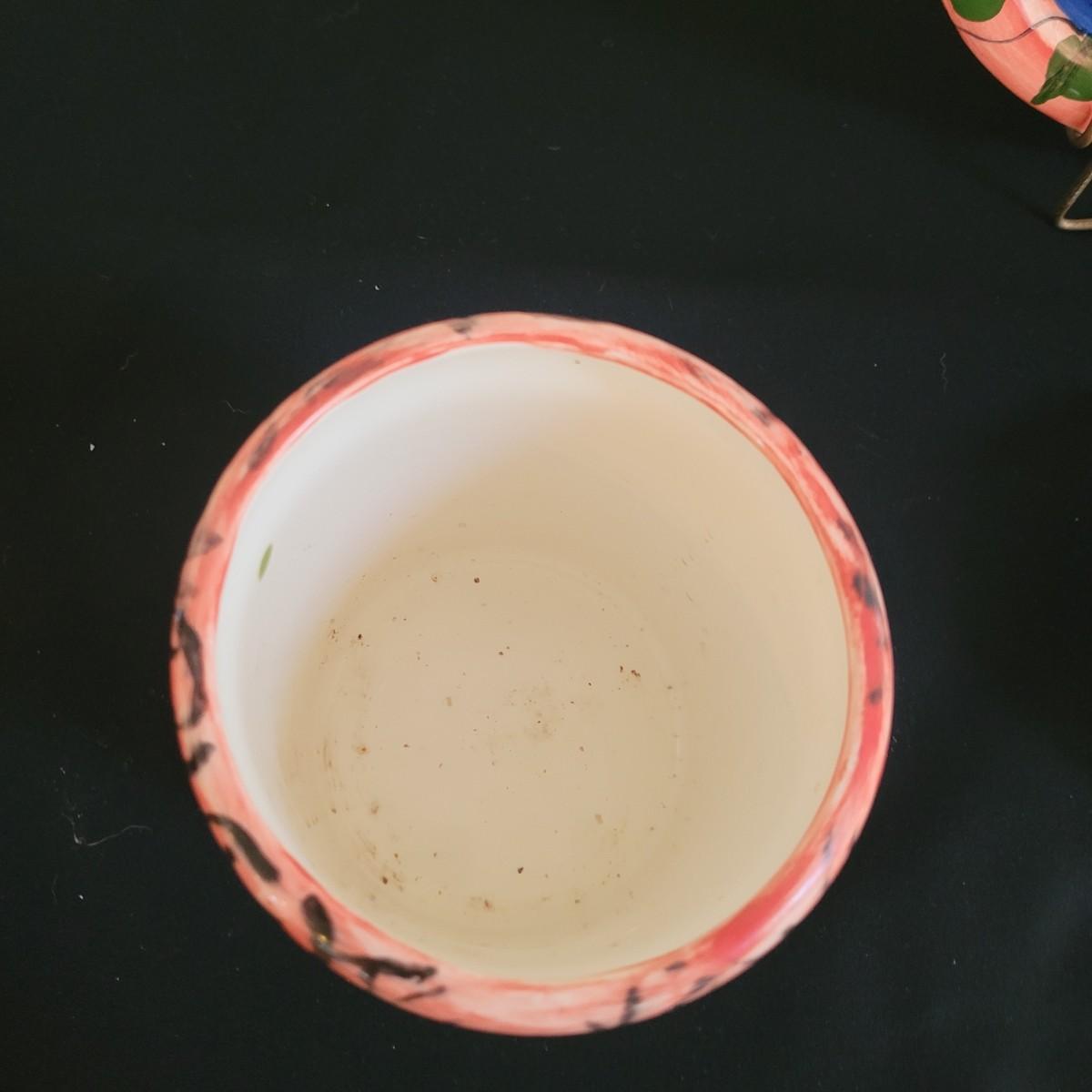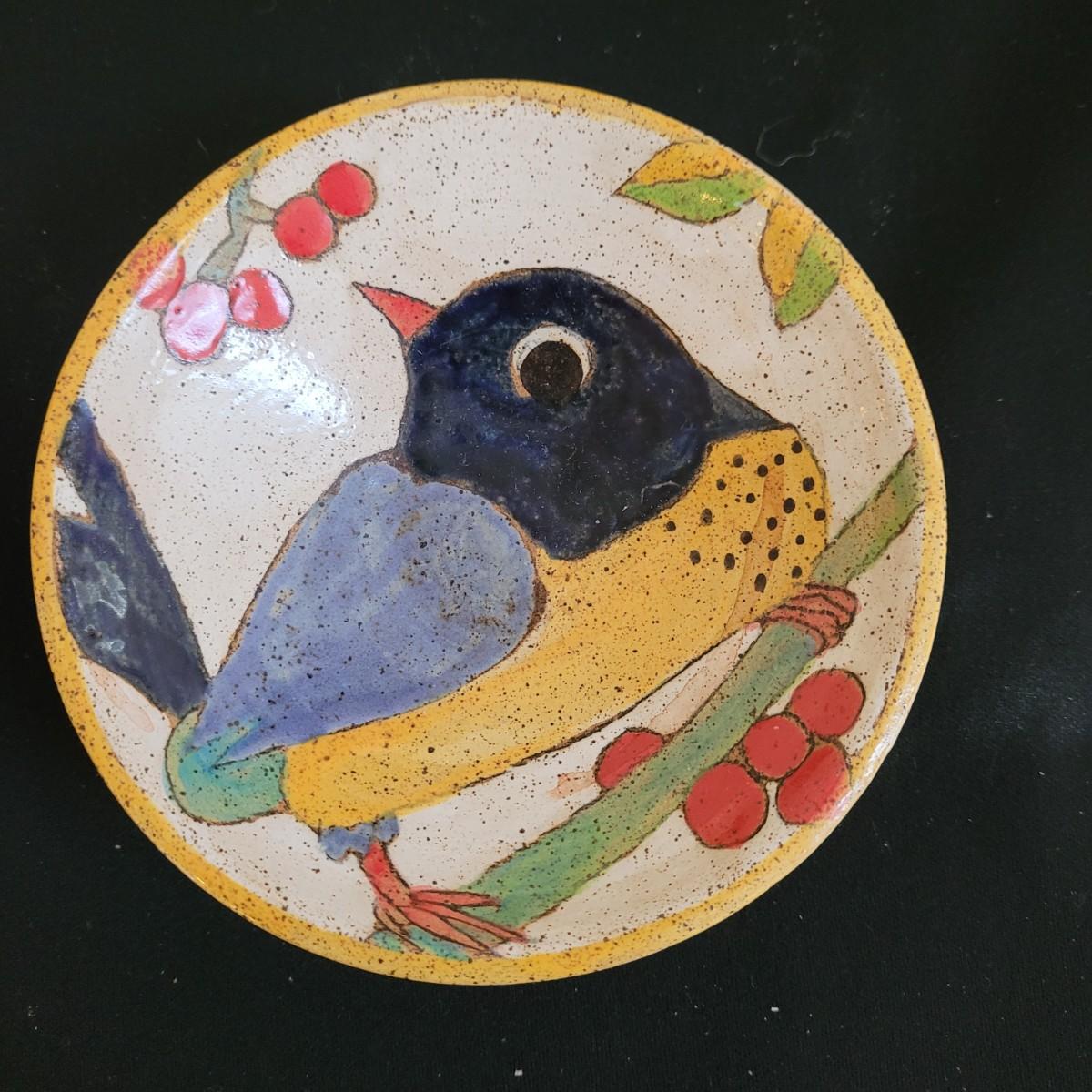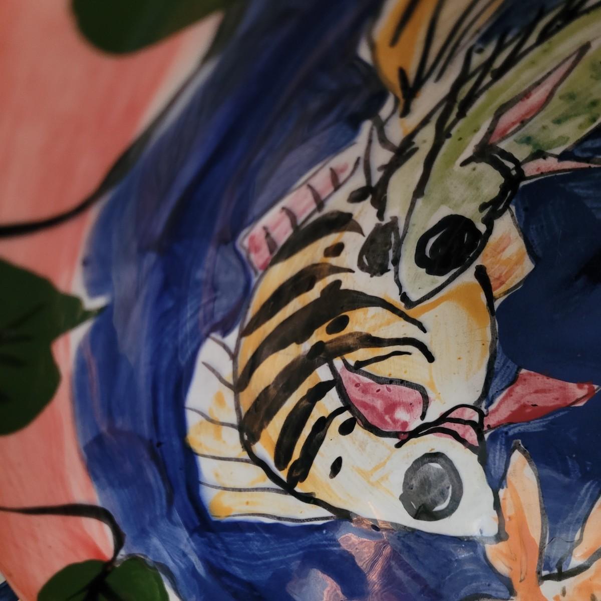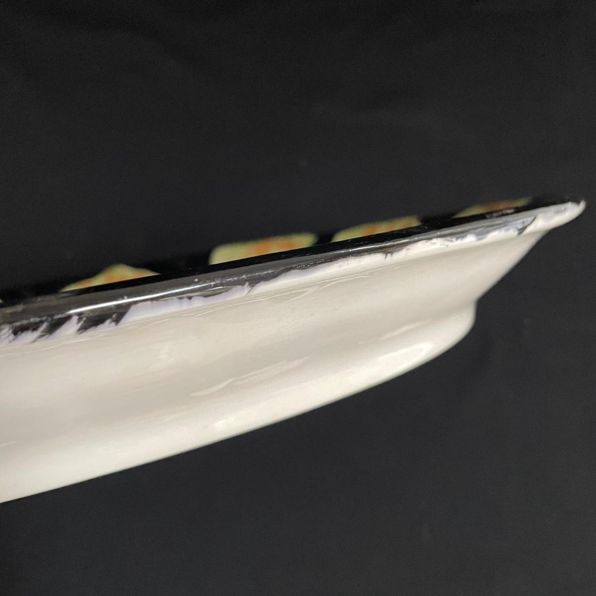 This lot includes a large platter, serving bowl and two jars all signed by the same artist, as well as a signed small bowl. Large bowl measures approximately 14”D, the platter is approximately 18.5” x 15”. The gold-colored metal stand is included in the lot. Shipping available.