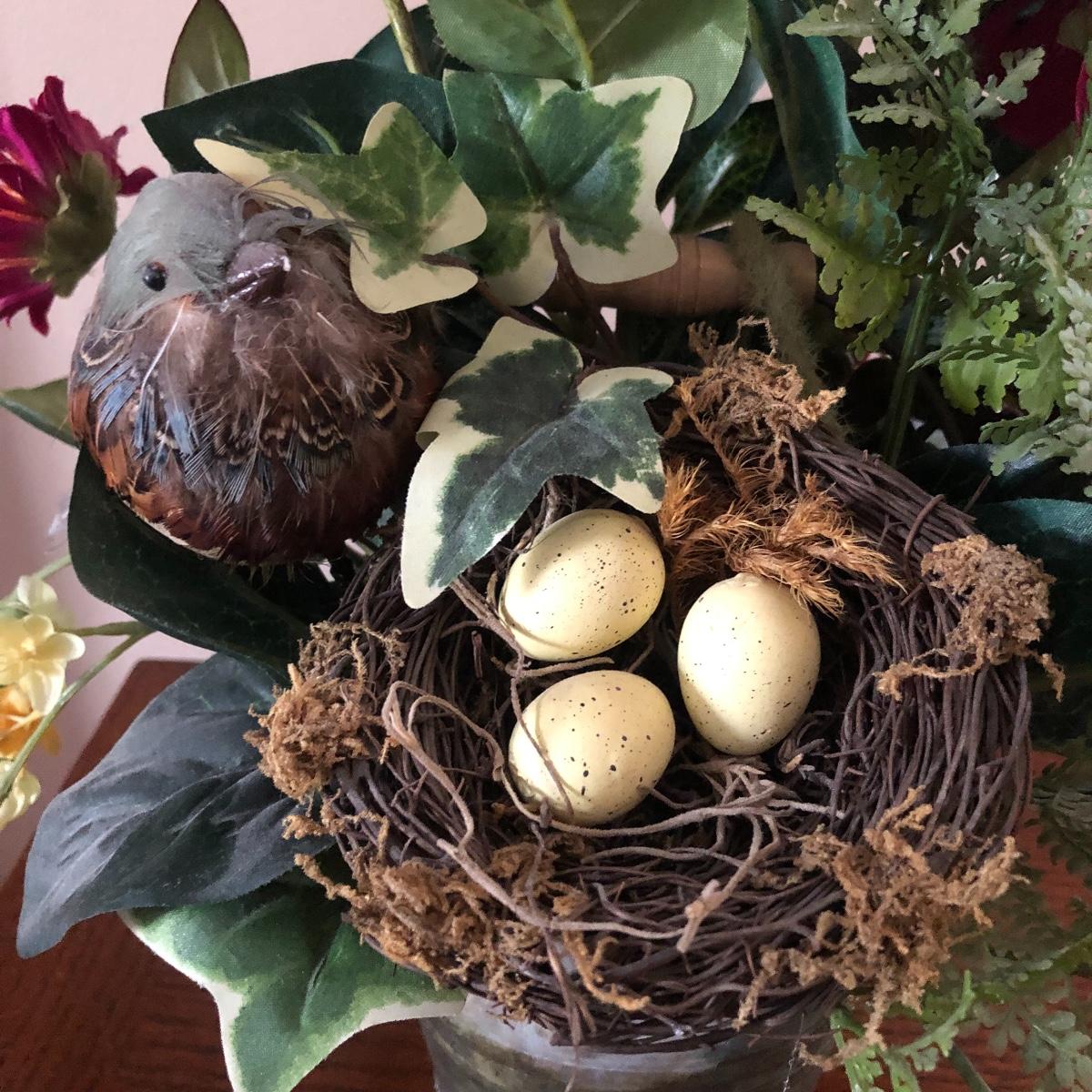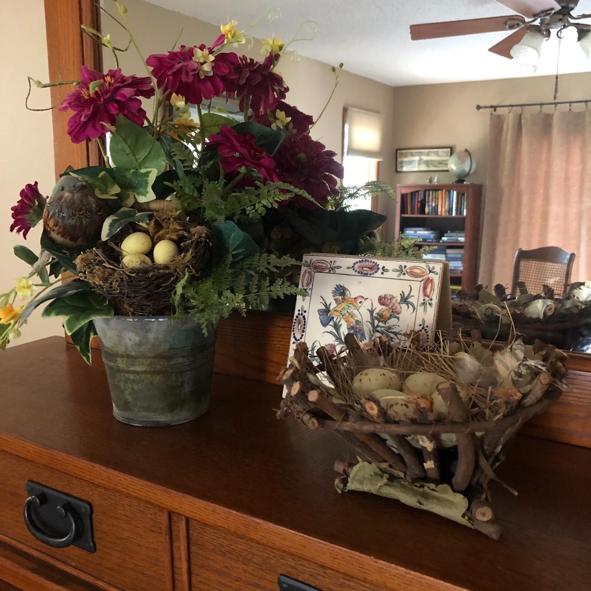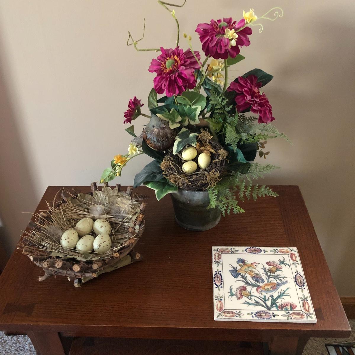 This lot has three items: a bird tile, a Robin’s nest and a floral arrangement with a bird and nest filled with eggs. The tile is hand painted and from Portugal. It measures 6” x 6”. The bird nest has plastic Robin’s eggs and is 8.5” in diameter and is 4” tall. The floral arrangement is about 14” tall. It has a metal flower pot. Local pick up only.