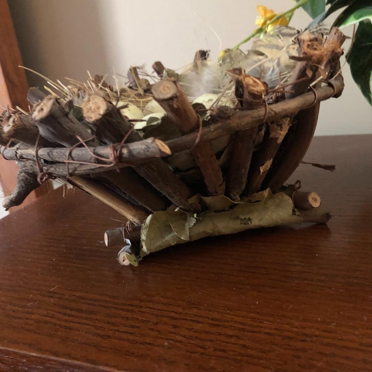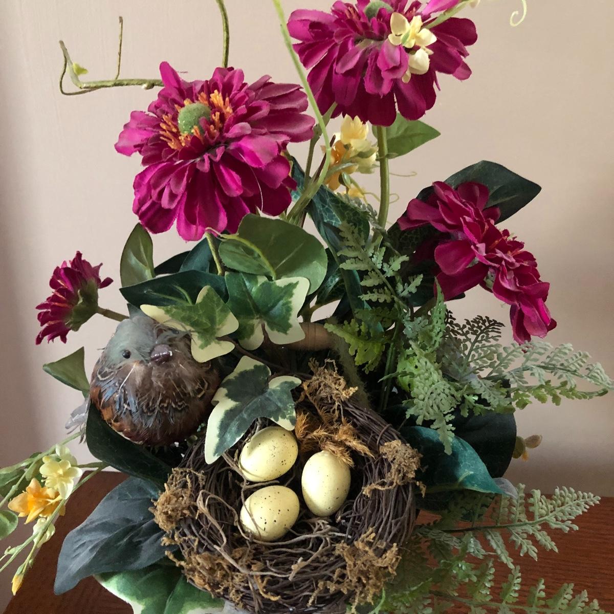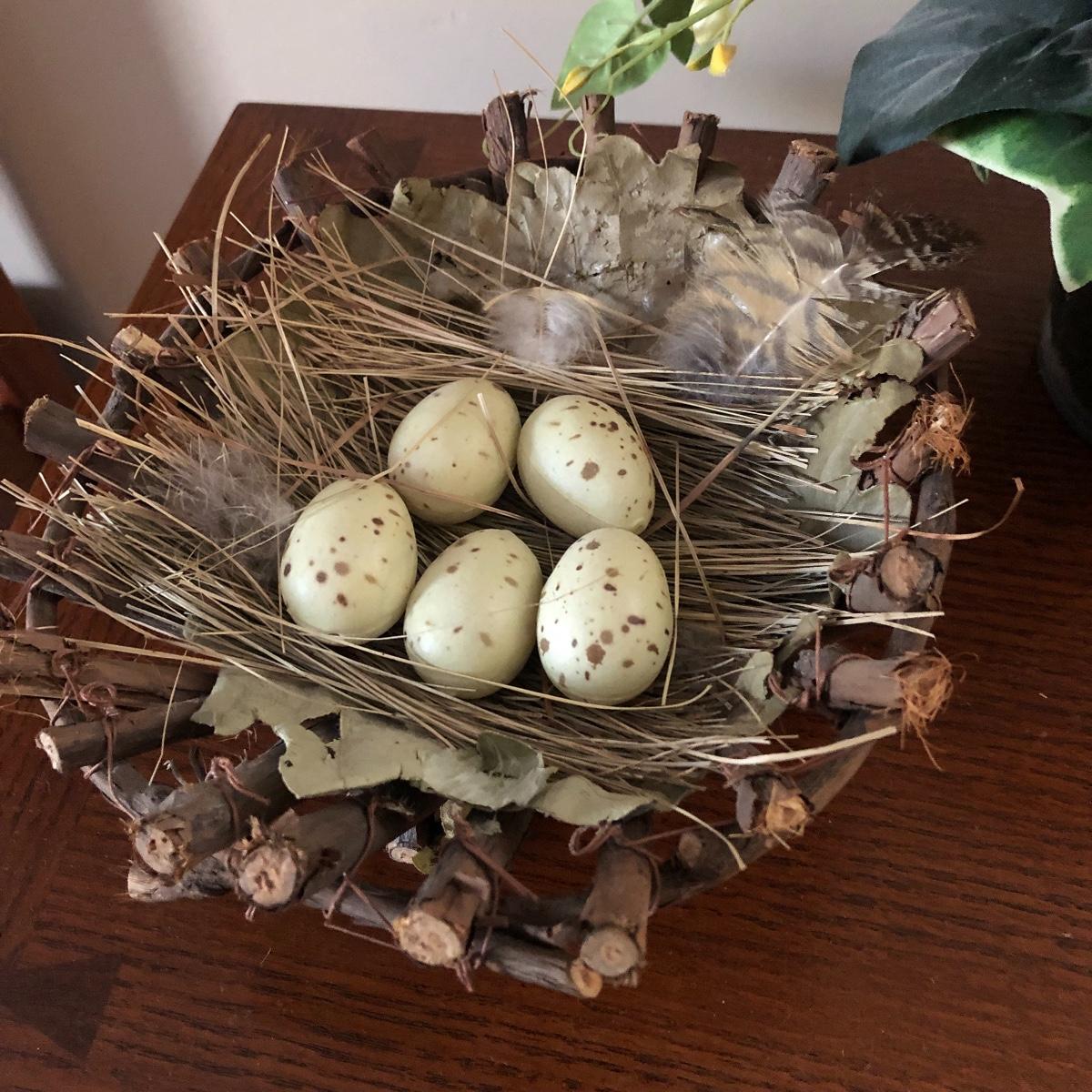 This lot has three items: a bird tile, a Robin’s nest and a floral arrangement with a bird and nest filled with eggs. The tile is hand painted and from Portugal. It measures 6” x 6”. The bird nest has plastic Robin’s eggs and is 8.5” in diameter and is 4” tall. The floral arrangement is about 14” tall. It has a metal flower pot. Local pick up only.