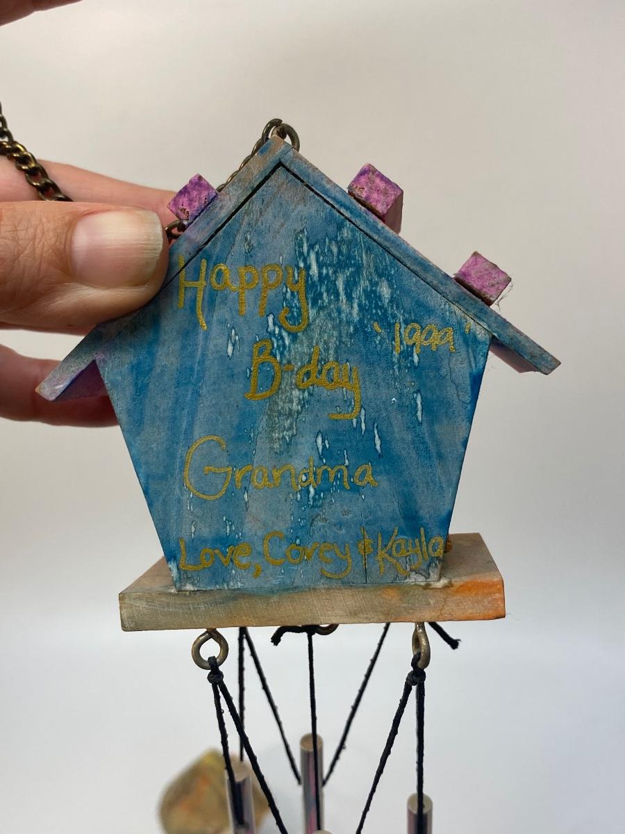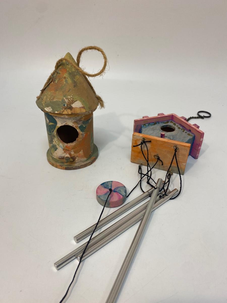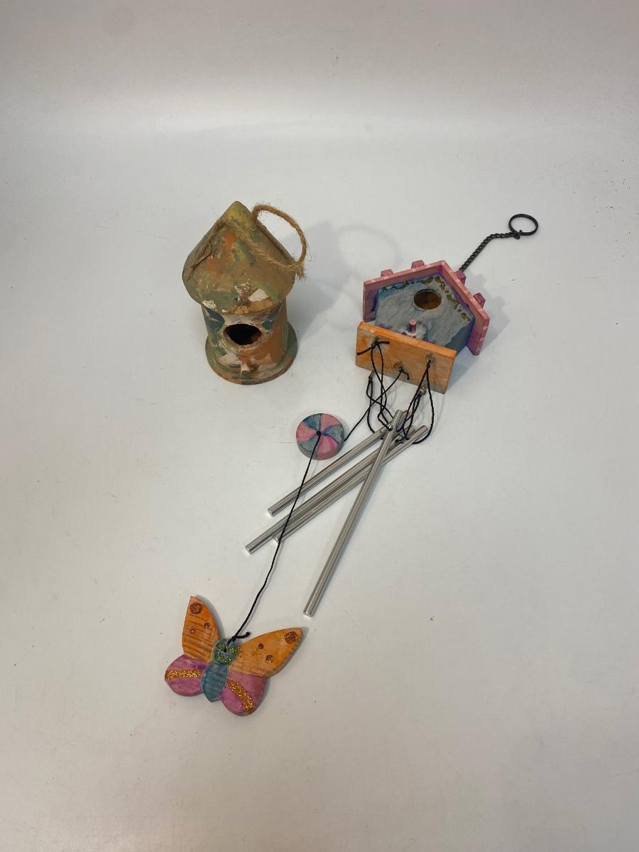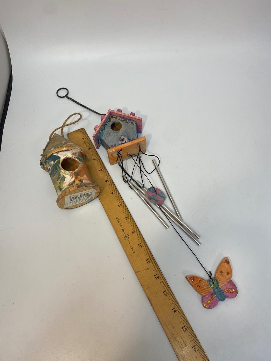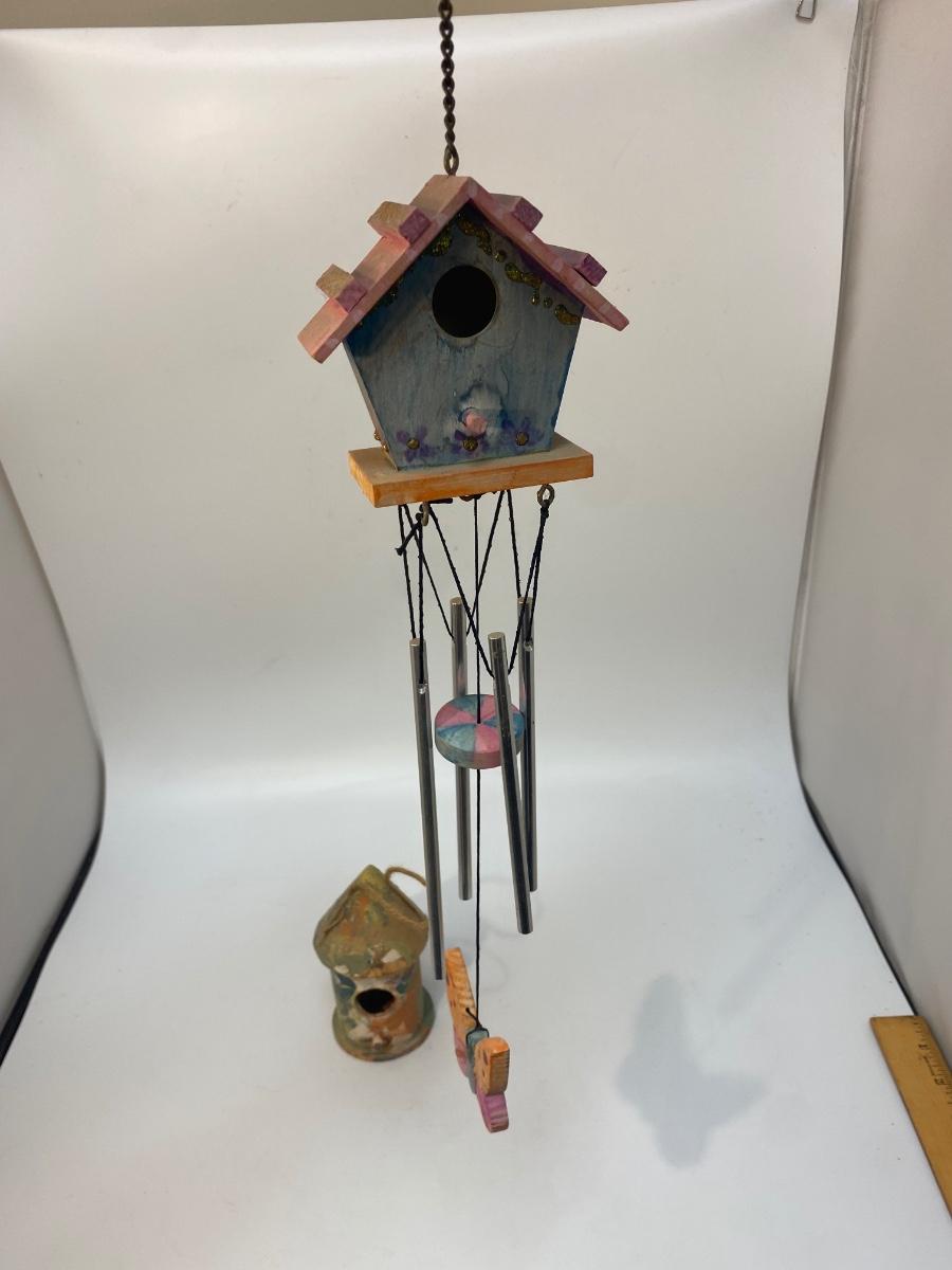 Hand Painted Birdhouse Wind Chime & Hanging Decor. Both look like they were done by children as gifts. Chimes sound nice.