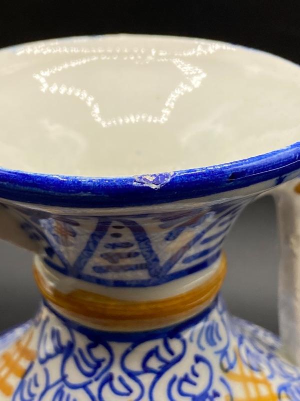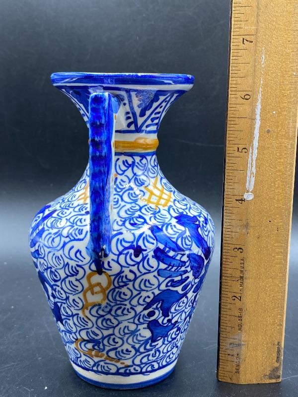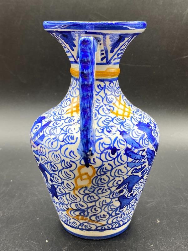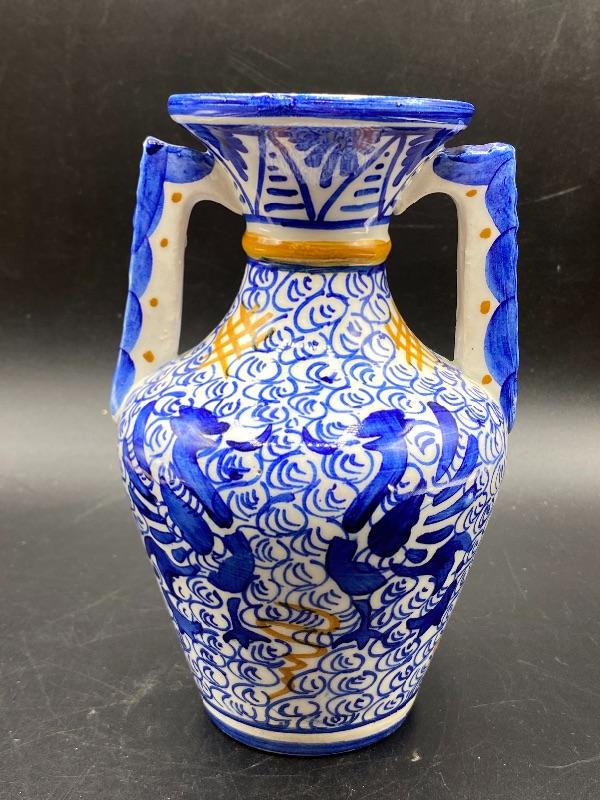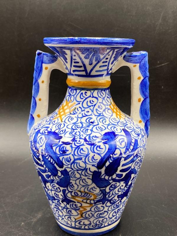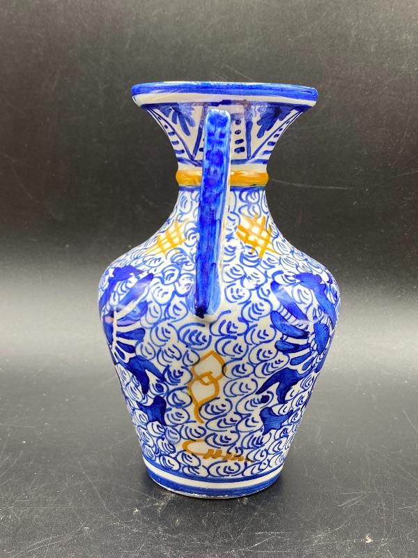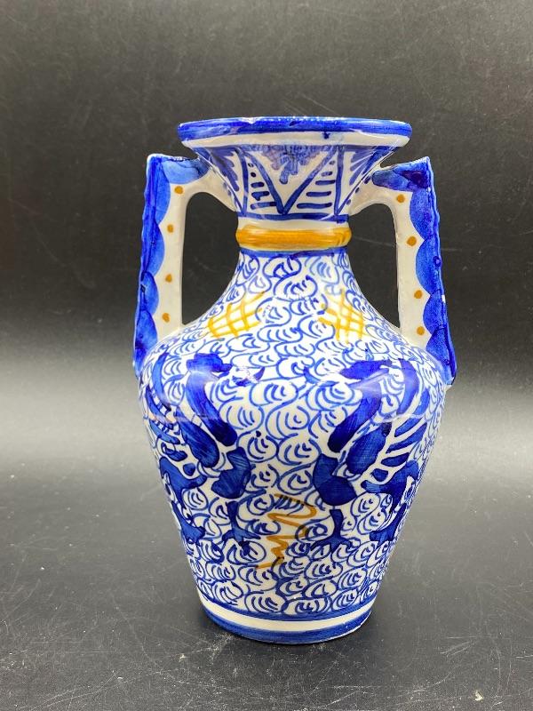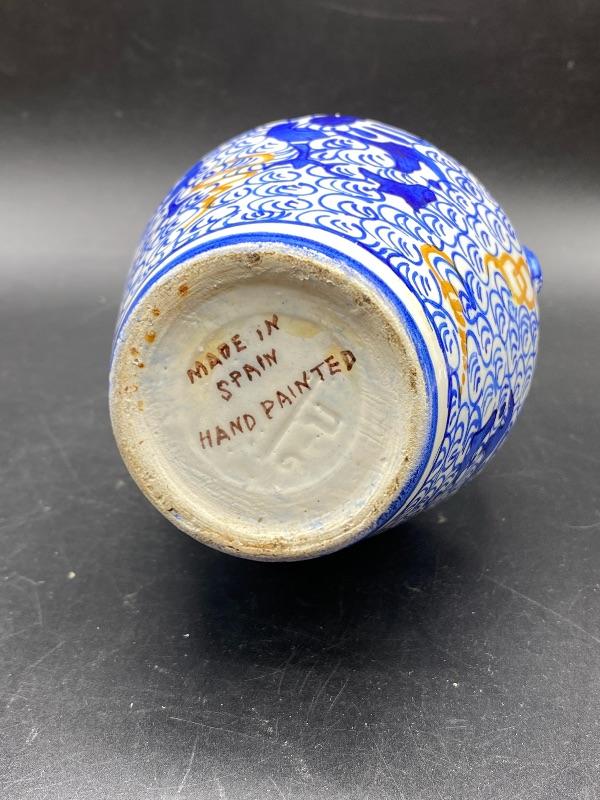 Small hand painted vase. Blue dragons with blue swirl background. Made in Spain. Under 7" tall. Small chip in the rim, unsure if it happened before or after being painted as it is blue like the rim. Displays nicely.