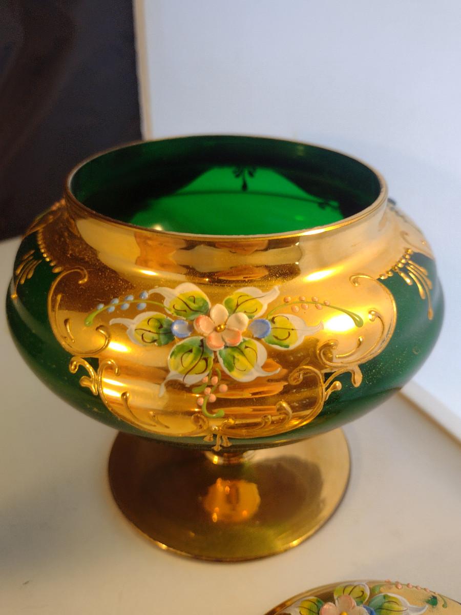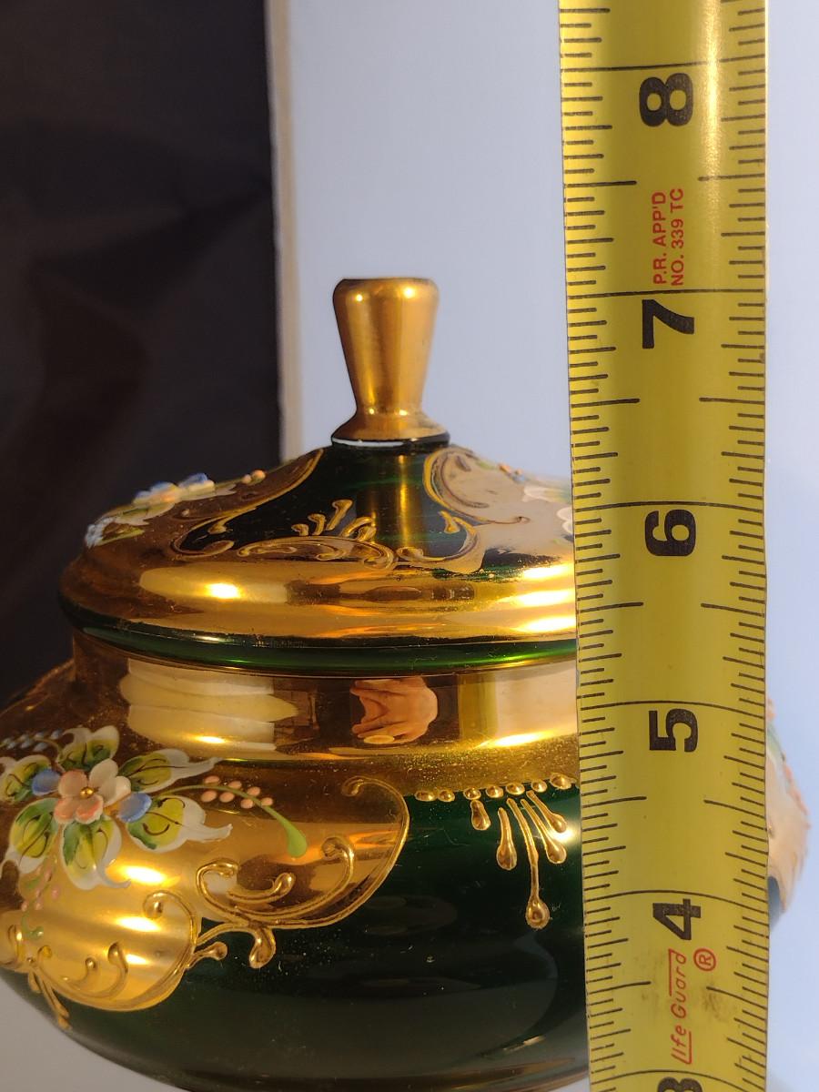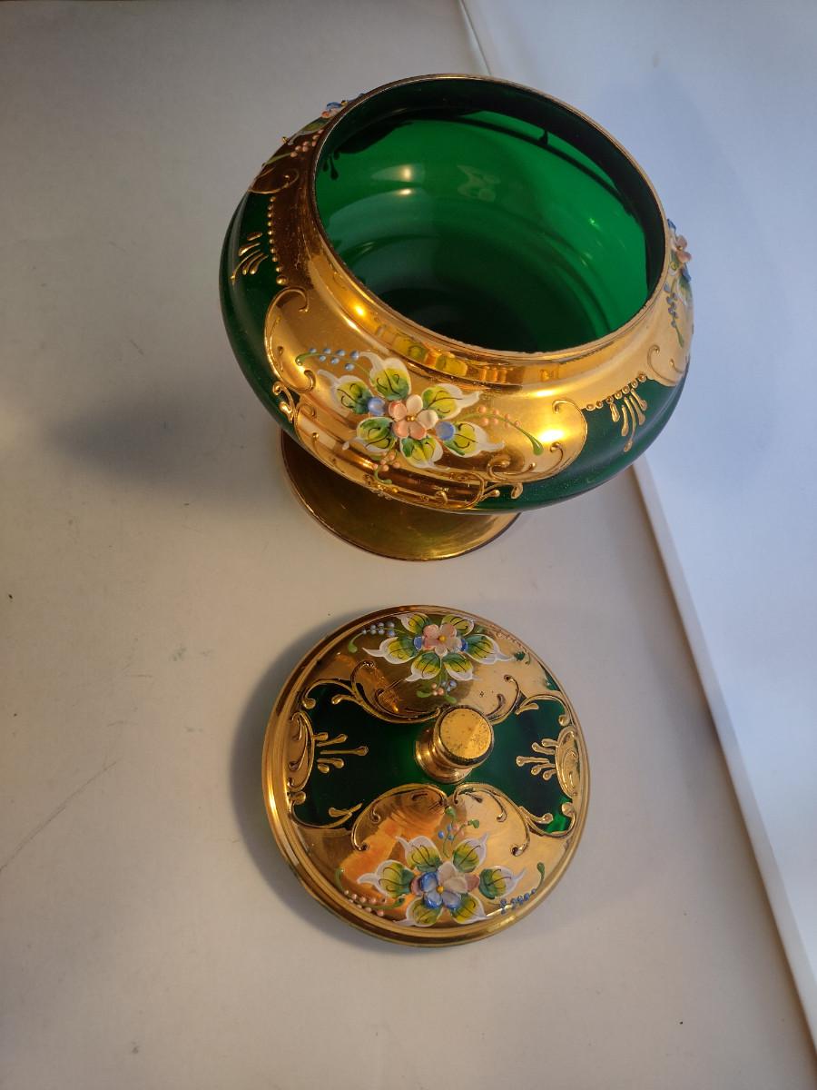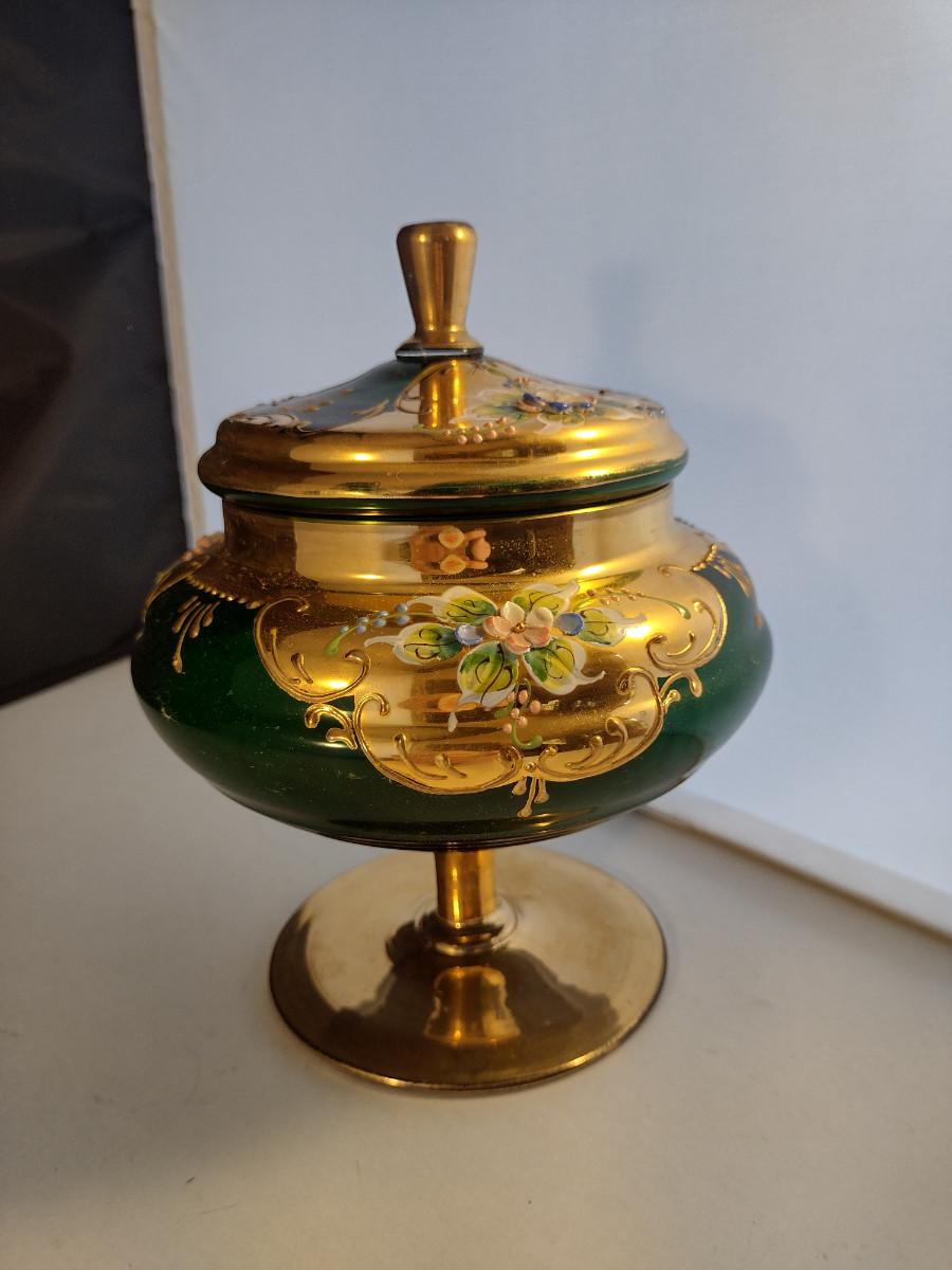 Hand Painted Bohemian Emerald Glass Candy Dish with Lid