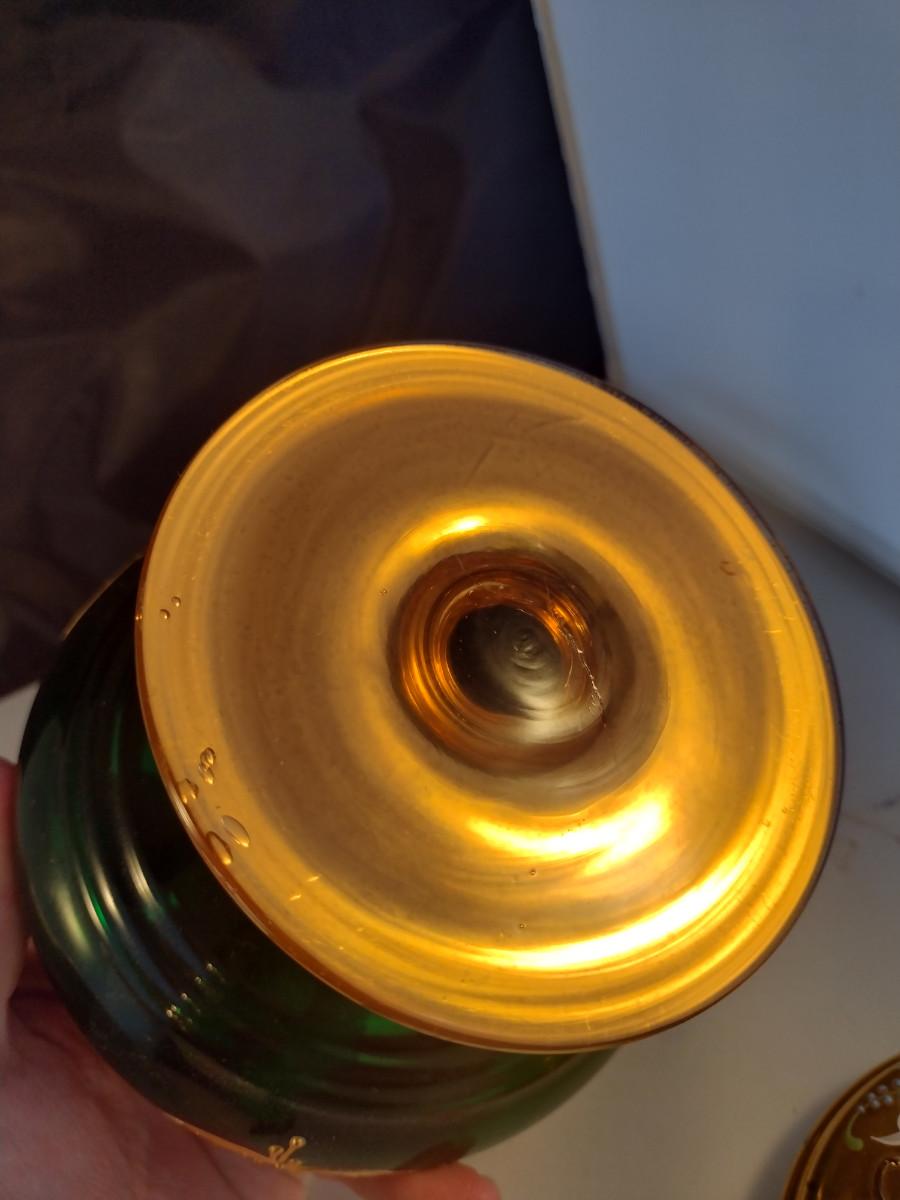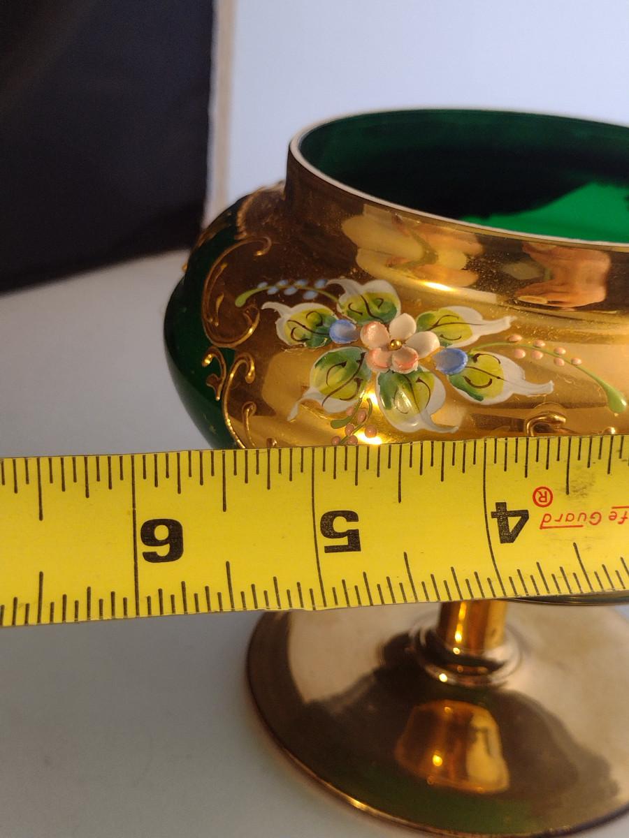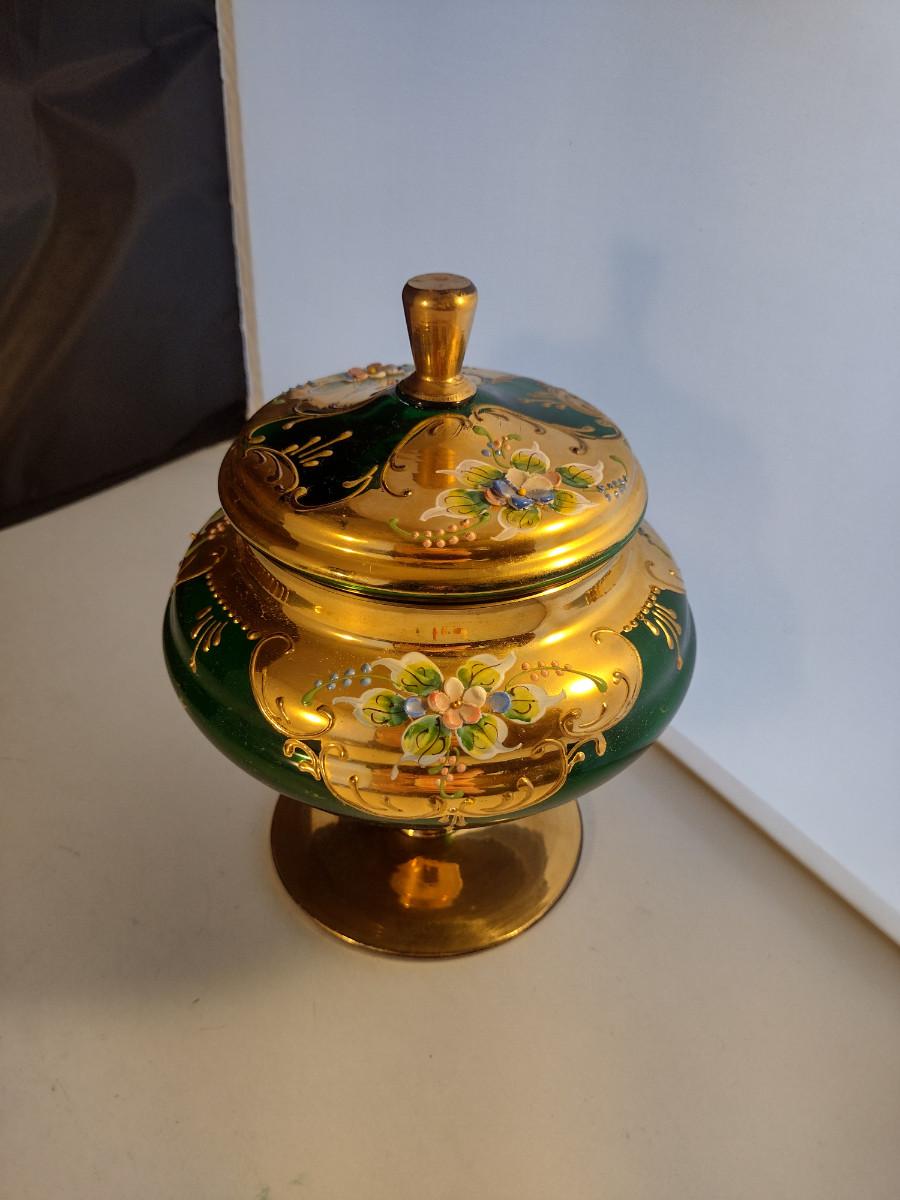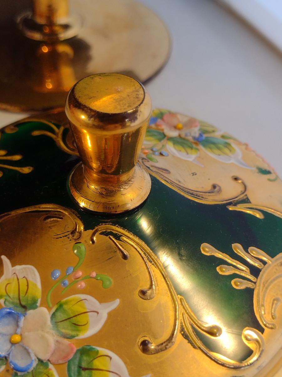 Hand Painted Bohemian Emerald Glass Candy Dish with Lid