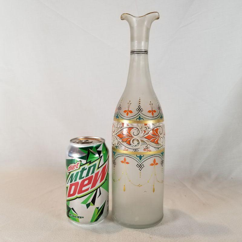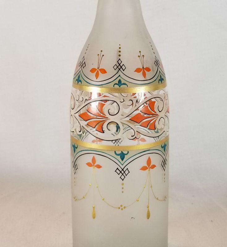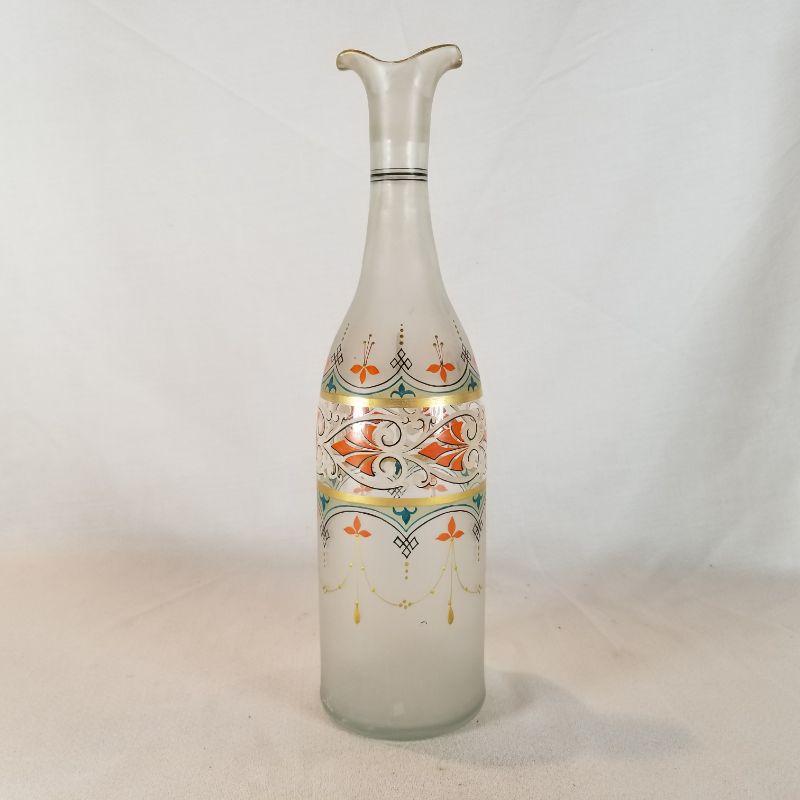 Beautiful period hand-painted satin glass carafe. Looks to be Italian - possibly Venitian (?) No cracks or chips. Great condition, Very pretty and waiting to enhance your beverage shelf.