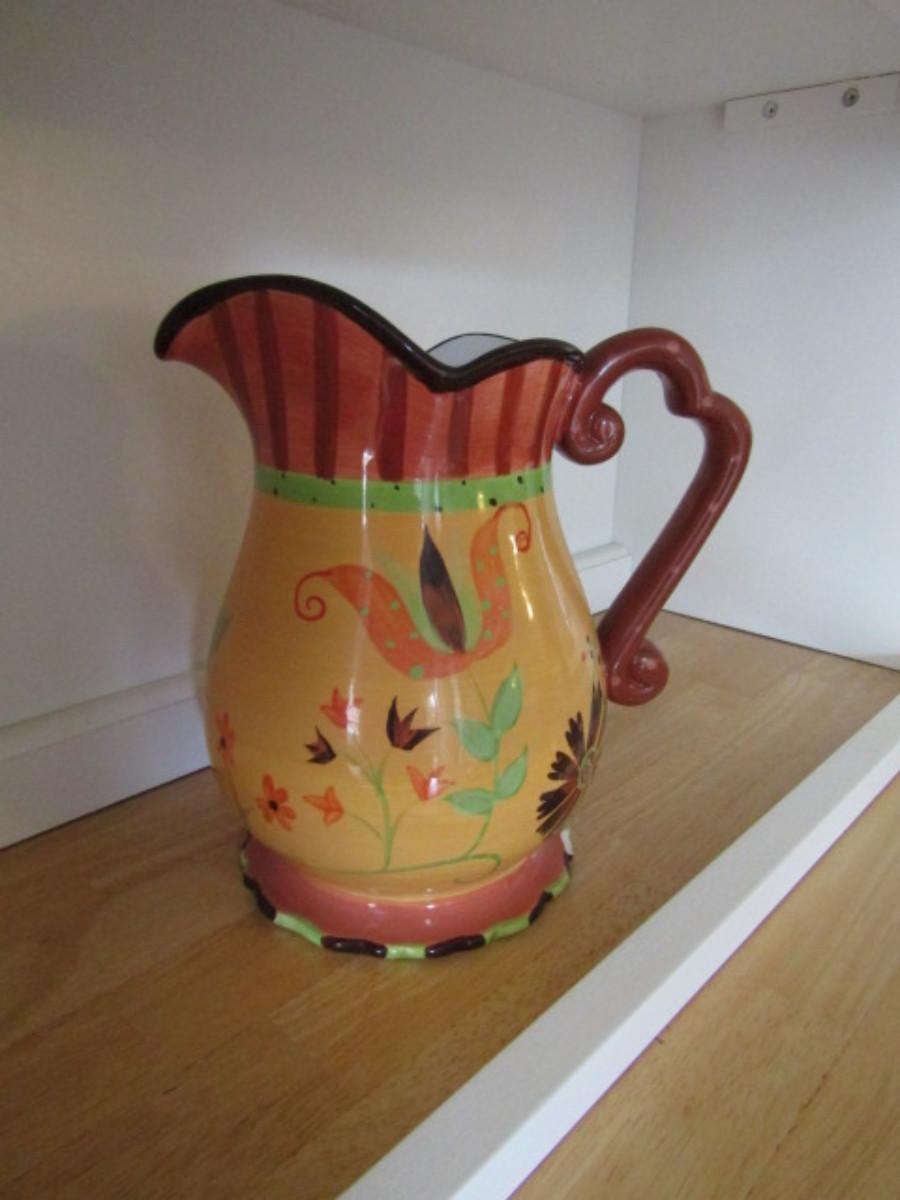 Hand Painted Ceramic Pitcher- Flowers and Stripes