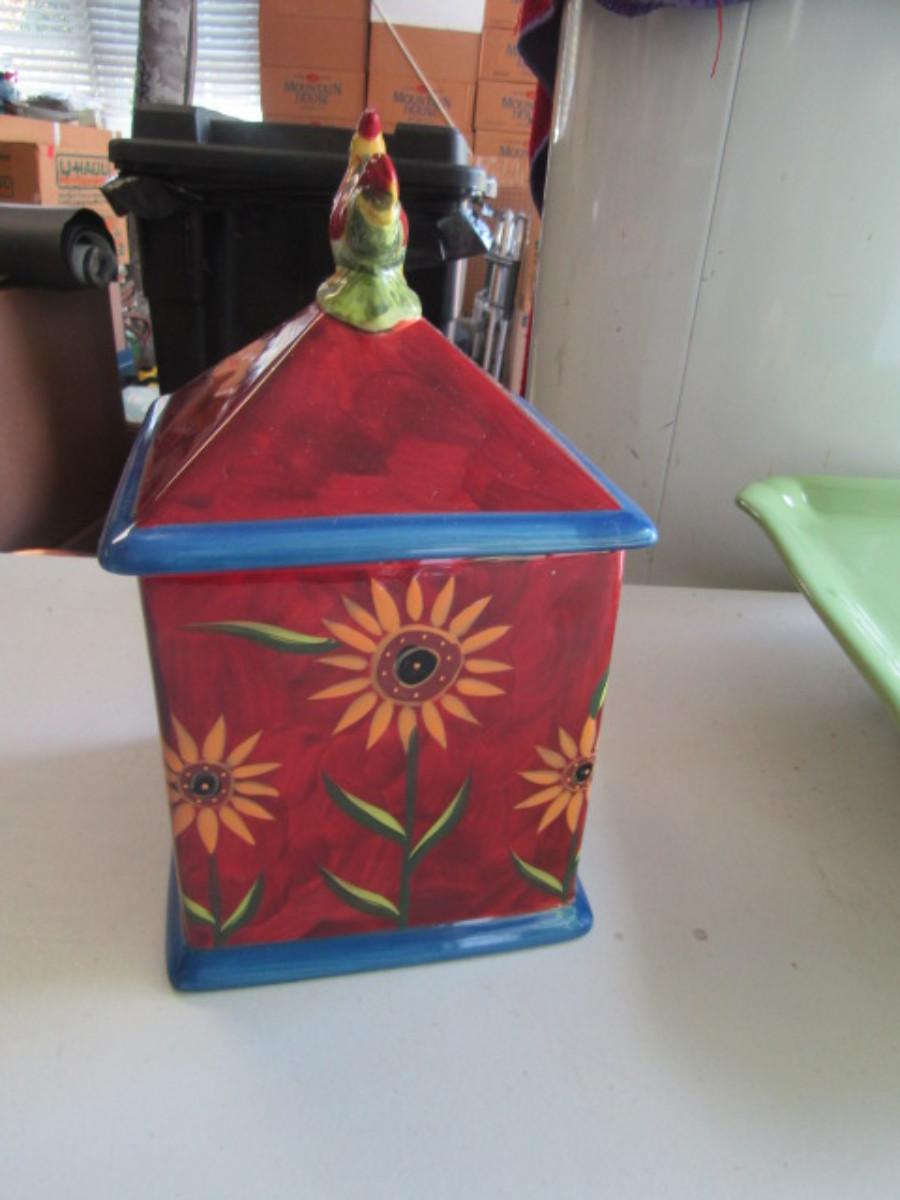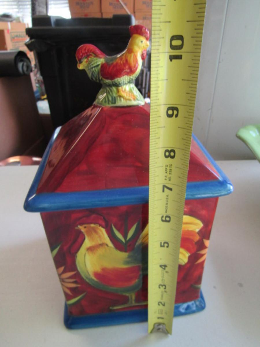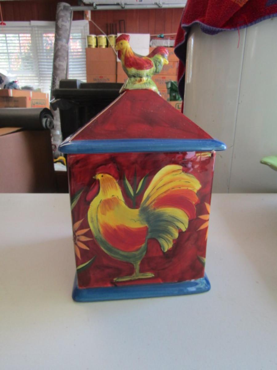 Hand Painted Ceramic Rooster Theme Canister. Please see all pictures- two small chips on underside of lid.