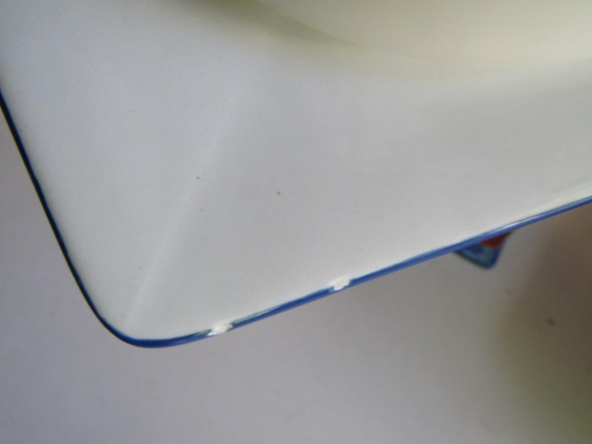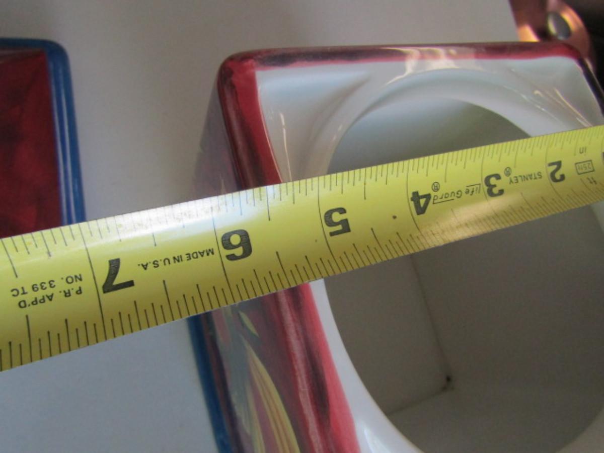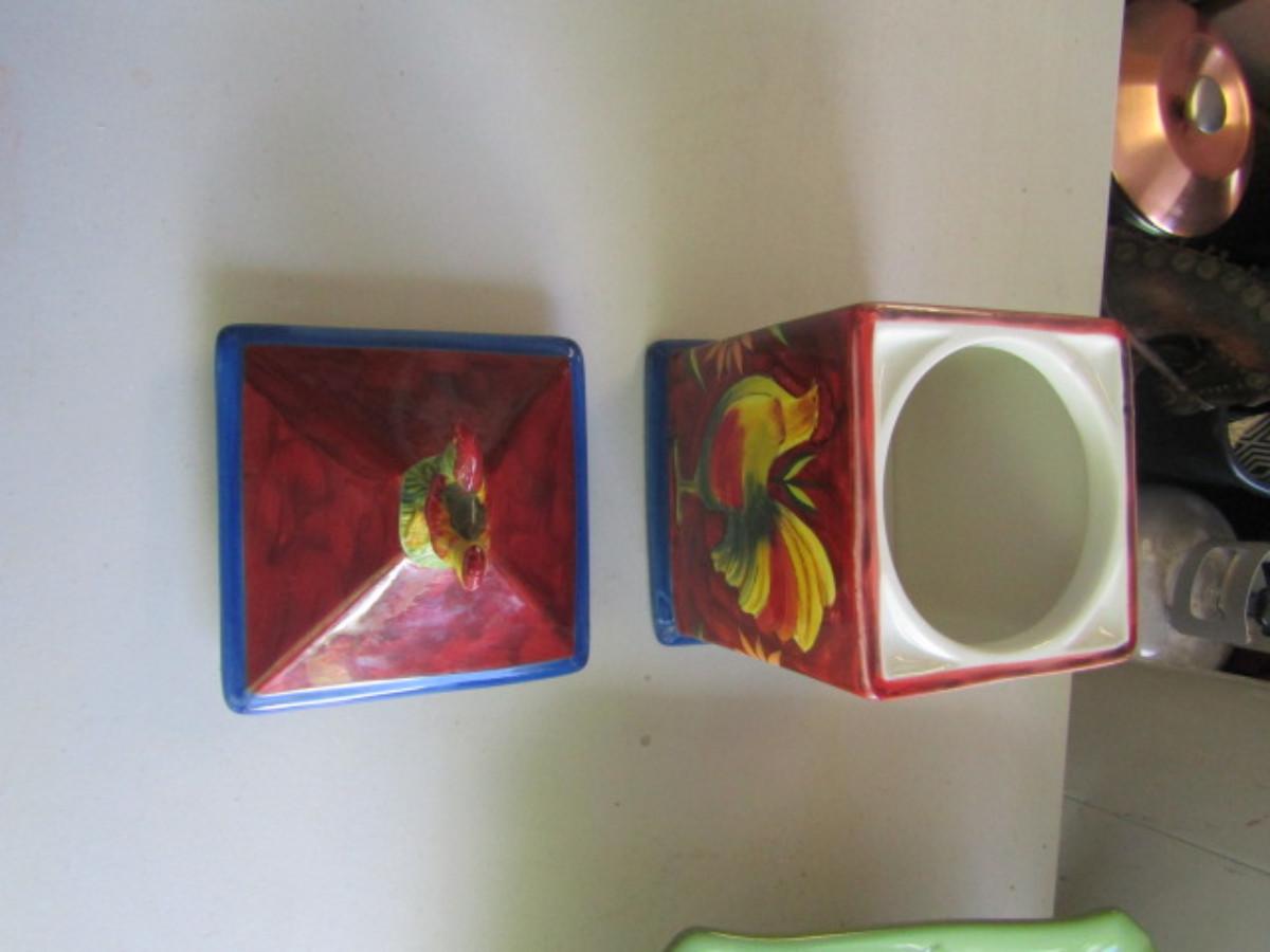 Hand Painted Ceramic Rooster Theme Canister. Please see all pictures- two small chips on underside of lid.