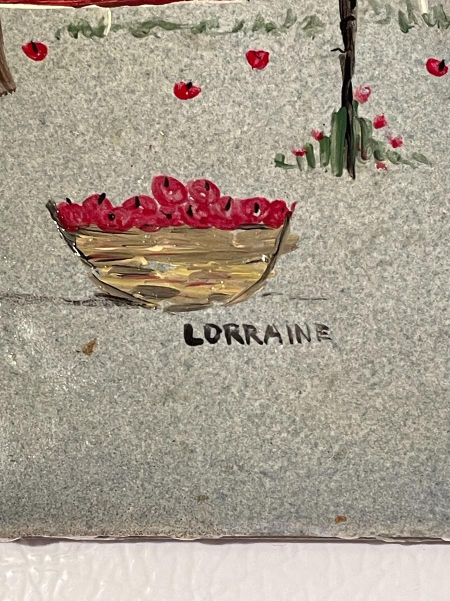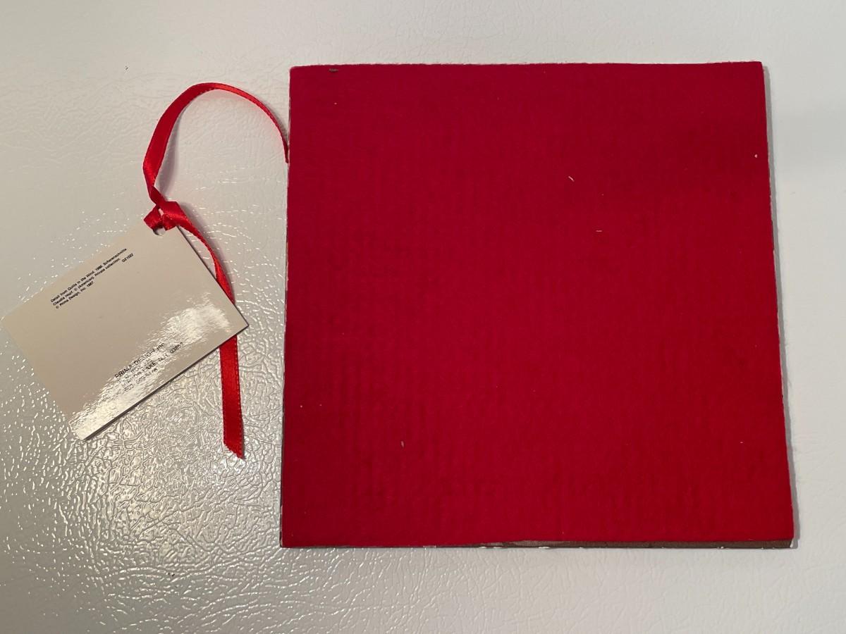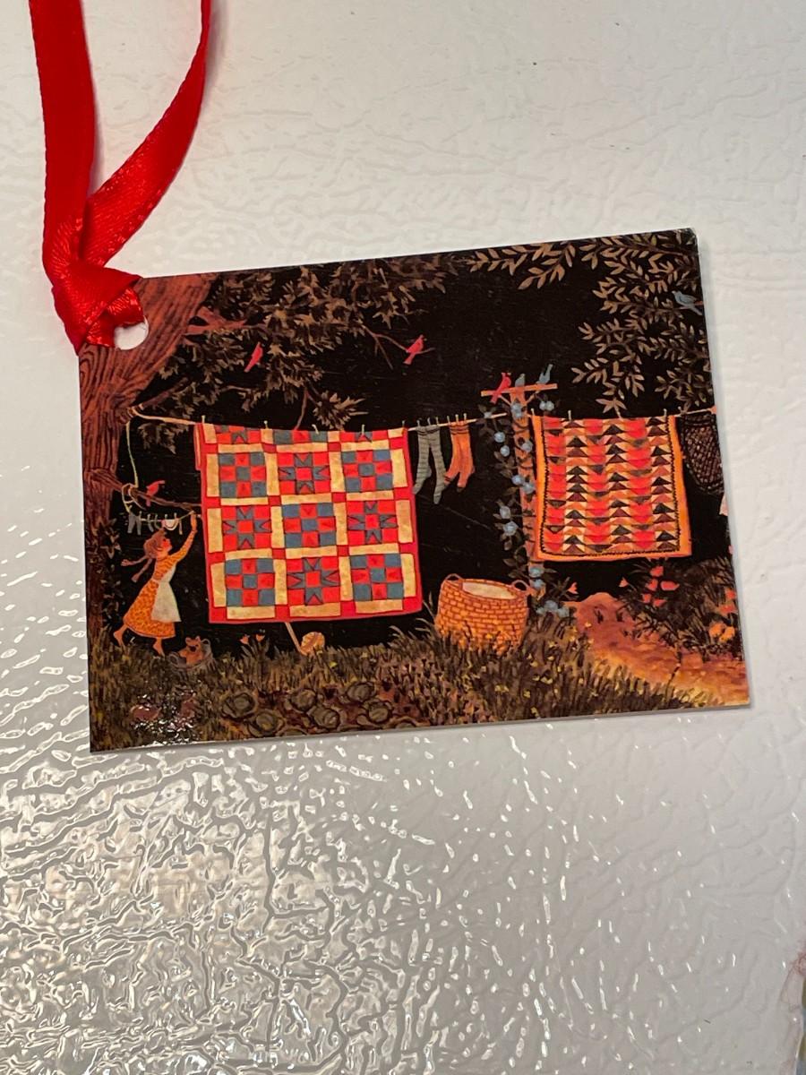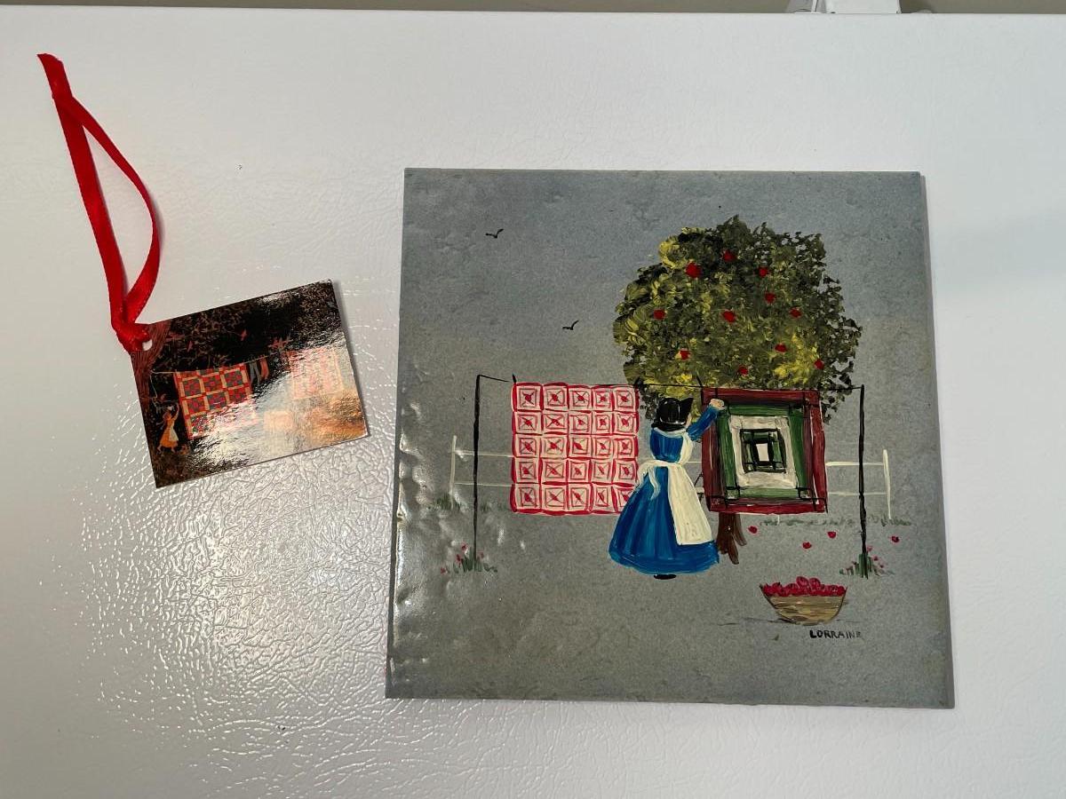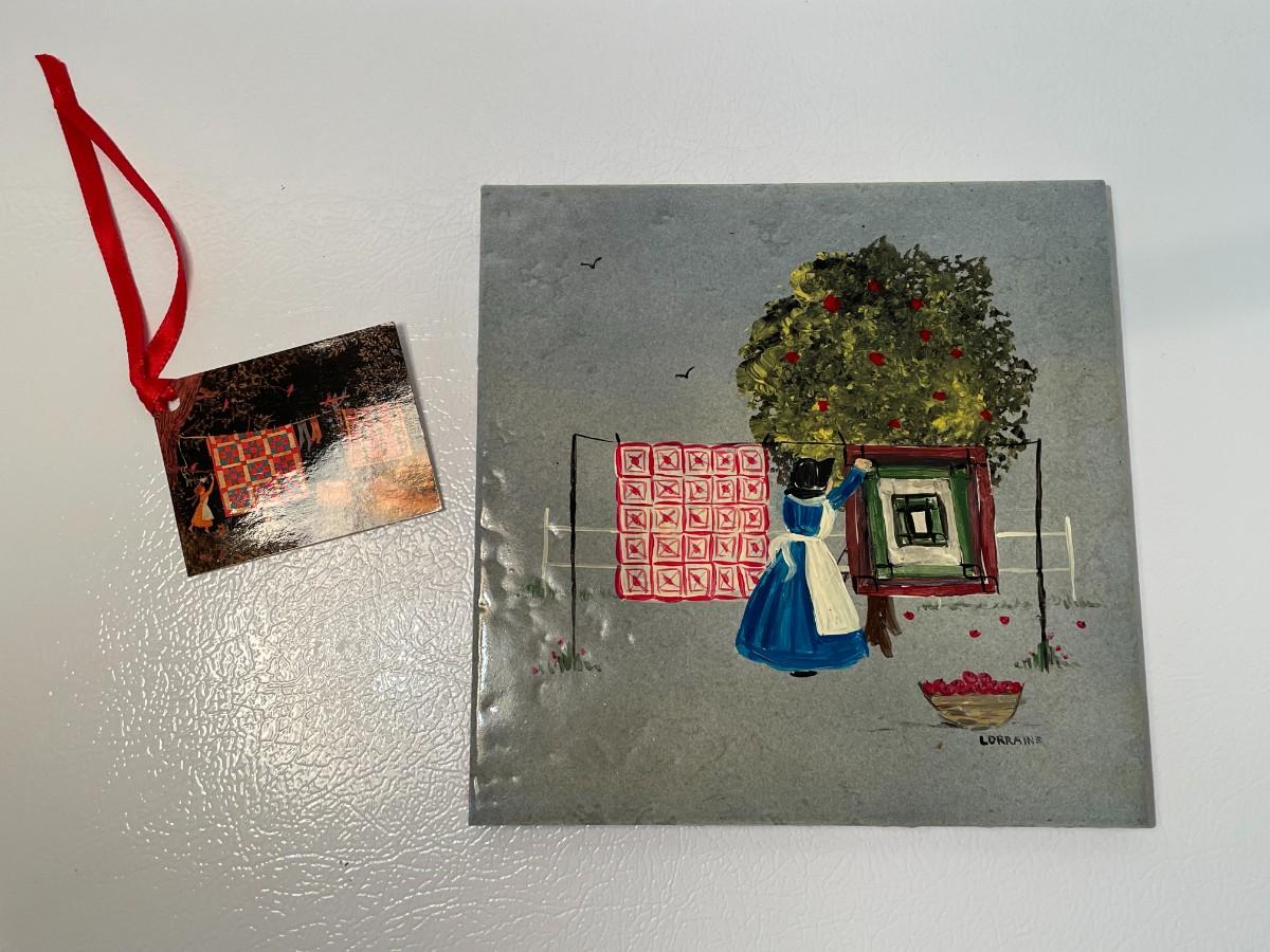 This tile is about 8 inches square and is hand painted with a scene of a lady hanging quilts. It is in excellent condition. There is also a gift tag that also has quilts.