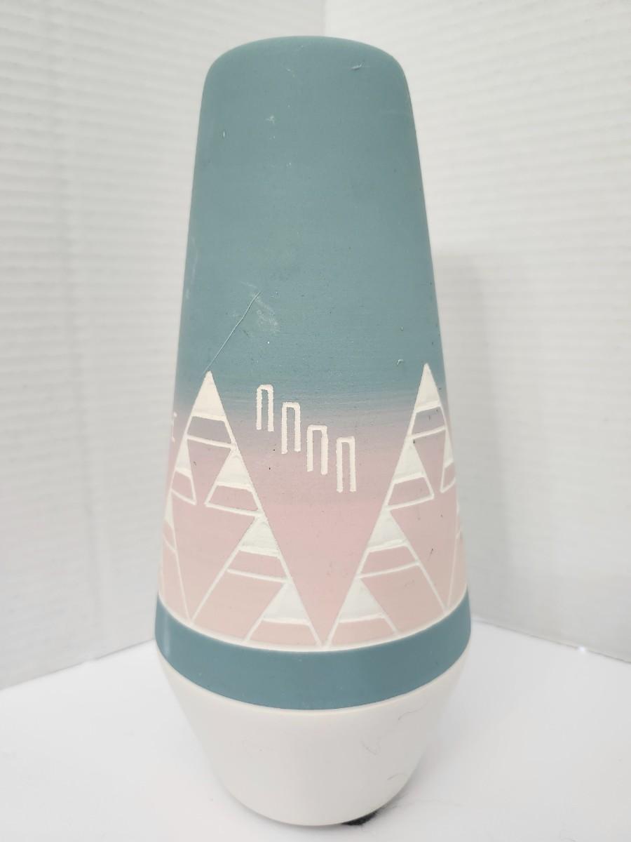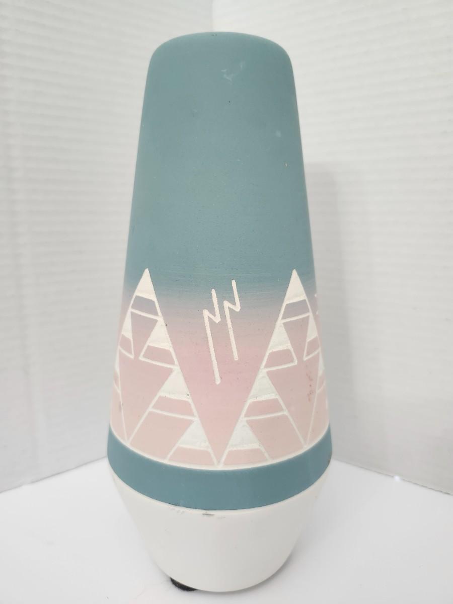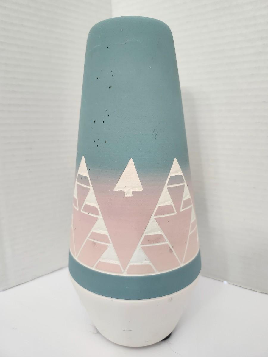 Hand Painted Ceramic Vase Southwestern Geometric Trees Pastel Blue Pink White Felt Base