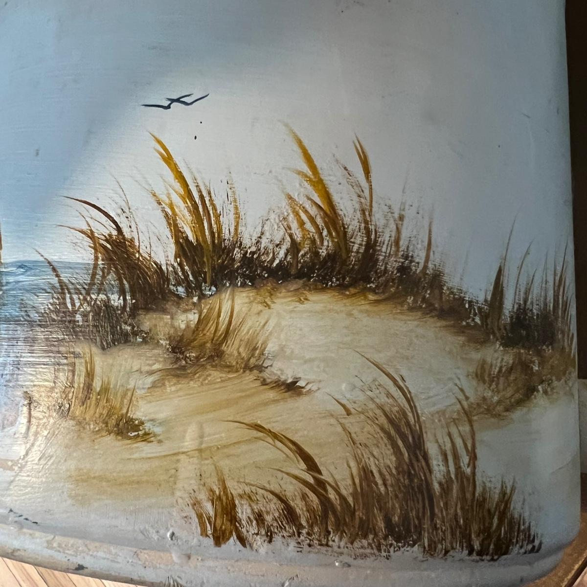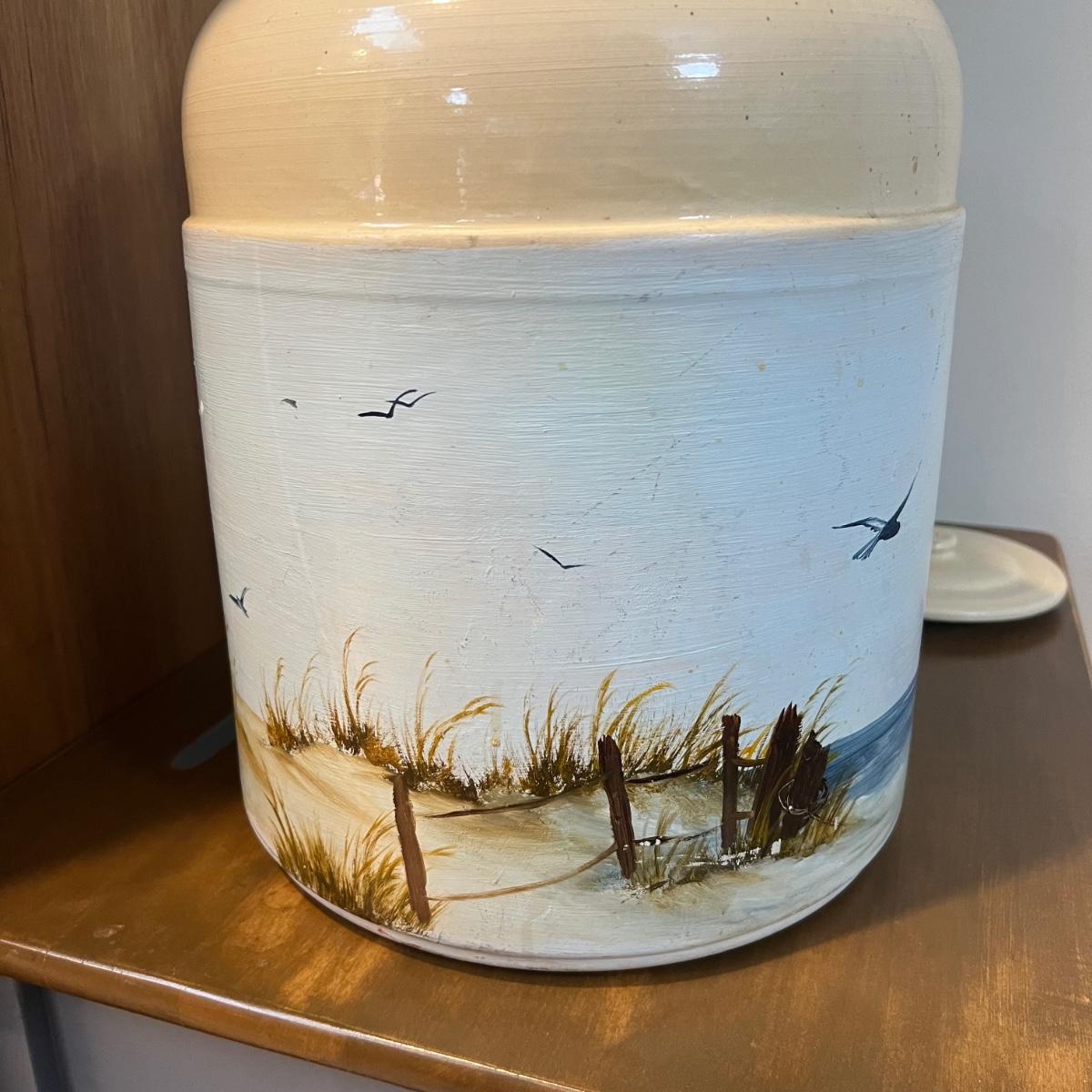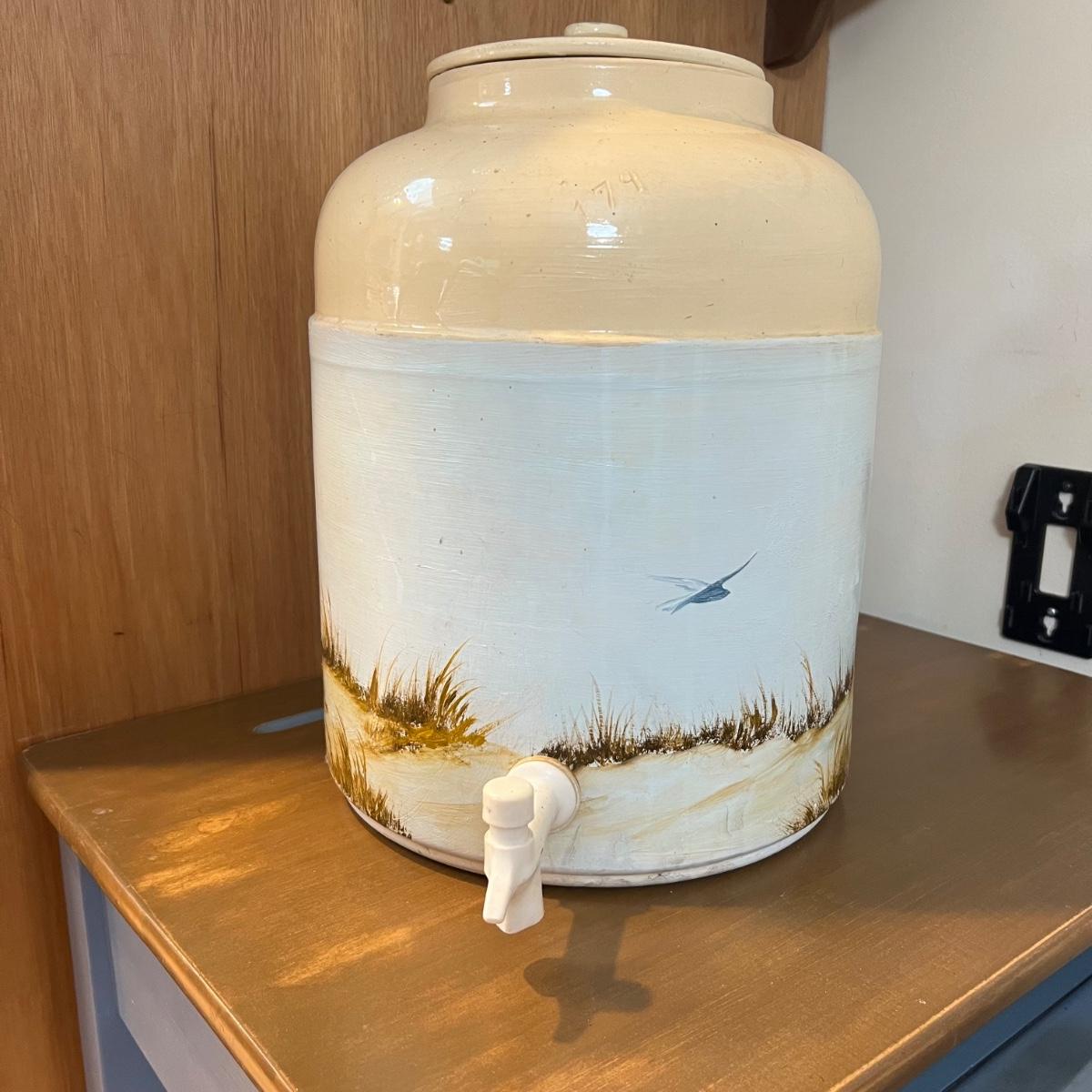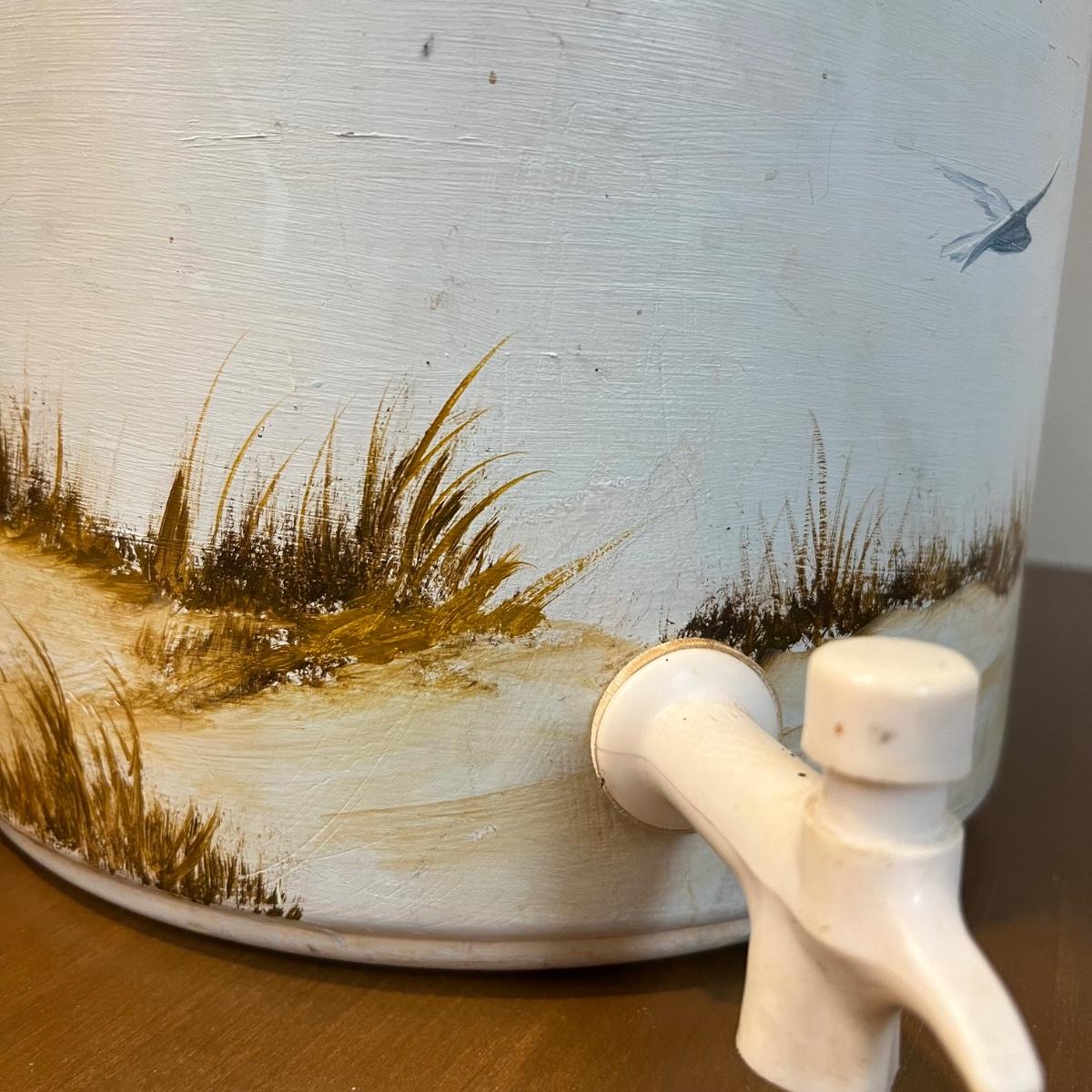 This large water dispenser crock has a plastic tap. Crock appears to have been hand painted with a beach theme. Note there is a very small chip in the rim which is hidden from view when lid is in place.