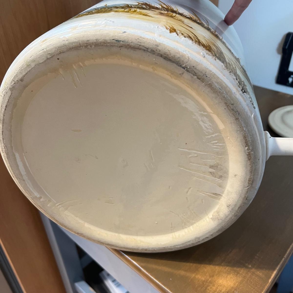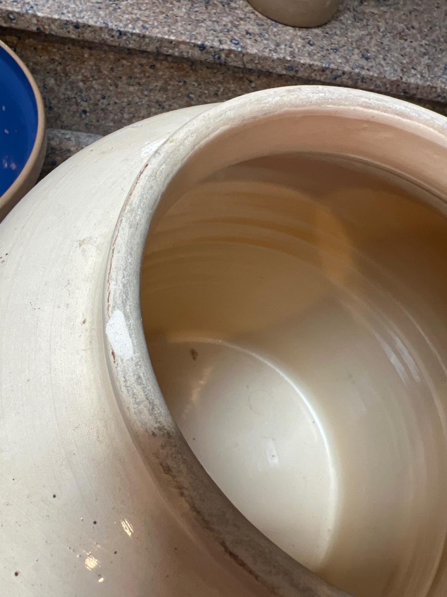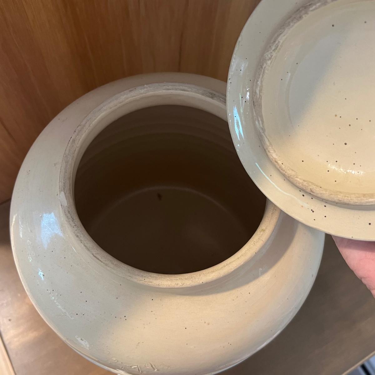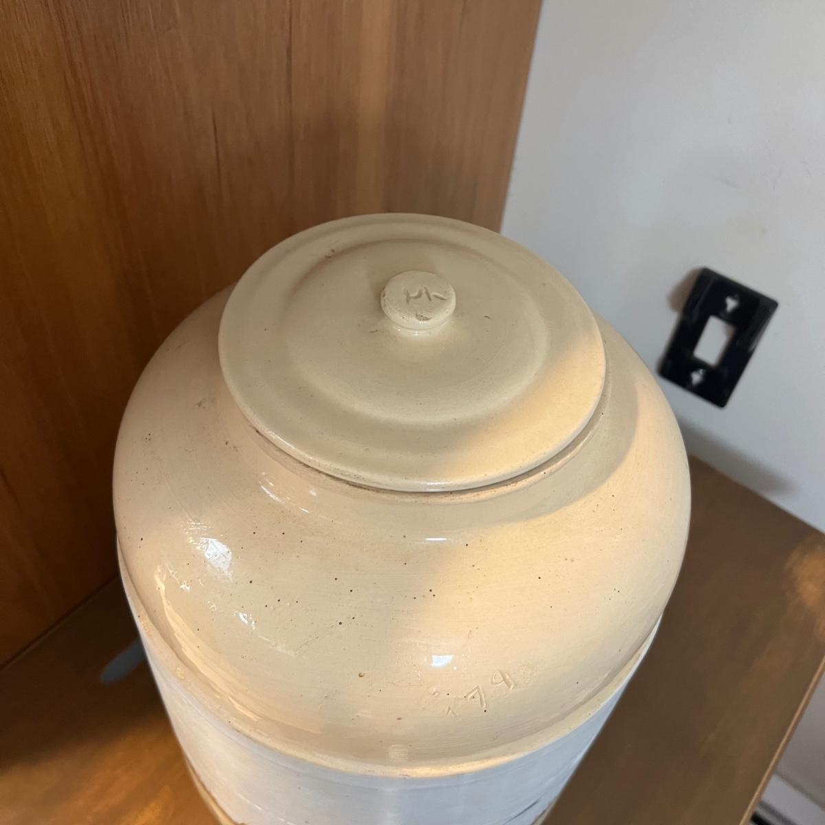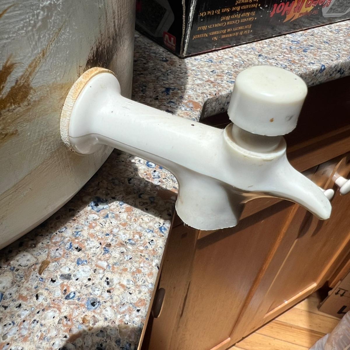 This large water dispenser crock has a plastic tap. Crock appears to have been hand painted with a beach theme. Note there is a very small chip in the rim which is hidden from view when lid is in place.