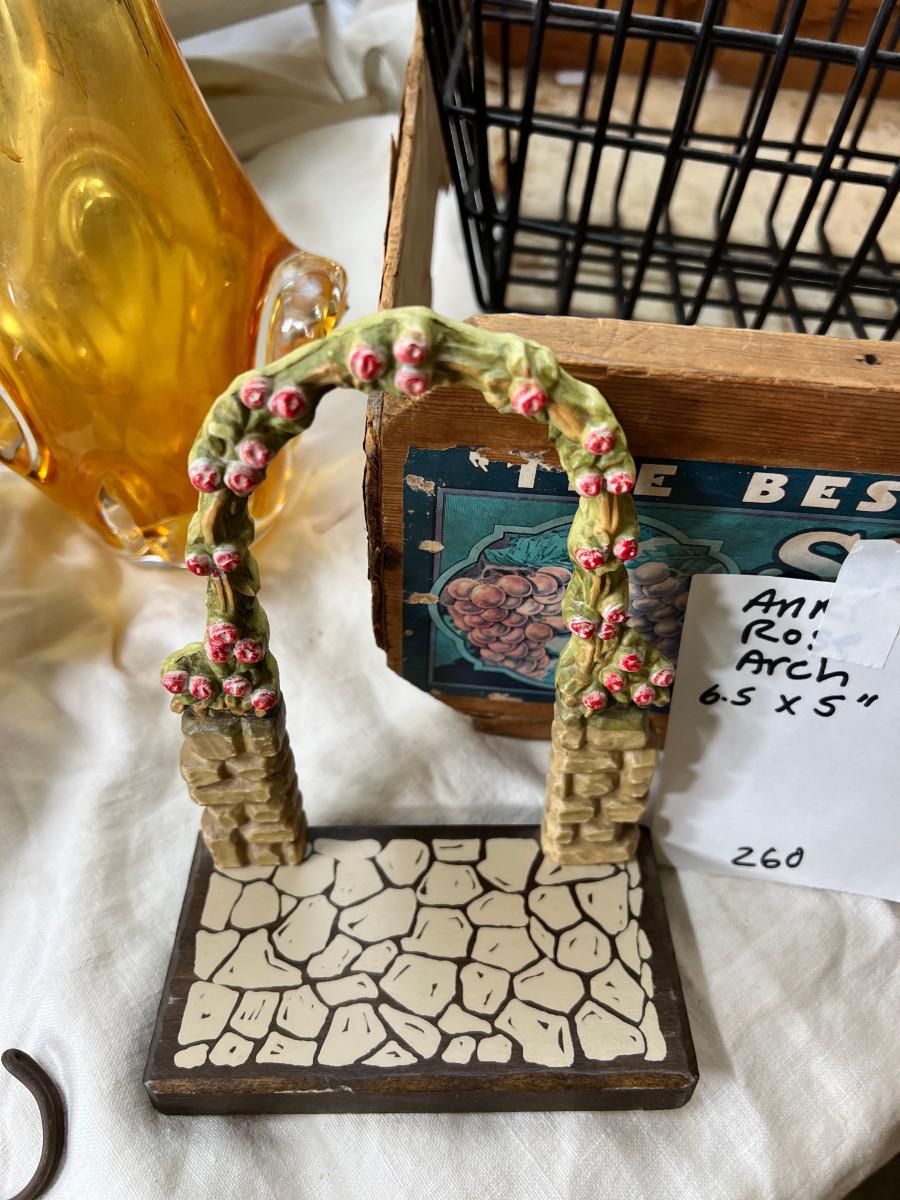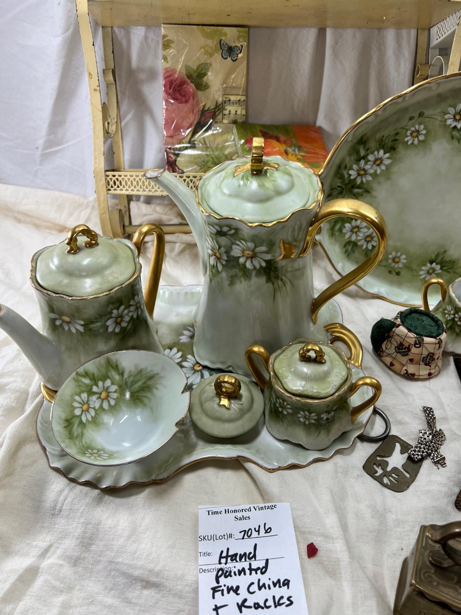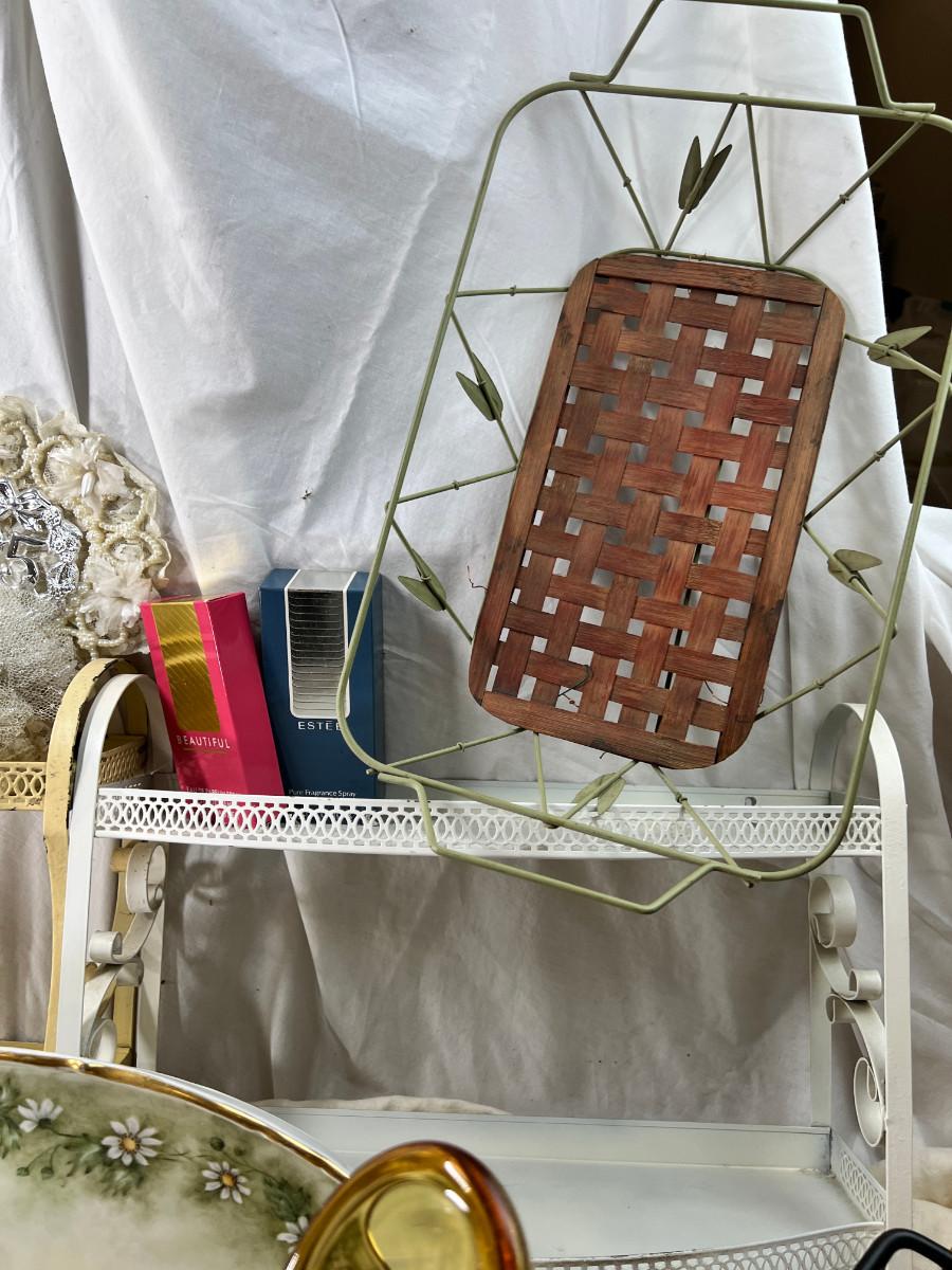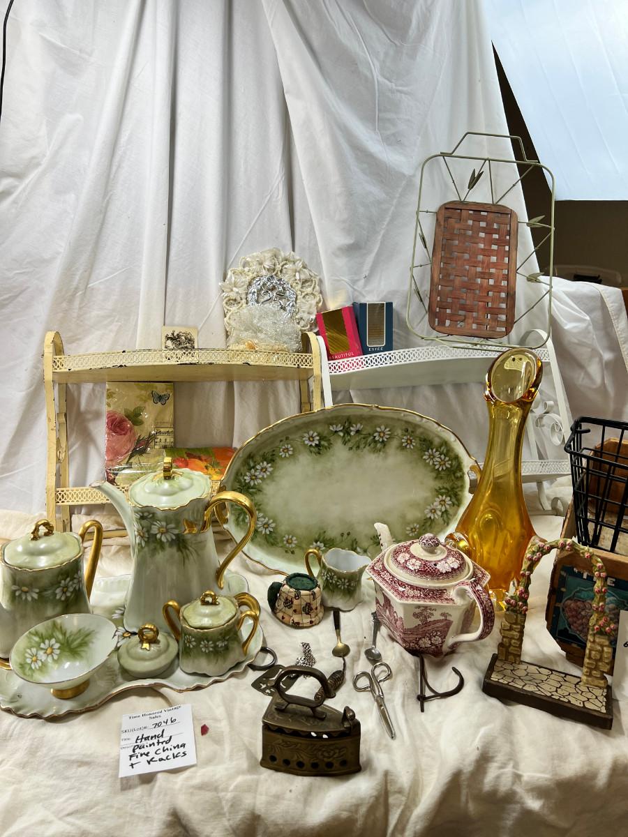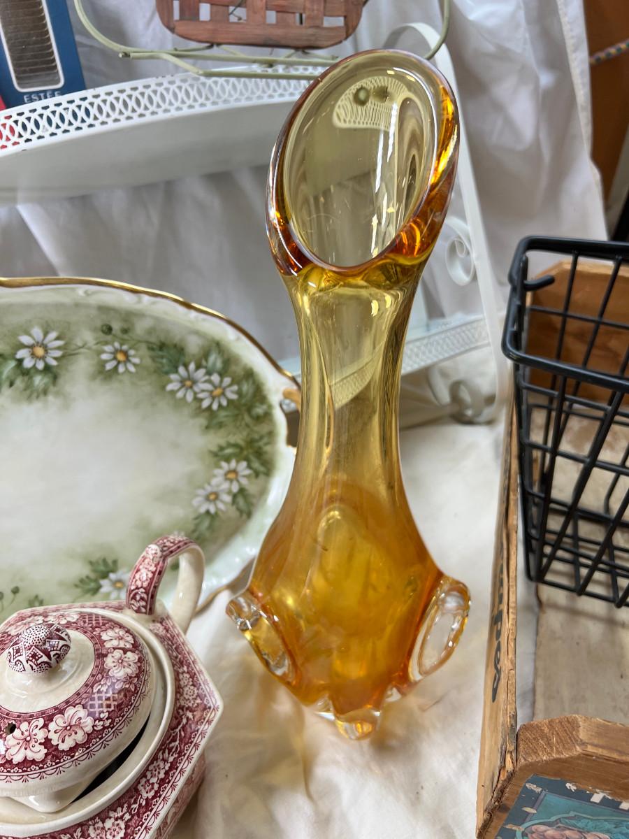 Very heavy hand blown Amber vase, Metal basket and racks, English tea pot with wear inside, Anri arch for back drop. Hand painted fine china tea and coffee pot.