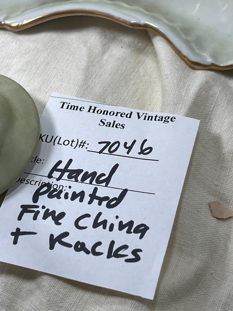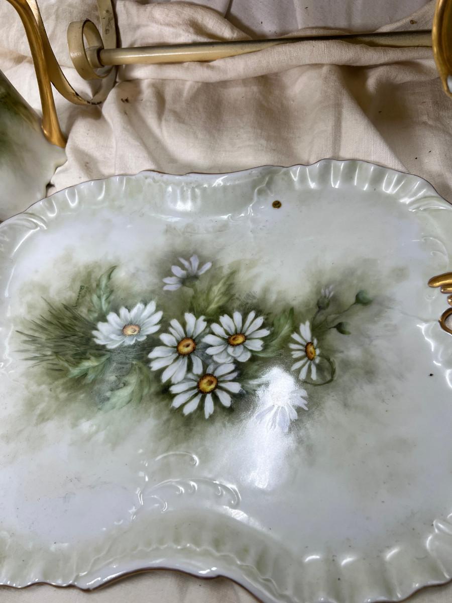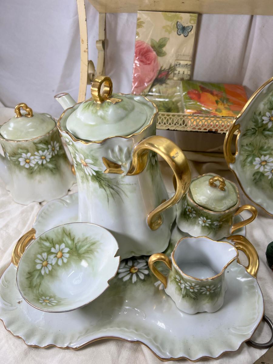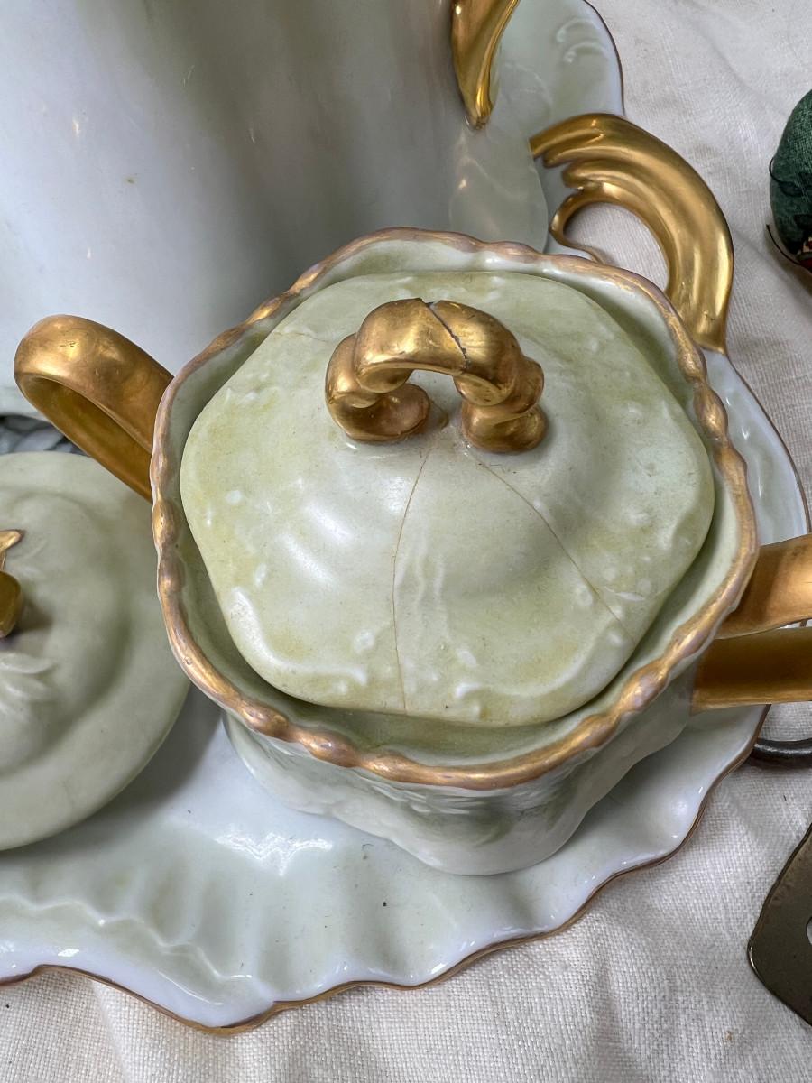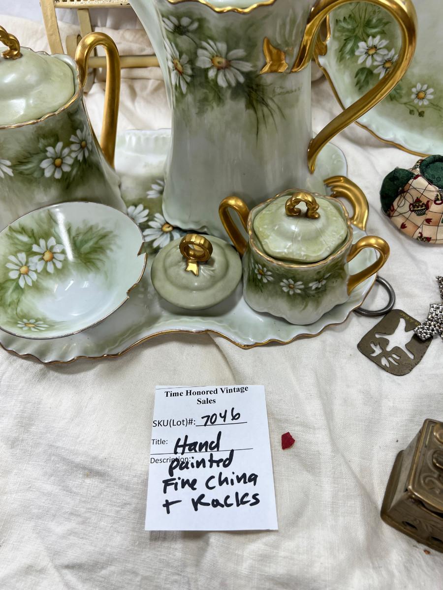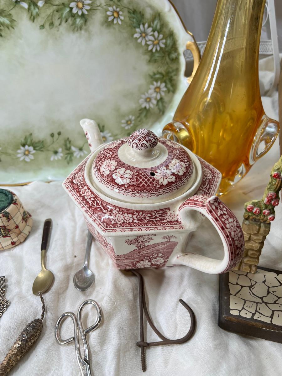 Very heavy hand blown Amber vase, Metal basket and racks, English tea pot with wear inside, Anri arch for back drop. Hand painted fine china tea and coffee pot.