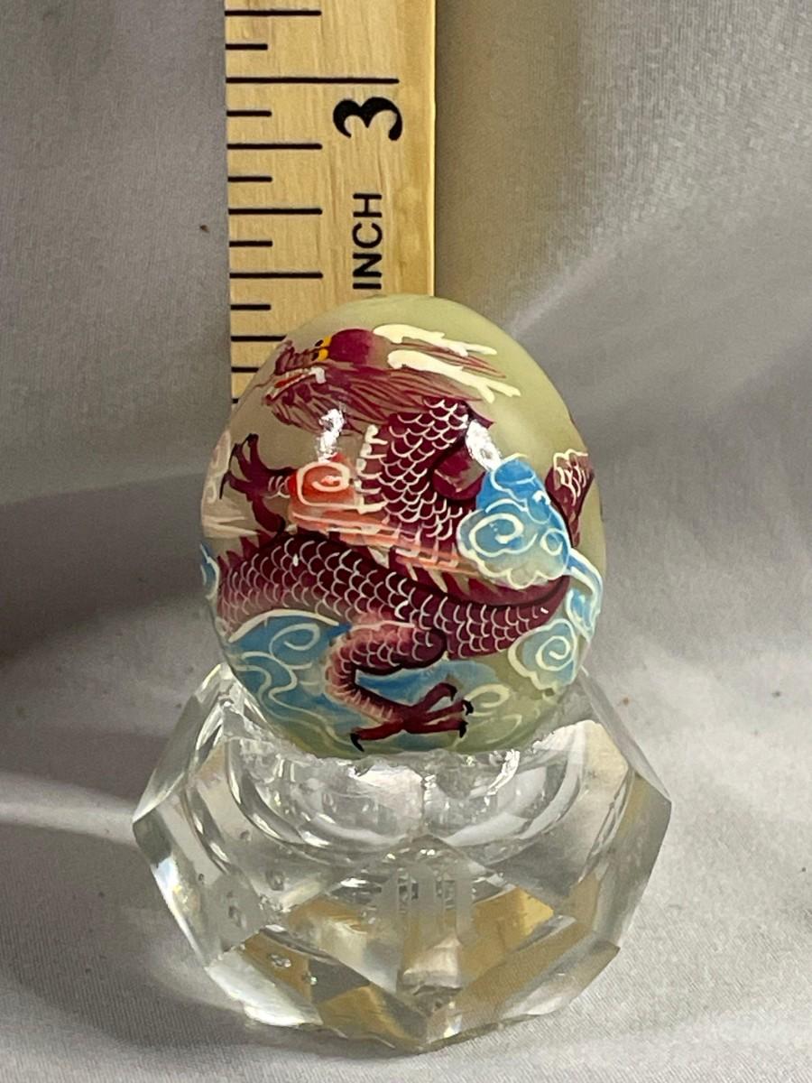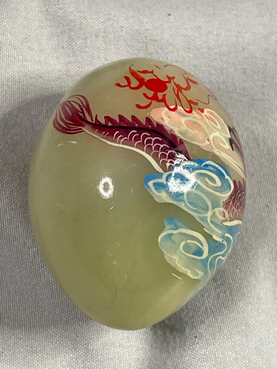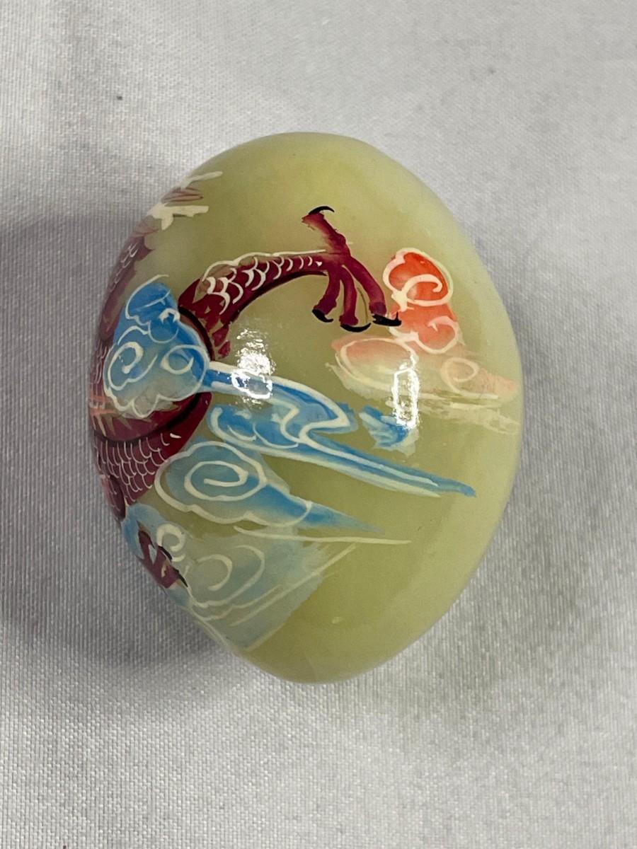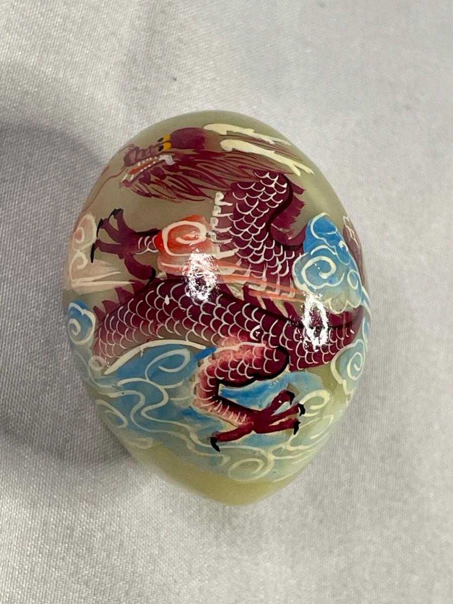 Similar to Lots 98 and 102, this egg has a hand painted scene of a Chinese dragon painted on it. There were not issues noted and the stone egg has the look of jade.<br />