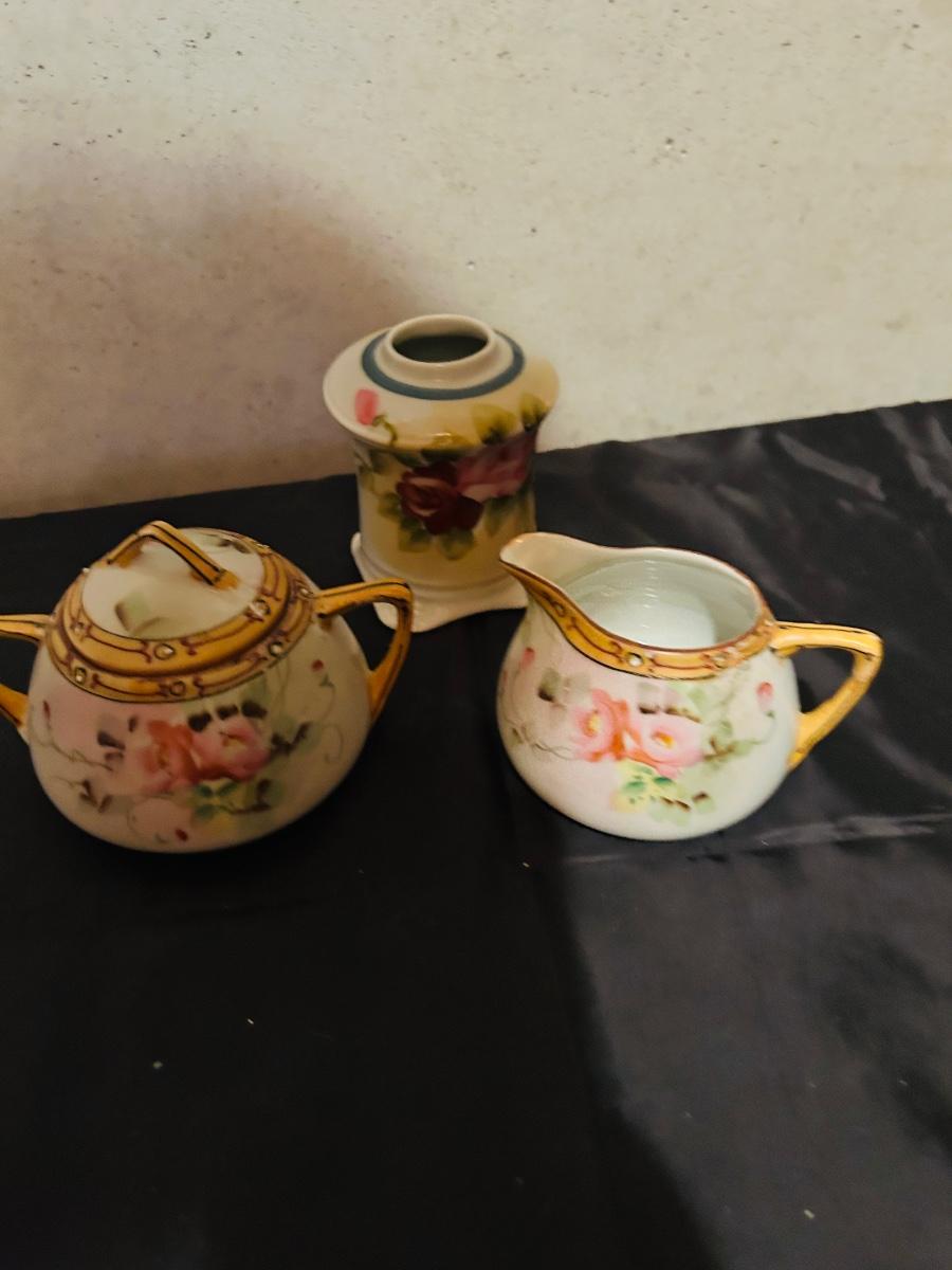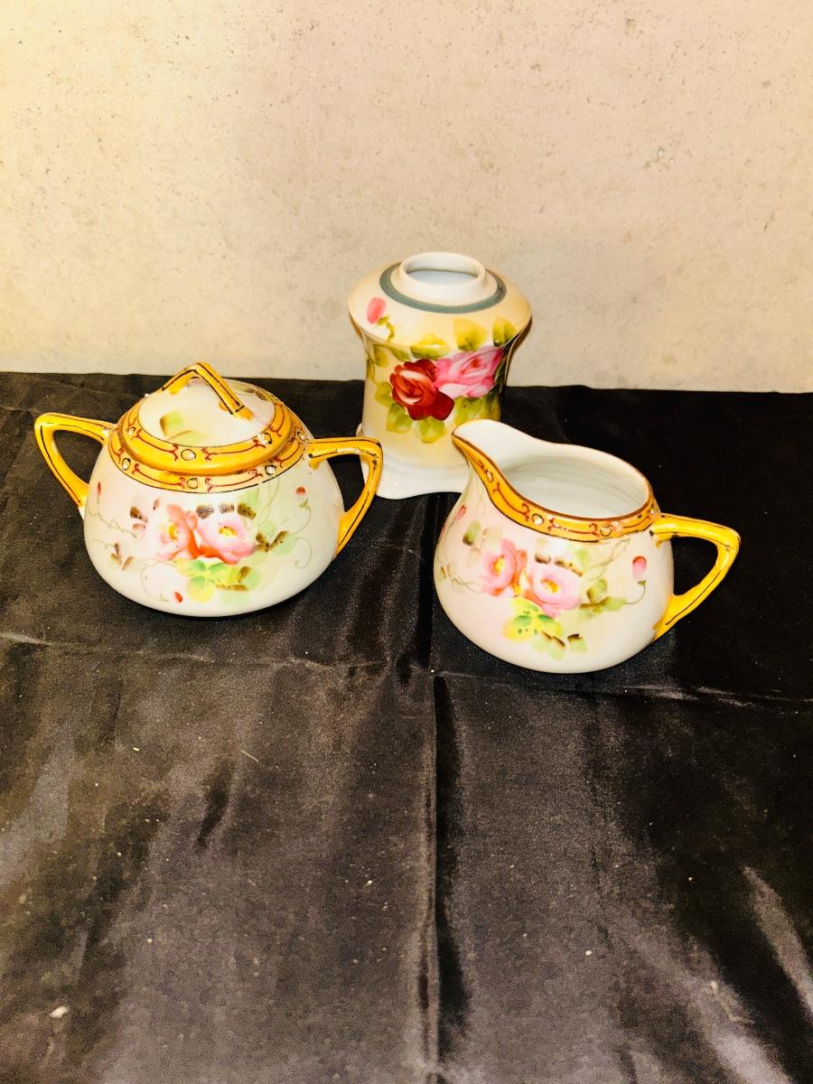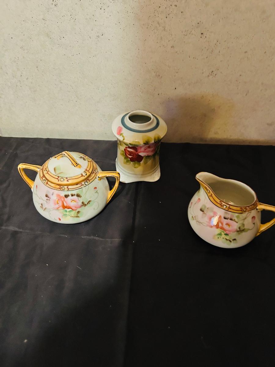 HAND PAINTED CREAMER AND SUGAR CONTAINERS AND BUD VASE