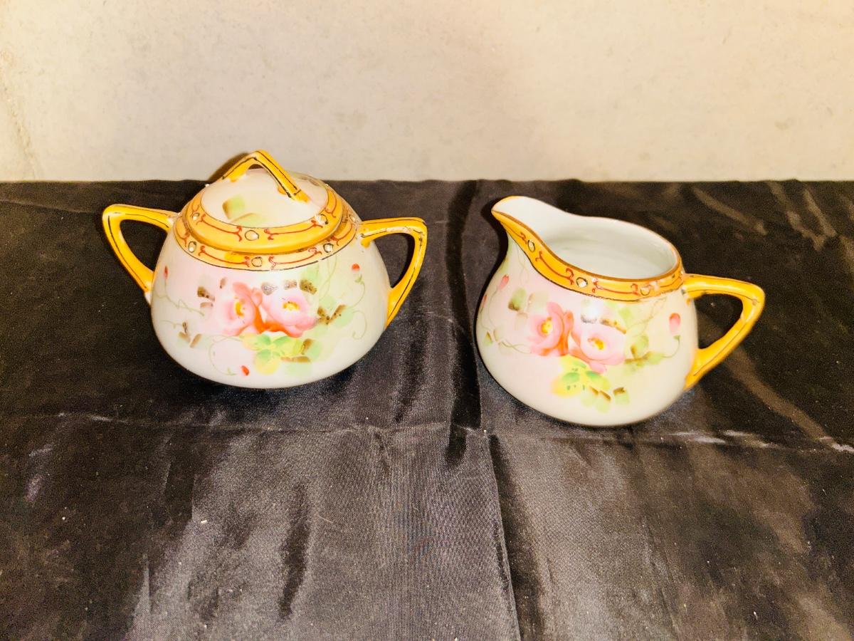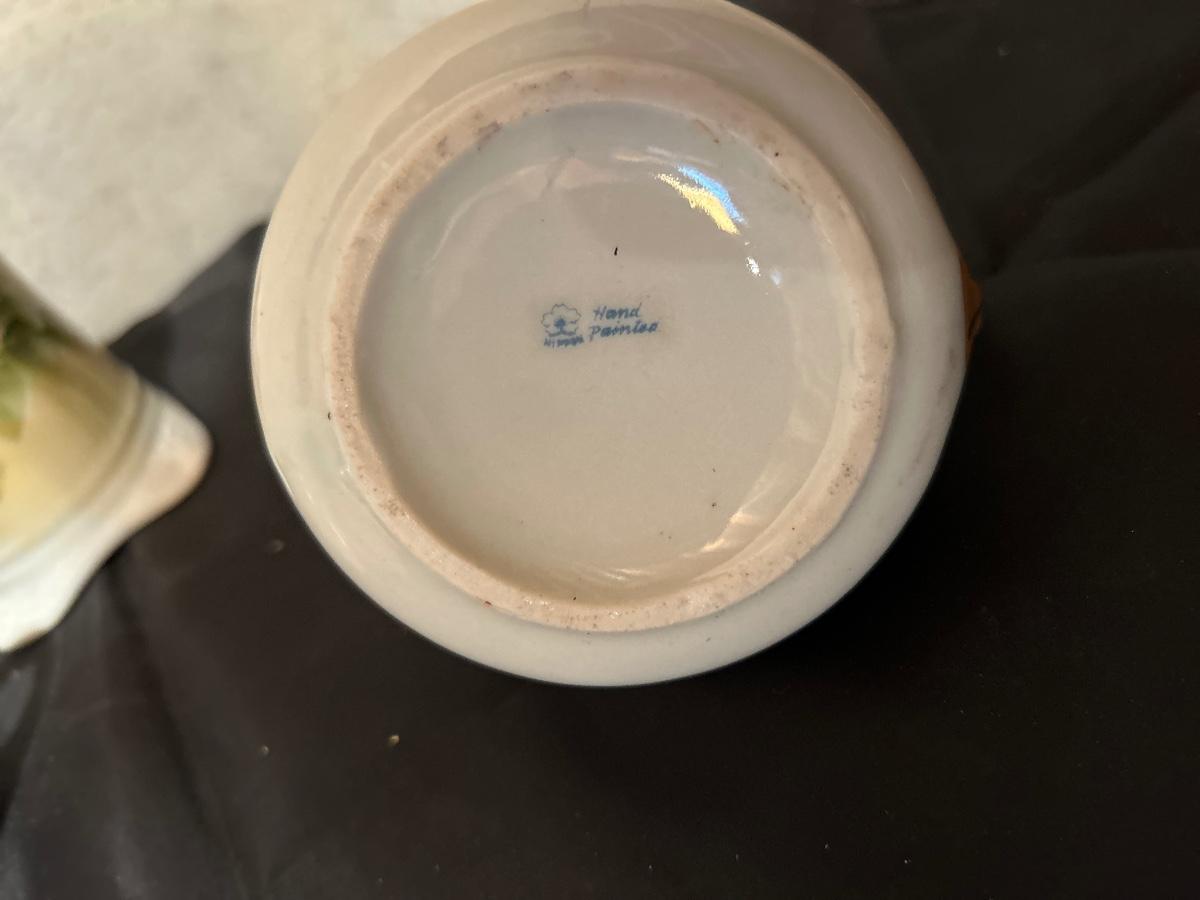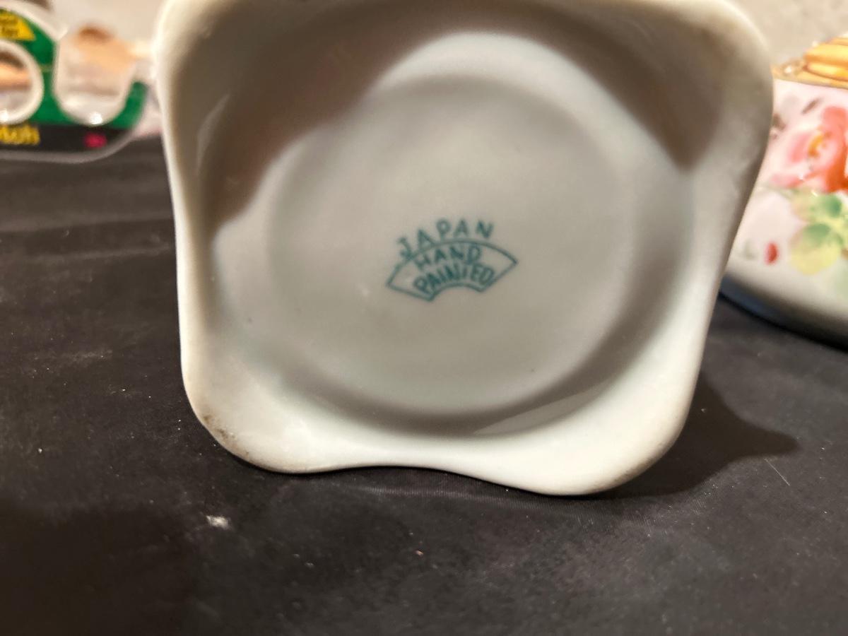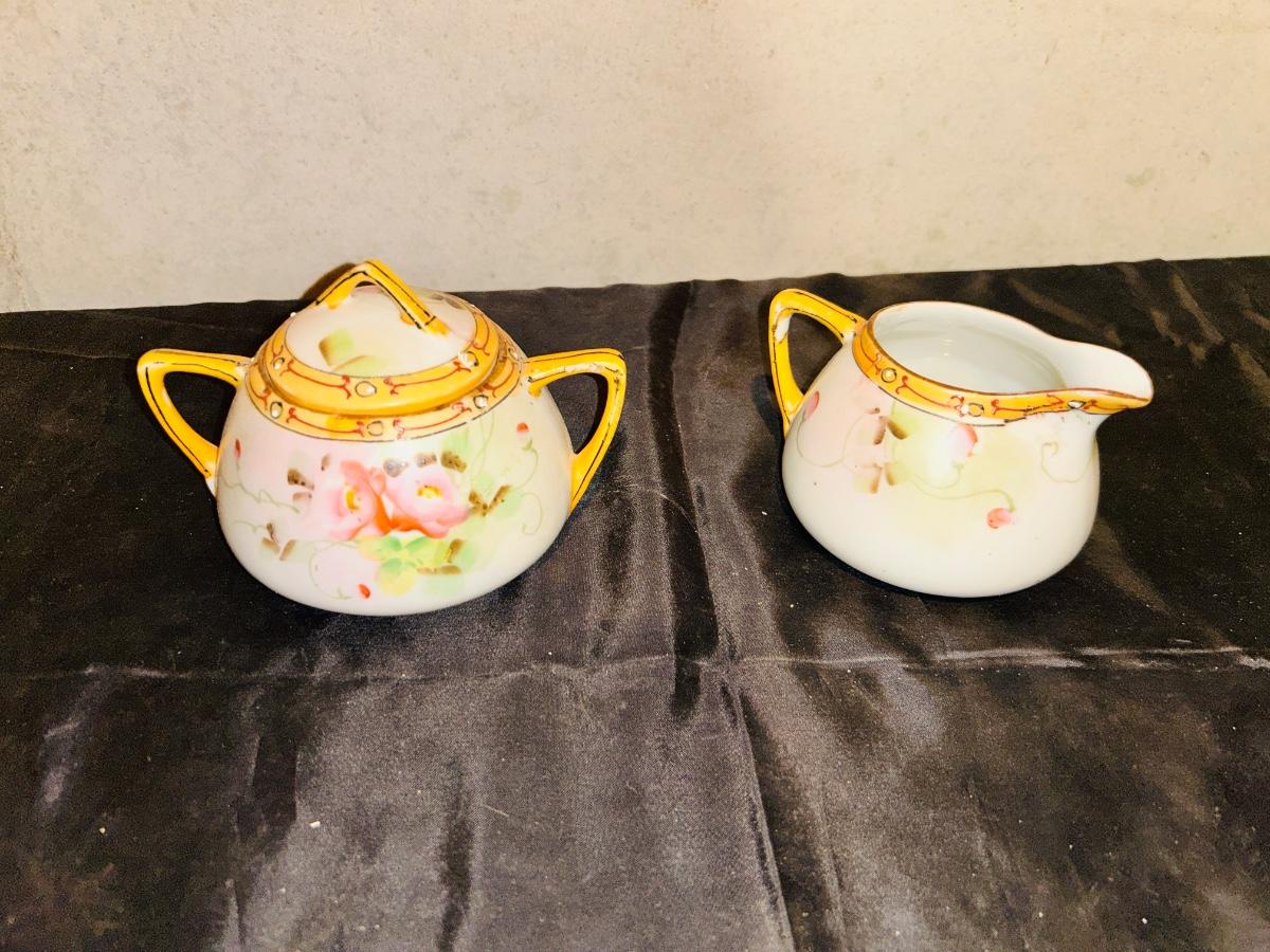 HAND PAINTED CREAMER AND SUGAR CONTAINERS AND BUD VASE