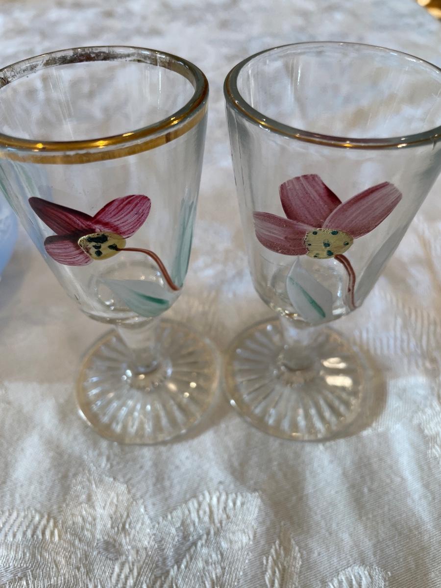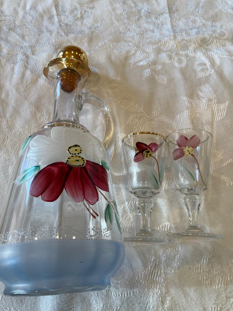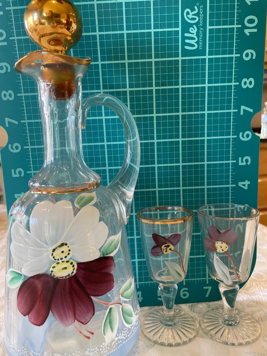 Hand painted decanter and 2 glasses