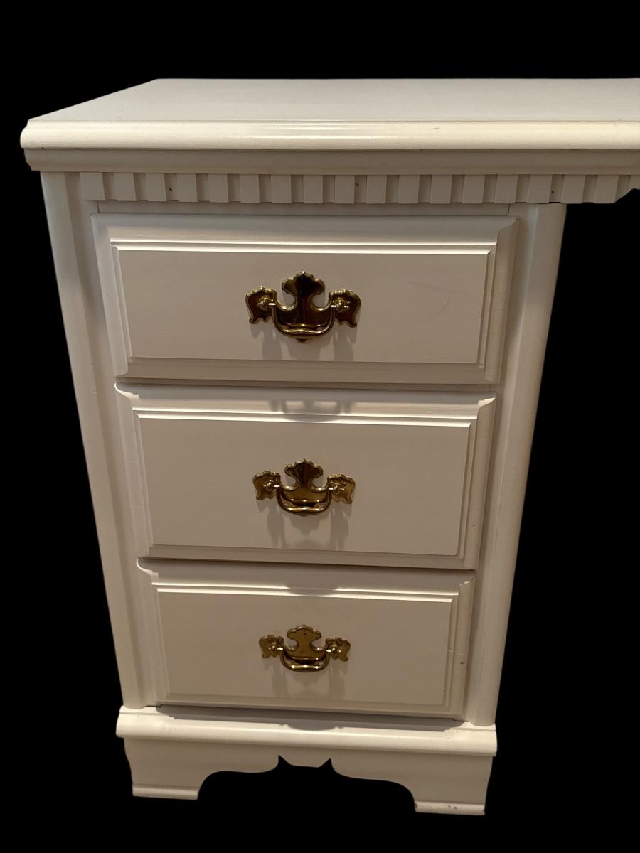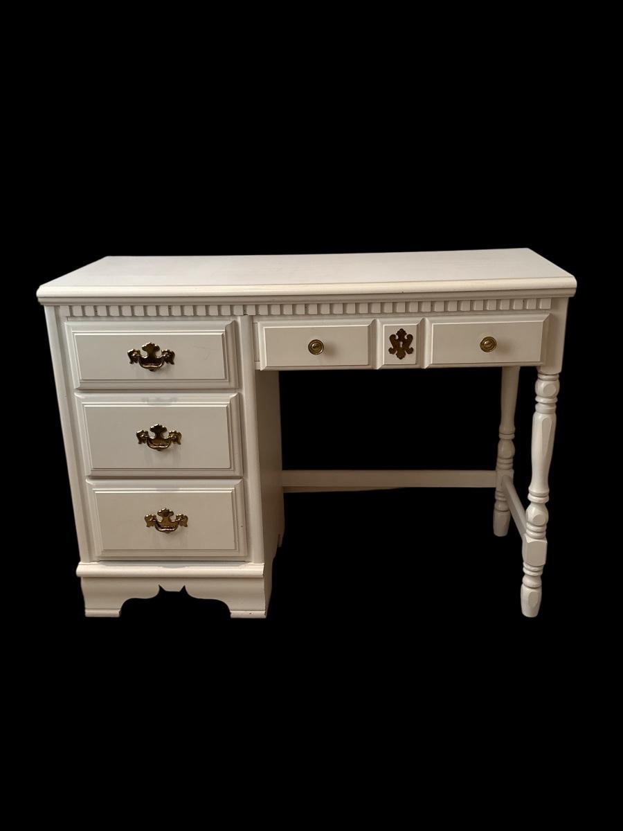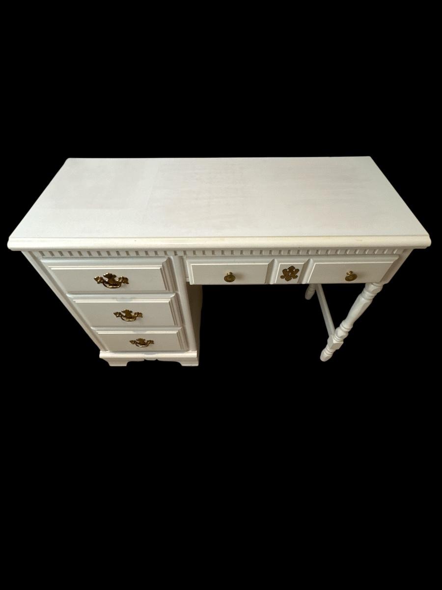 Charming hand-painted white desk featuring classic Colonial-style details and solid construction. Includes three spacious side drawers with polished brass bail pulls and two small center drawers with round brass knobs. Decorative dentil molding along the top and a turned leg on the right add a touch of traditional elegance. A versatile piece ideal for a bedroom, office, or vanity setup.