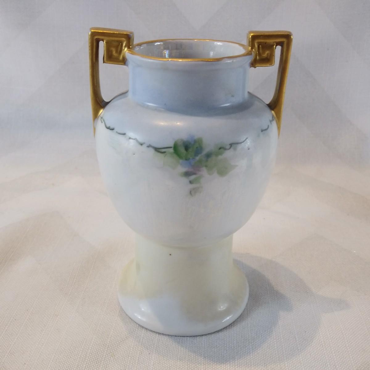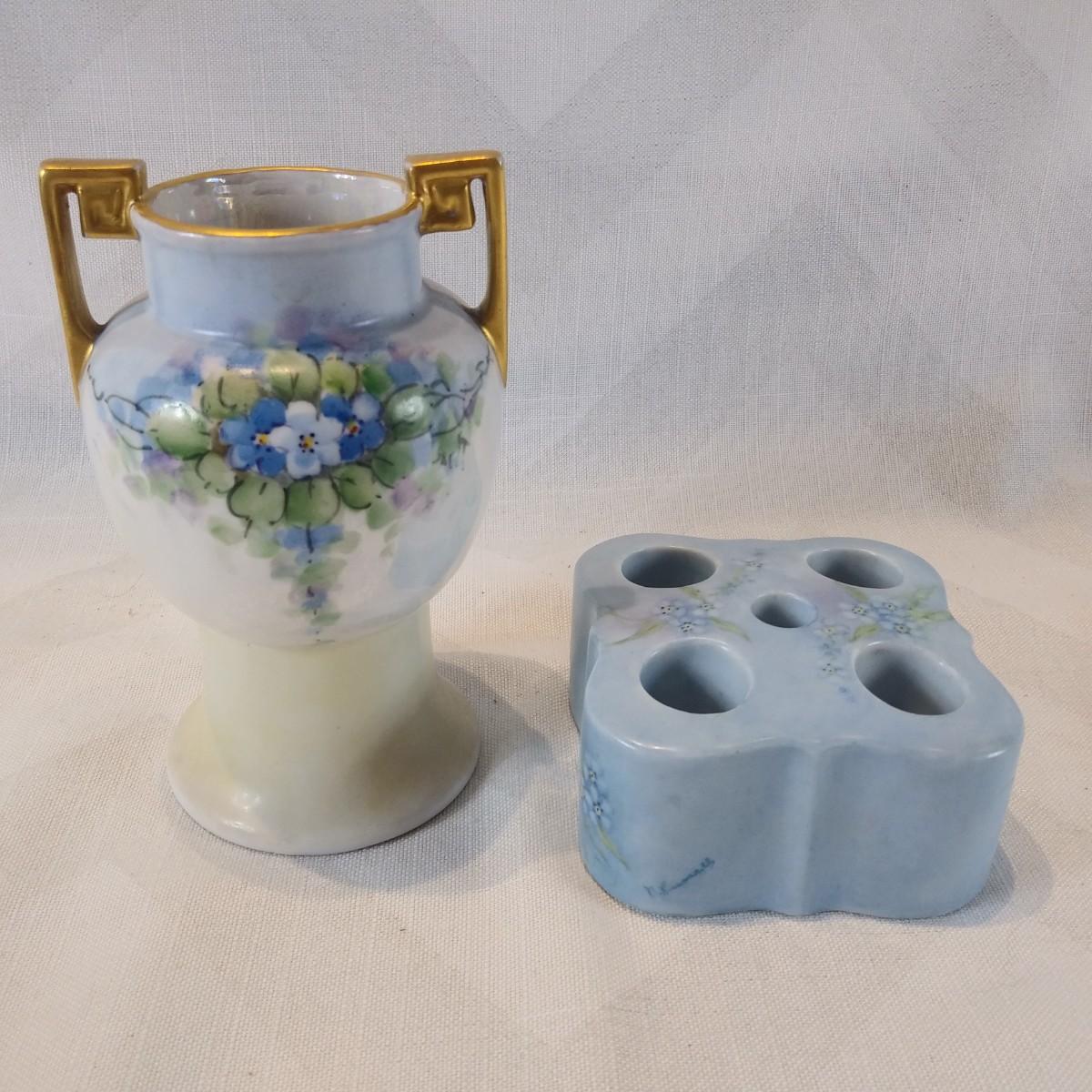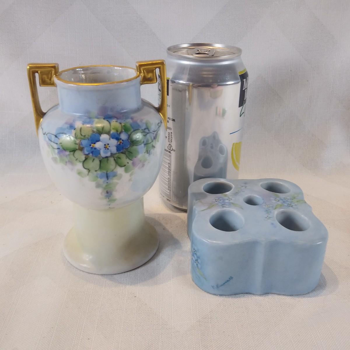 This auction lot if for a Hand-Painted Duo. The set includes a wonderful and useful lipstick and make-up brush holder (signed by artist) and a beautiful urn style vase. Both items are in great condition.