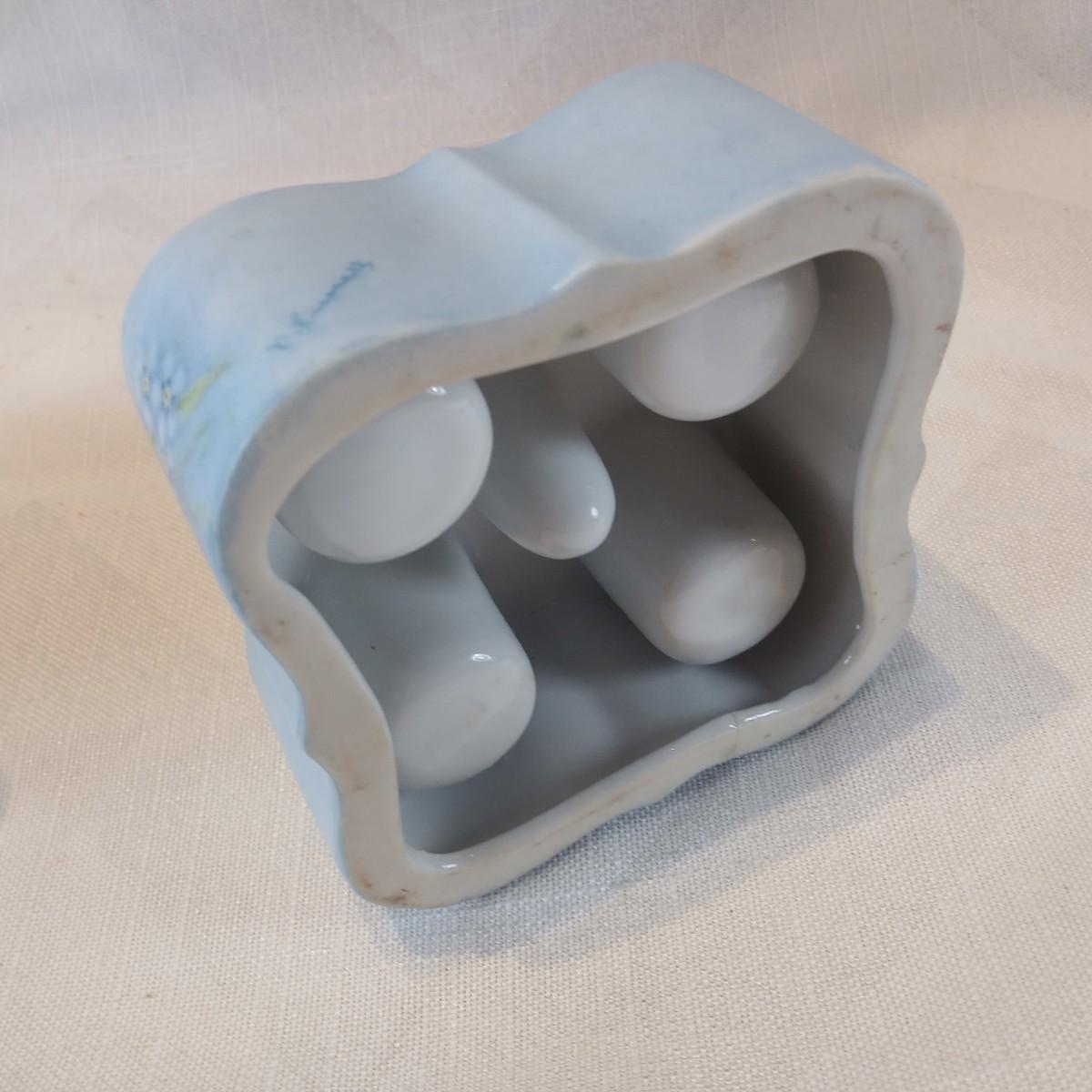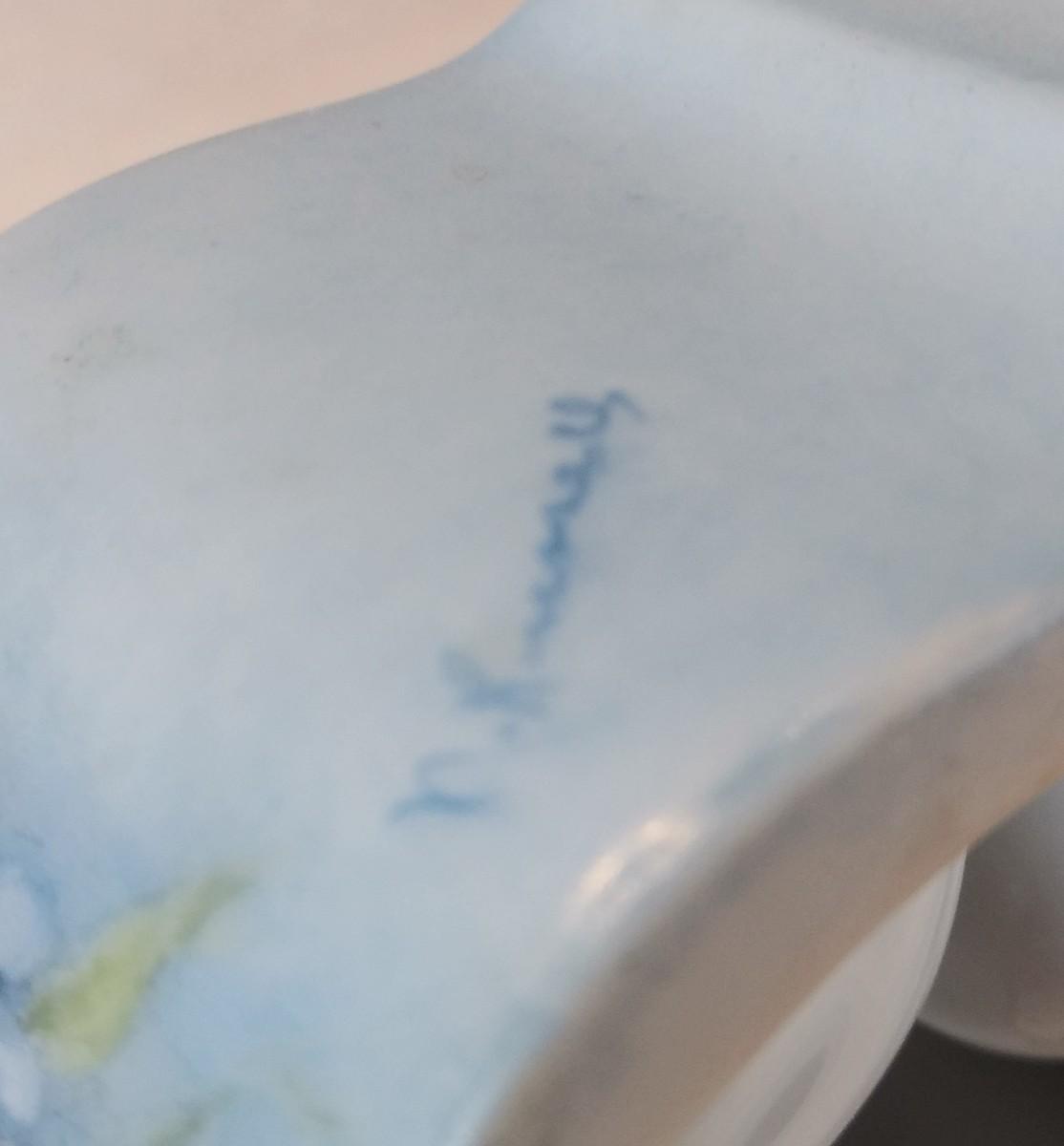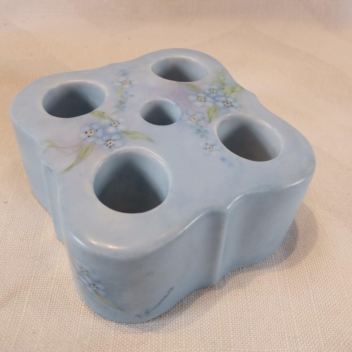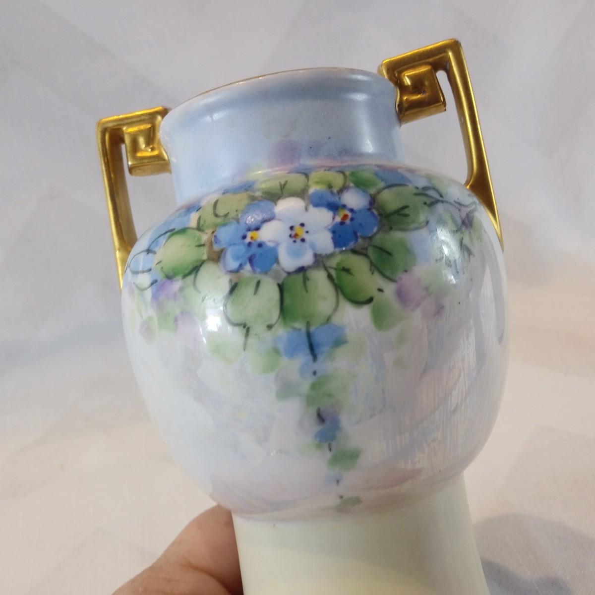 This auction lot if for a Hand-Painted Duo. The set includes a wonderful and useful lipstick and make-up brush holder (signed by artist) and a beautiful urn style vase. Both items are in great condition.