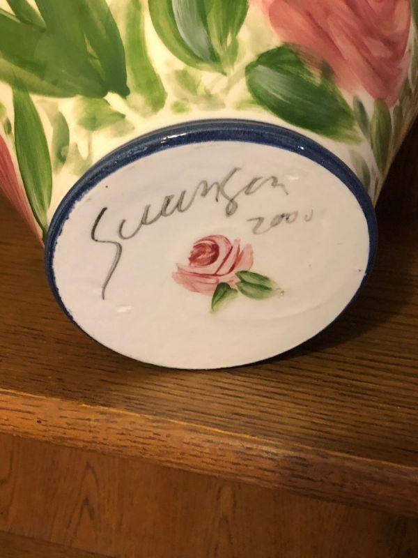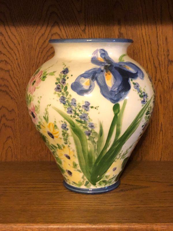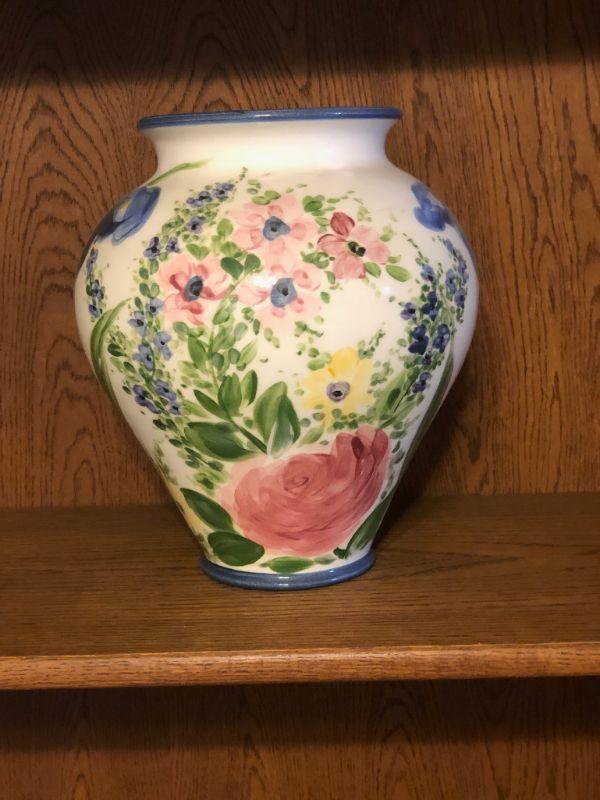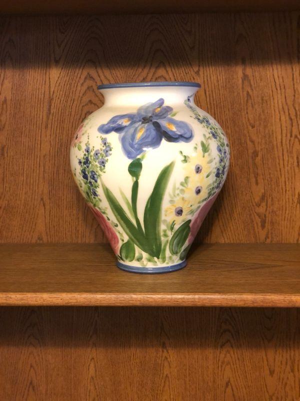 Beautiful hand painted vase. Adorn with colorful flowers. Signed on the bottom. Good Condition. Under 12".