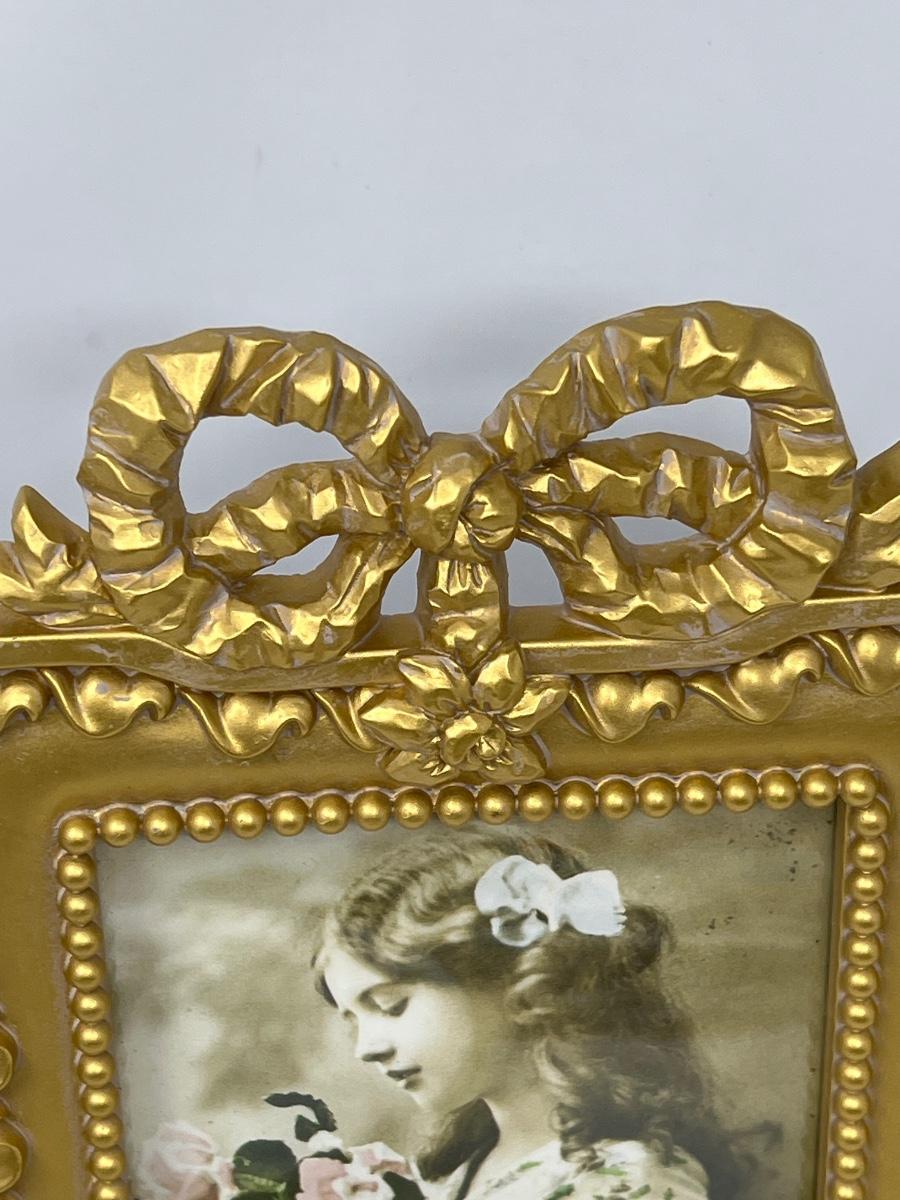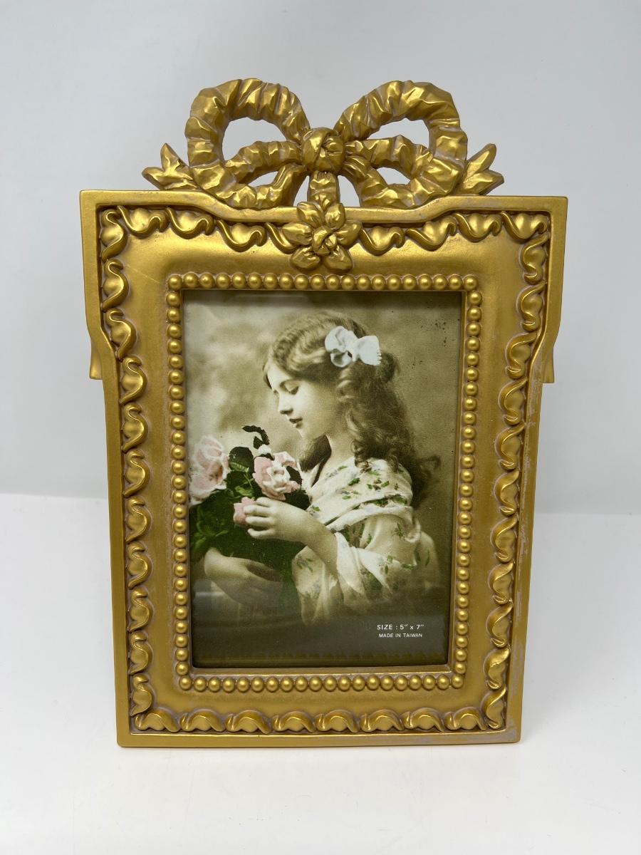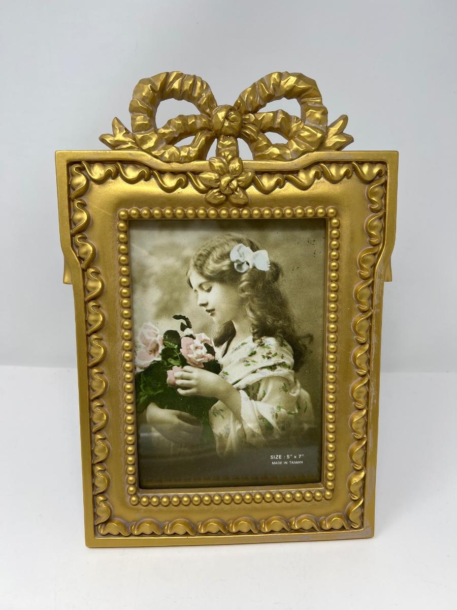 Vintage Victorian style gold gild photo frame with large bow decoration at top. Made of a composite wood. 11” tall by 8” wide and holds 5” x 7” photo.