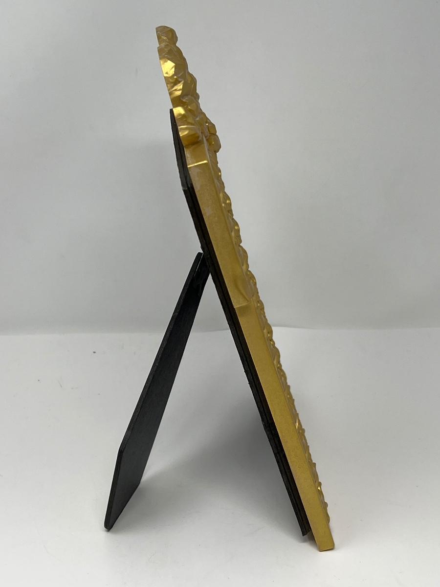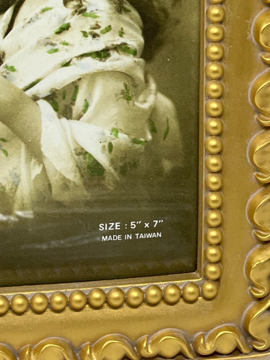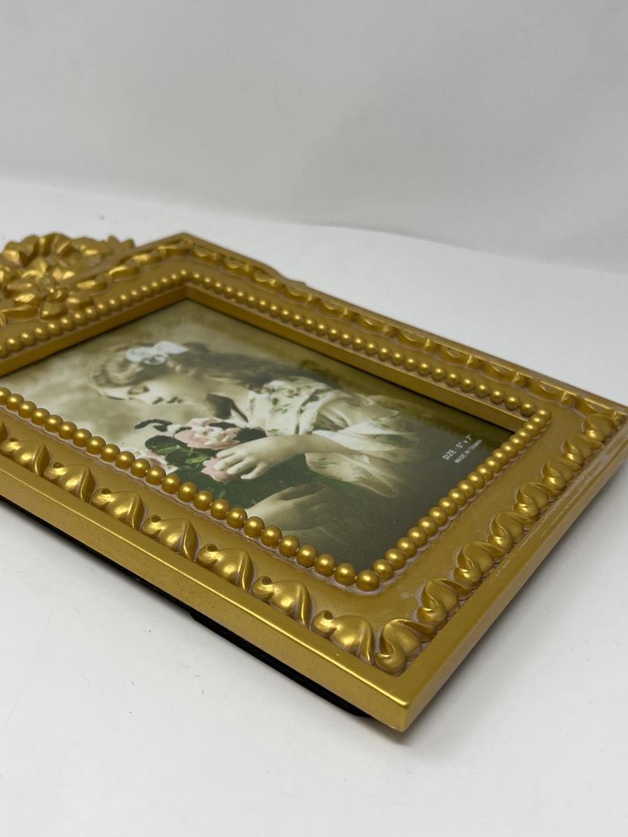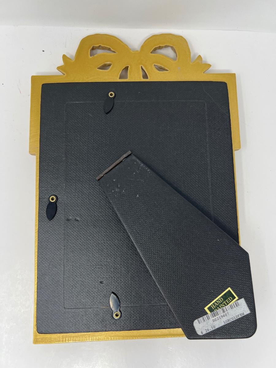 Vintage Victorian style gold gild photo frame with large bow decoration at top. Made of a composite wood. 11” tall by 8” wide and holds 5” x 7” photo.