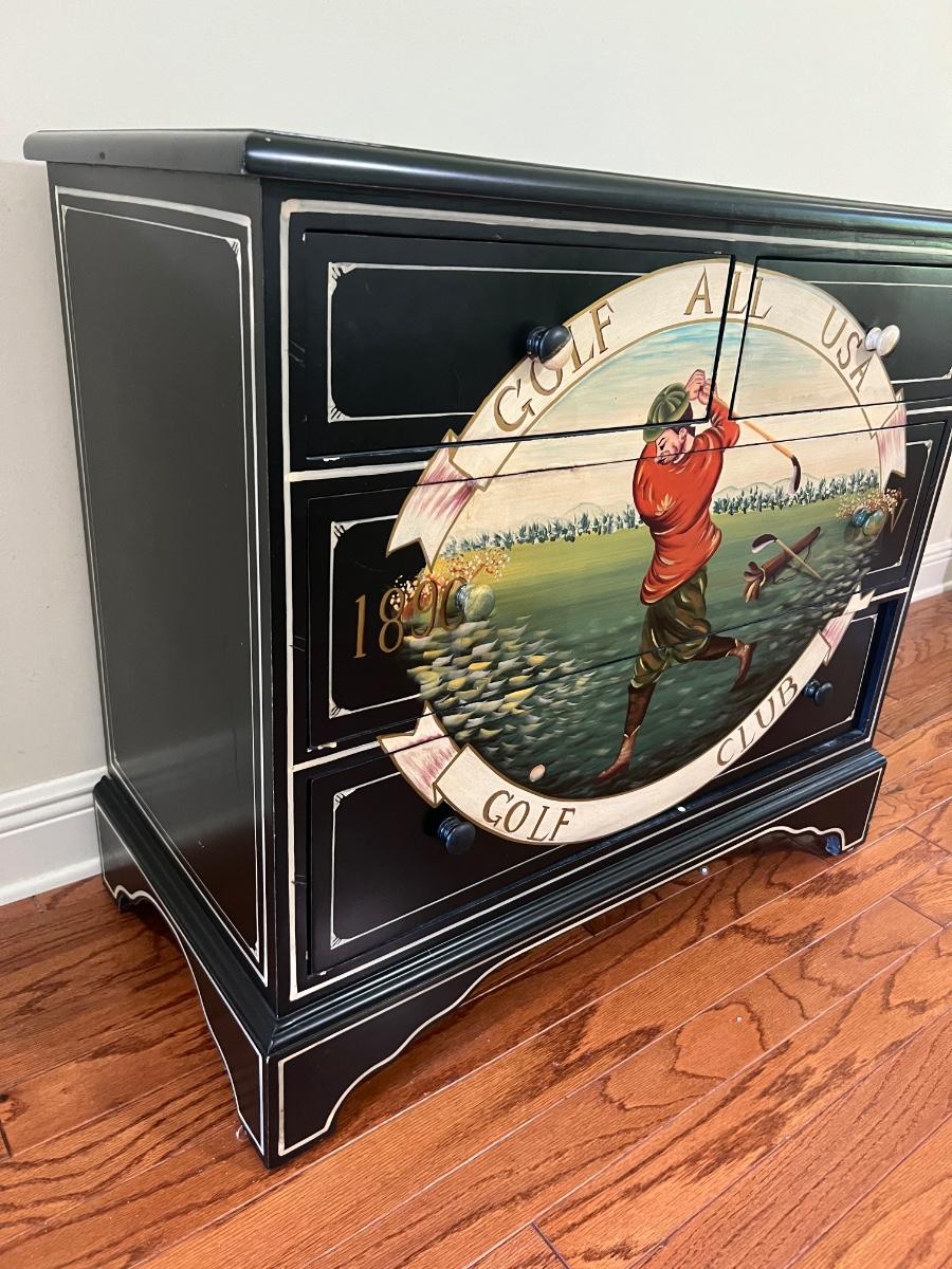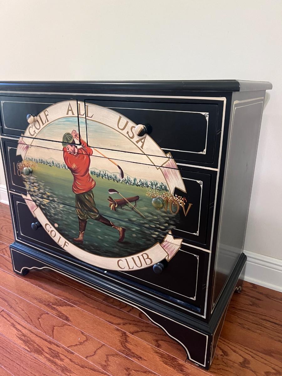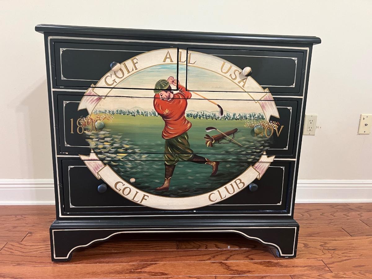 Hand Painted Golf Chest Of Drawers With 4 drawers. Solid wood. Top two drawers are lined in velvet. Measures 33 inches tall, 36 inches wide and 18 inches deep.