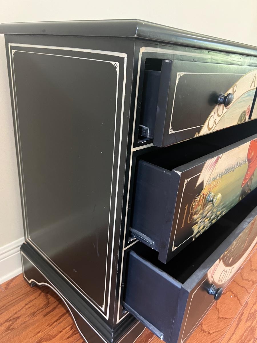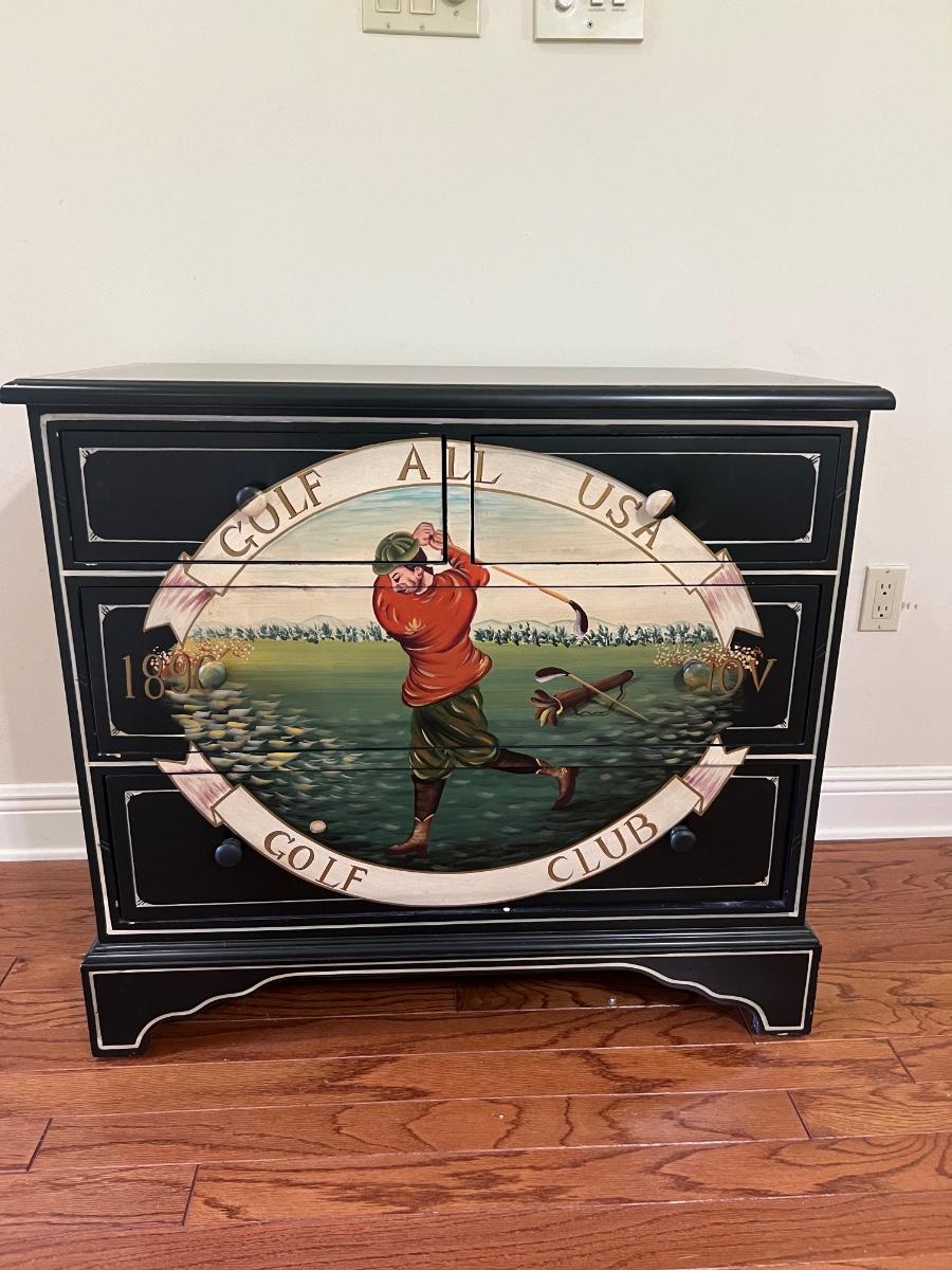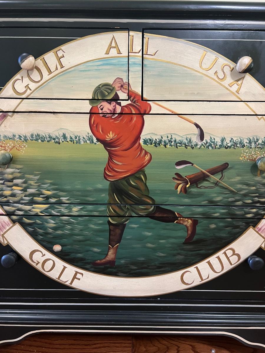 Hand Painted Golf Chest Of Drawers With 4 drawers. Solid wood. Top two drawers are lined in velvet. Measures 33 inches tall, 36 inches wide and 18 inches deep.