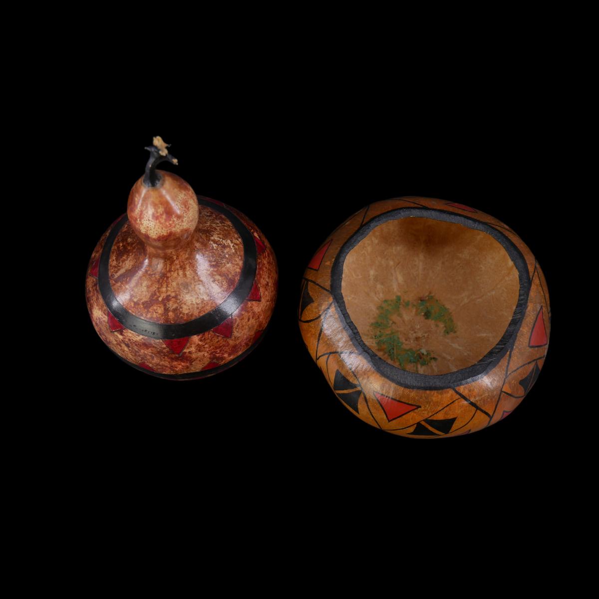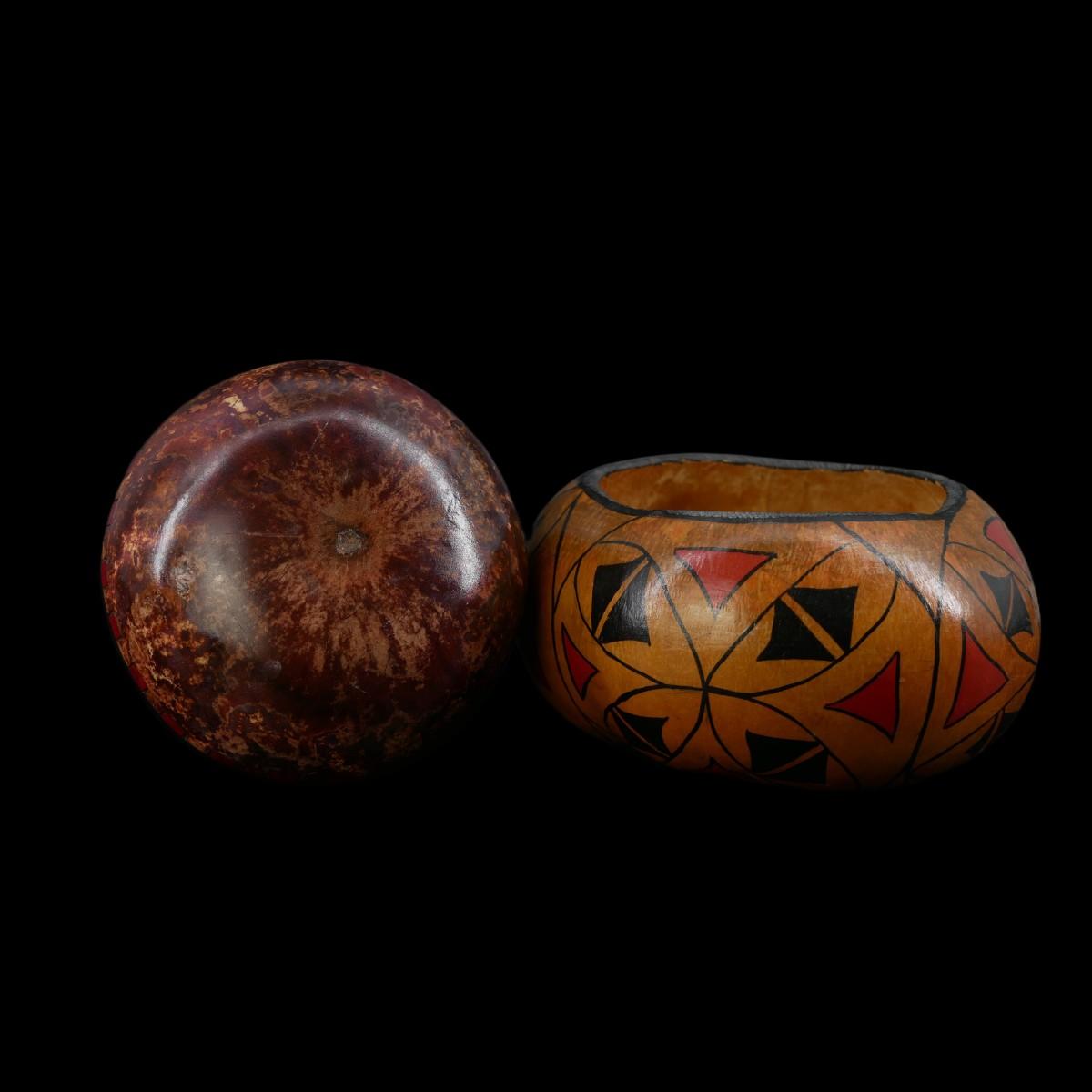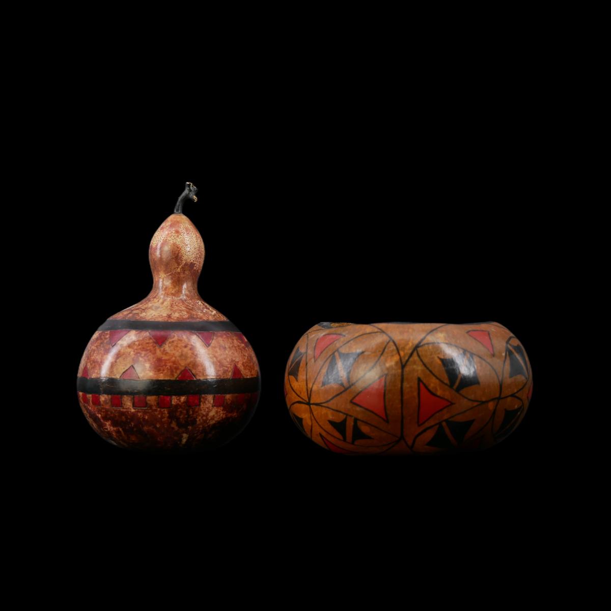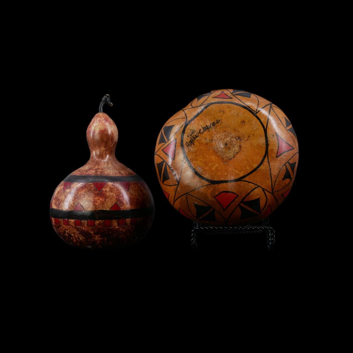 Handmade and hand-painted gourd art. Black and red designed piece, unsigned measures L 5.5" x H 8". Black and red designed hollowed out bowl gourd piece signed "Anita Chavez" on bottom measures L 7" x H 3.5". Lot weighs 5 oz. (C33)