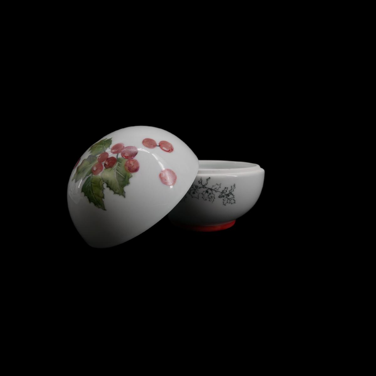 Hand painted holly berry holiday ceramic sphere jar, signed by artist. Excellent condition! Measures L 4.5" x H 4.5" x W 4.5". Weighs 14 oz. (D44)