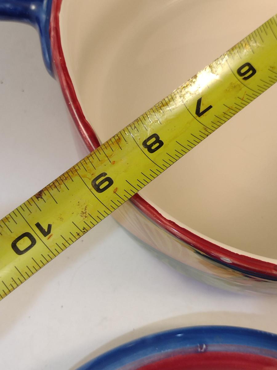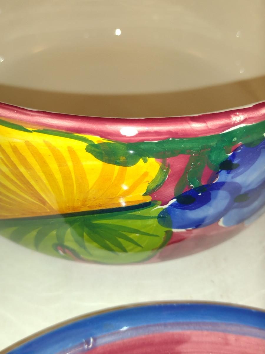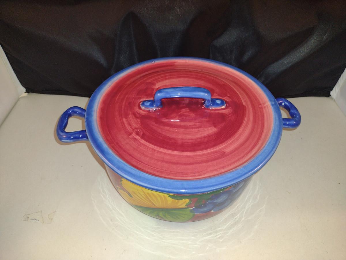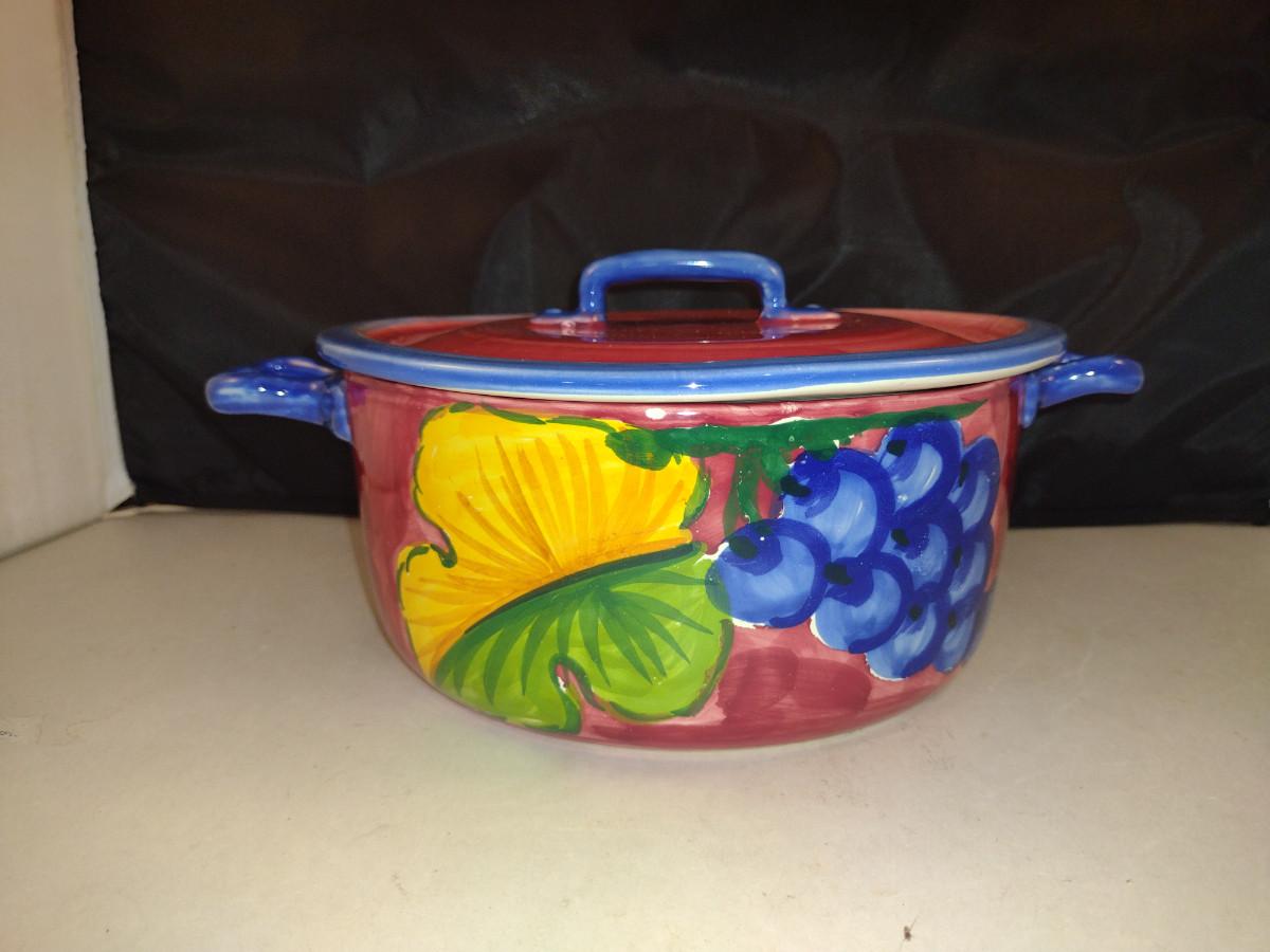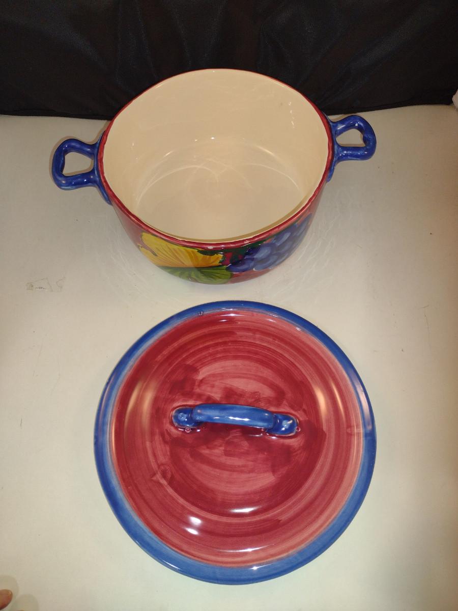Hand Painted Italian Vegetable Bowl with Lid- Approx 8 3/4" in Diameter. Item is in used condition and has some chipping- please see all pictures.