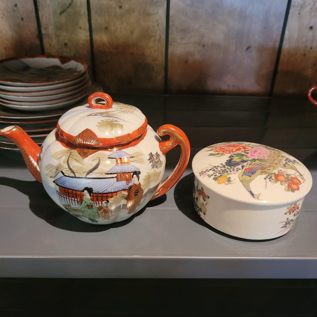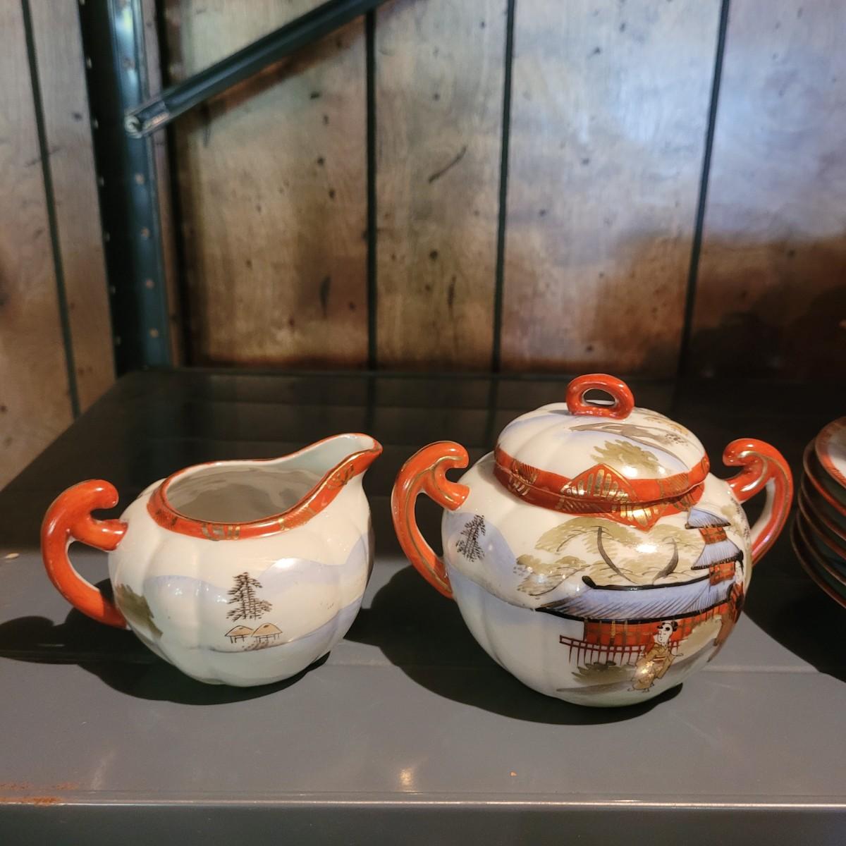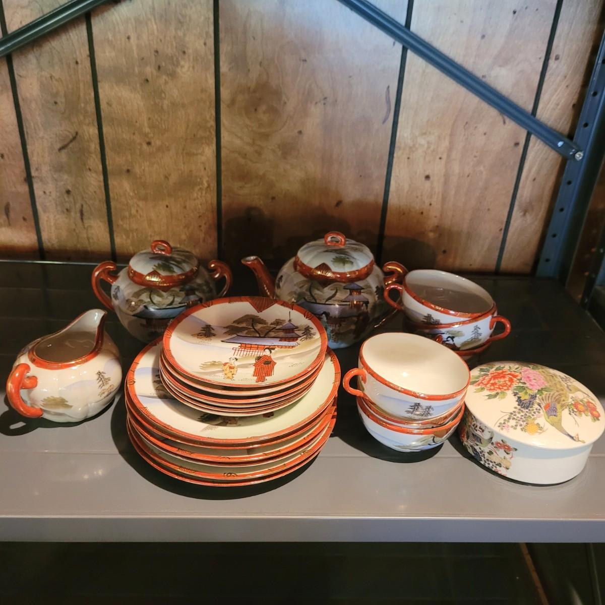 Lot includes a 22 piece set of Japanese hand painted tea set items, including cups and saucers, plates, tea pot, sugar and creamer jars and an additional lidded jar from Andrea by Sadek. The 22 piece count is approximate and does not take into account separate lids. Shipping available.