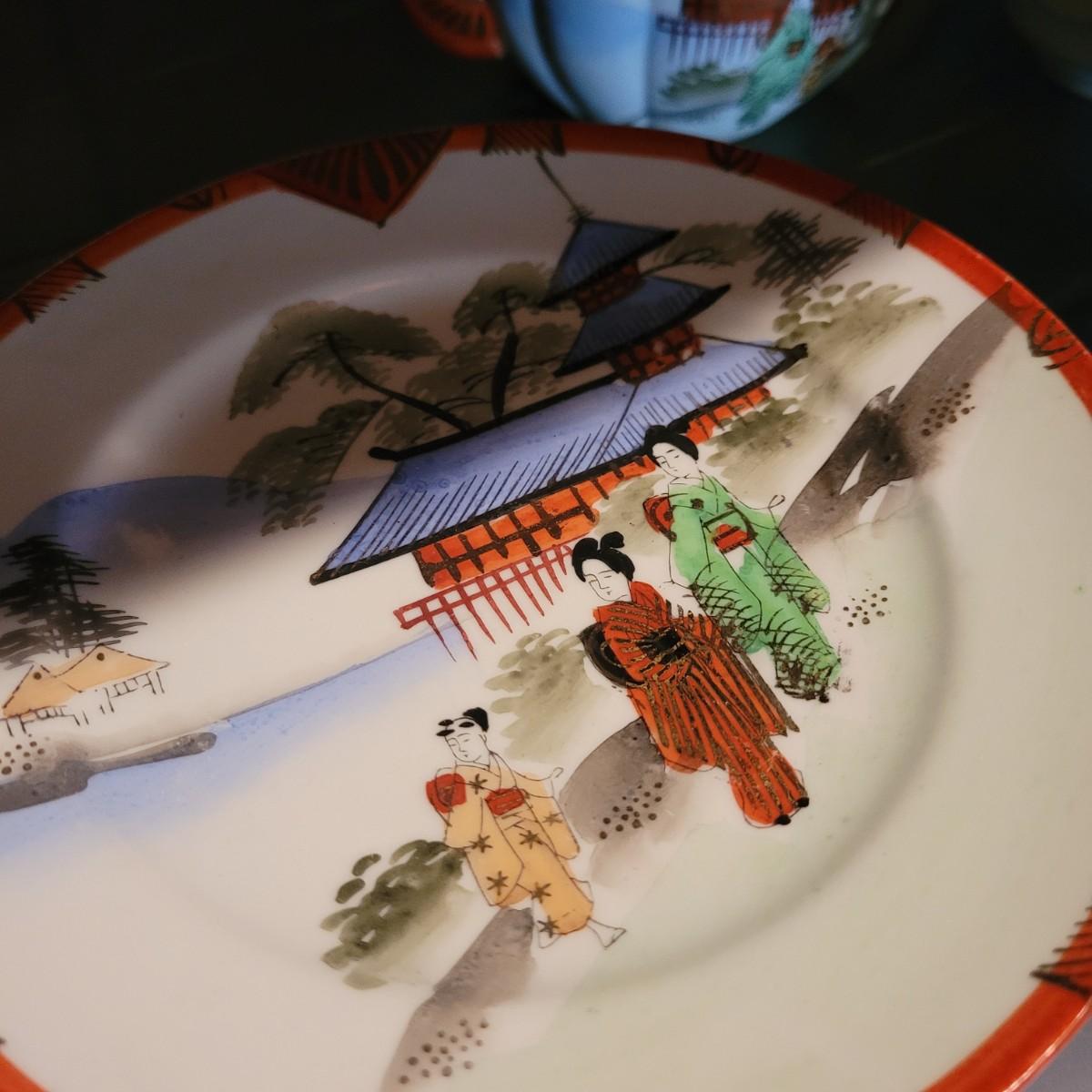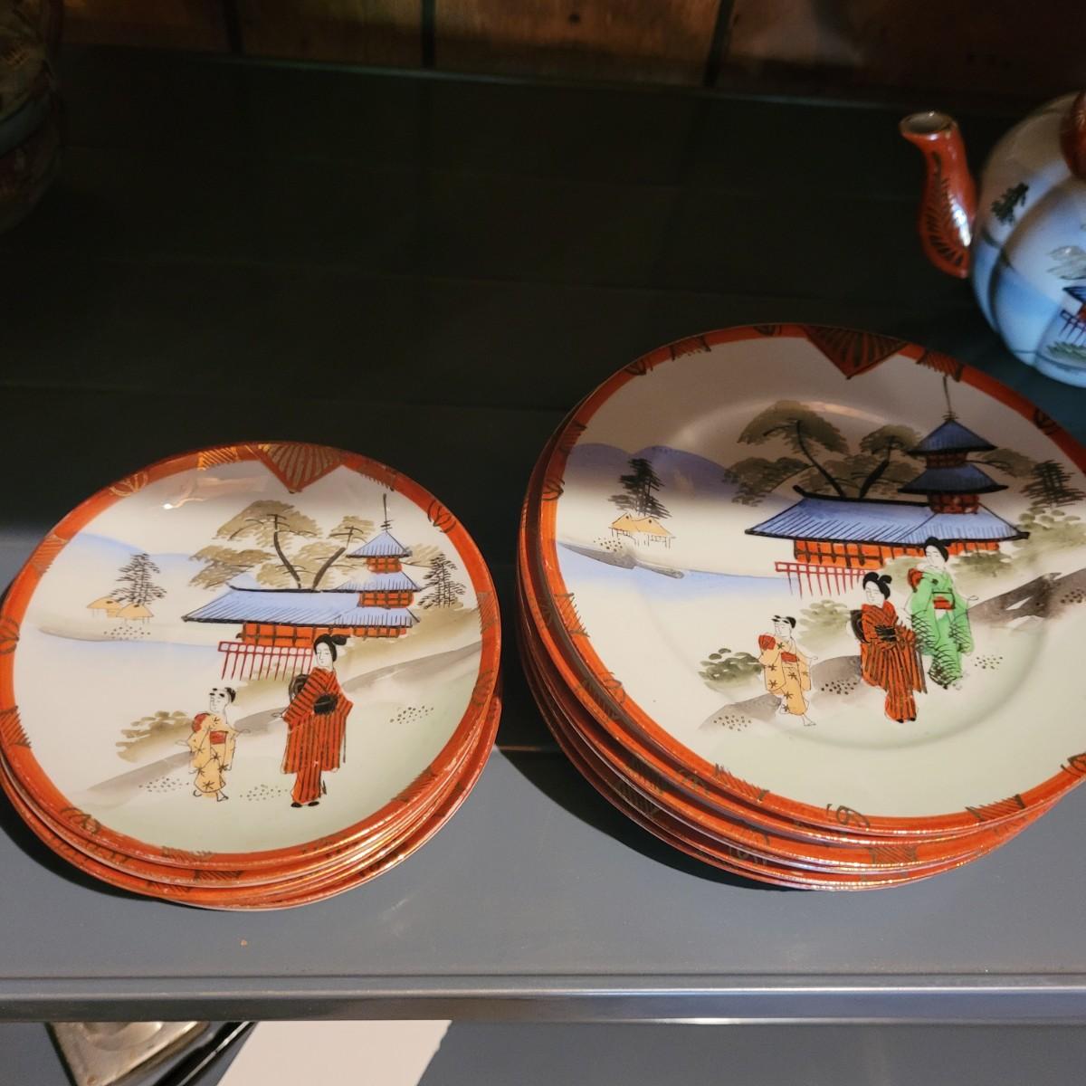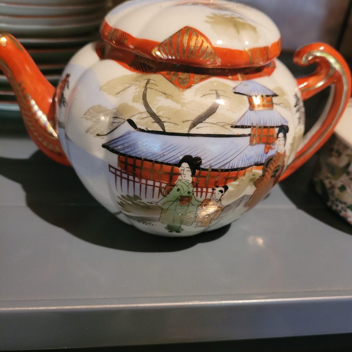 Lot includes a 22 piece set of Japanese hand painted tea set items, including cups and saucers, plates, tea pot, sugar and creamer jars and an additional lidded jar from Andrea by Sadek. The 22 piece count is approximate and does not take into account separate lids. Shipping available.