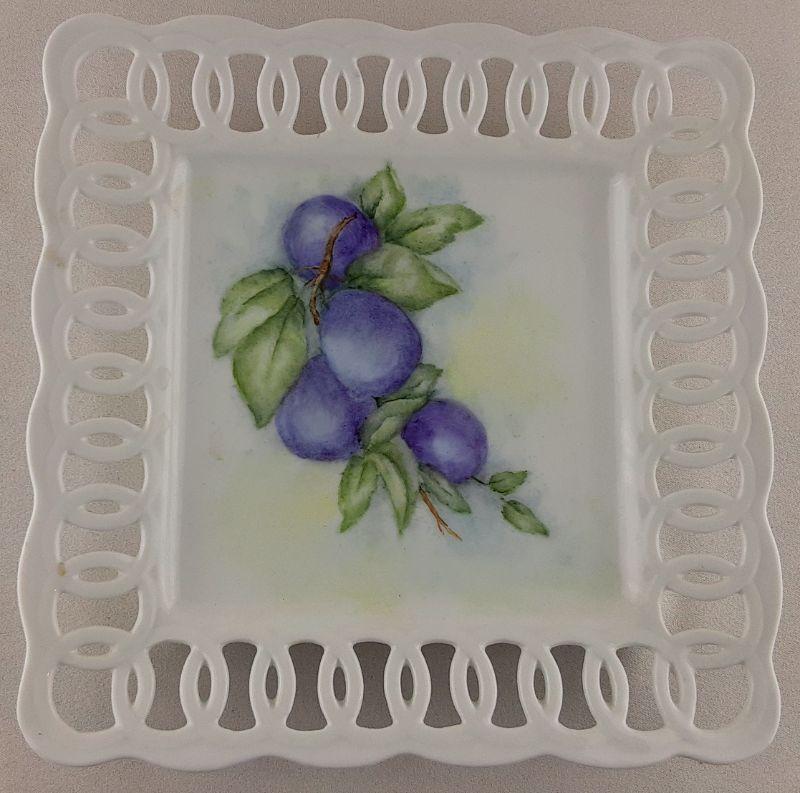 Quality porcelain plate with hand painted fruit. Measures 8x8