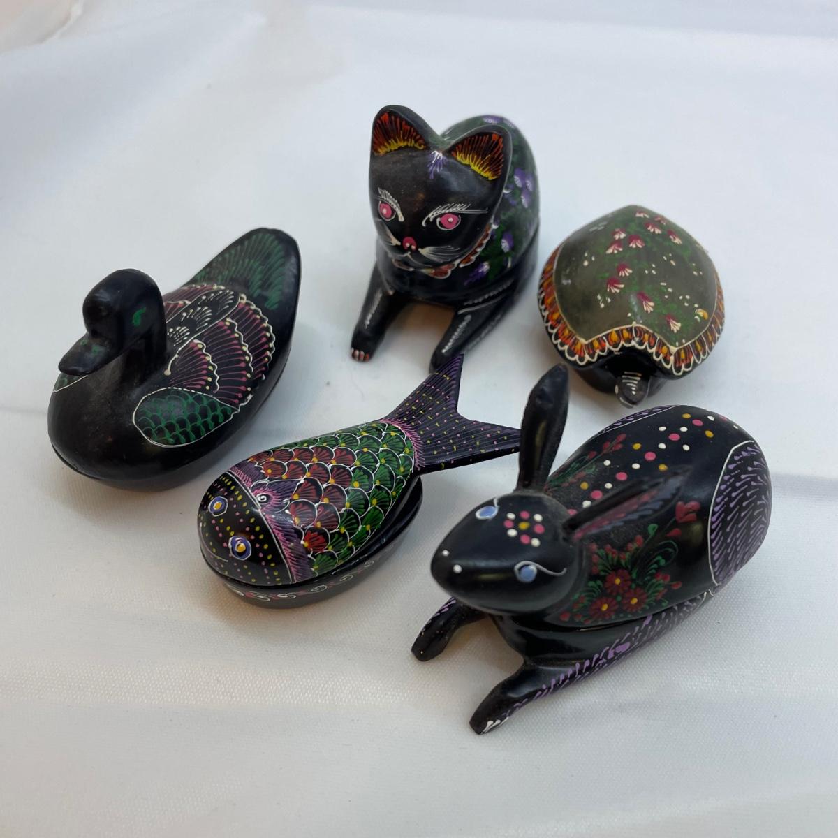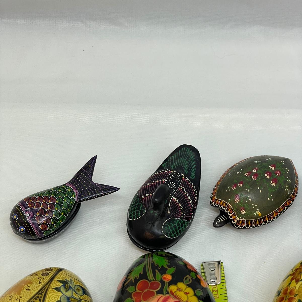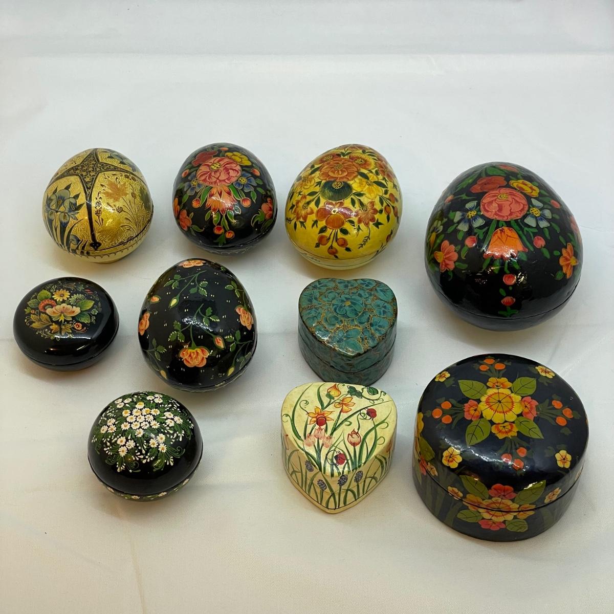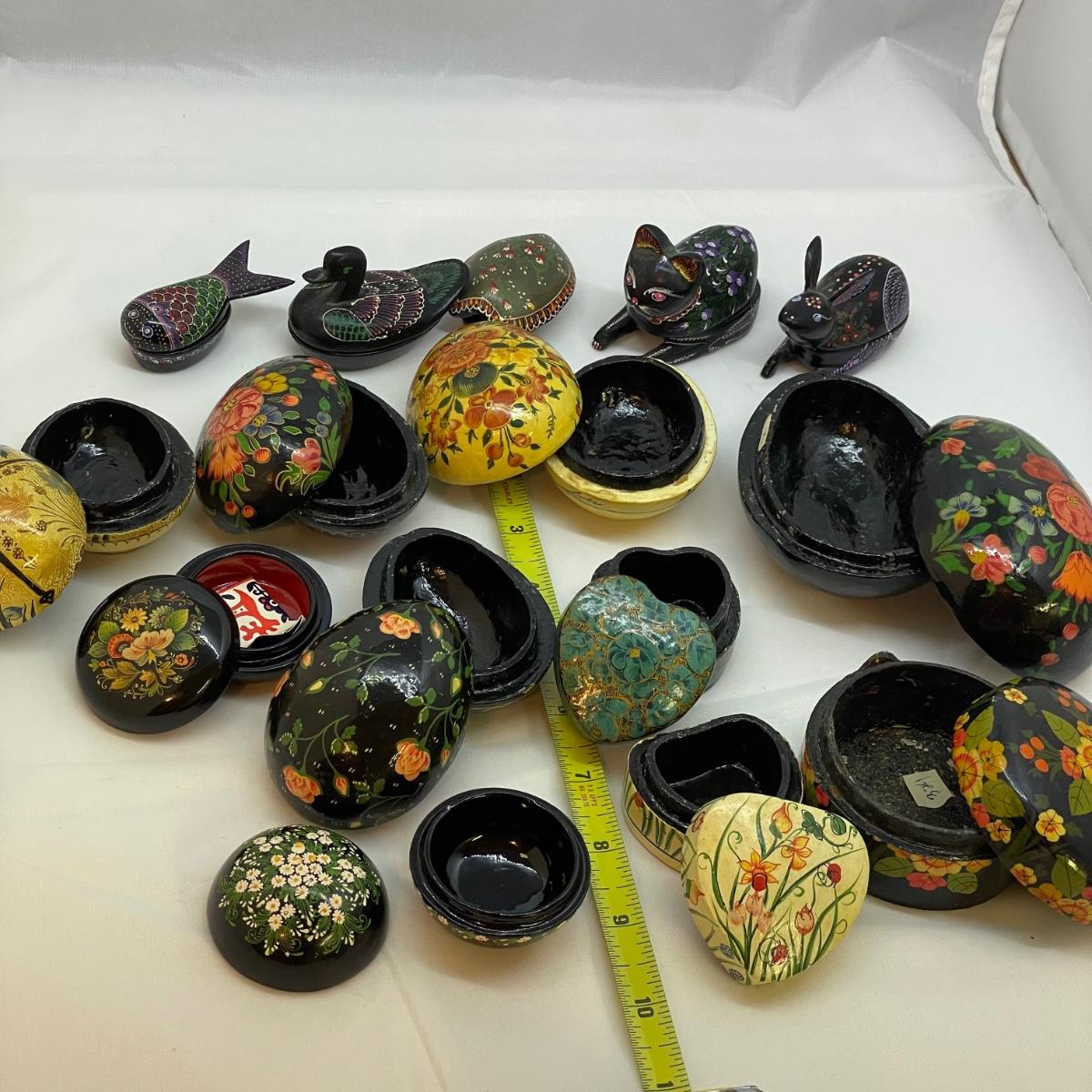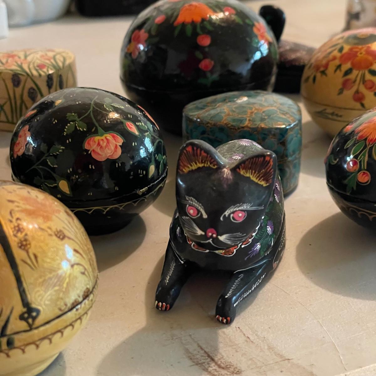Bold and dark collection of trinket boxes include lacquered animal trinket boxes from Thailand, wood or paper mâché eggs and hearts from India, and an intricately painted wooden box from the USSR. The cat measures 3” x 1.5” x 2”H, the largest black egg measures 4.25” x 3” x 2.5”. See images. Shipping available.