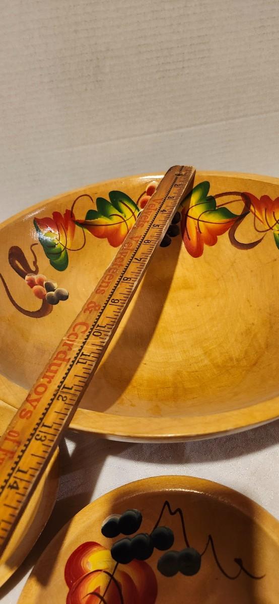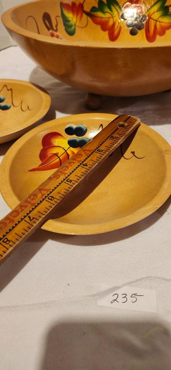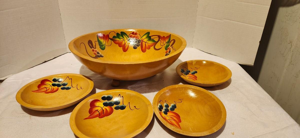 Hand Painted large Salad Bowl, and 4 Smaller Bowls all Made of Solid Wood.